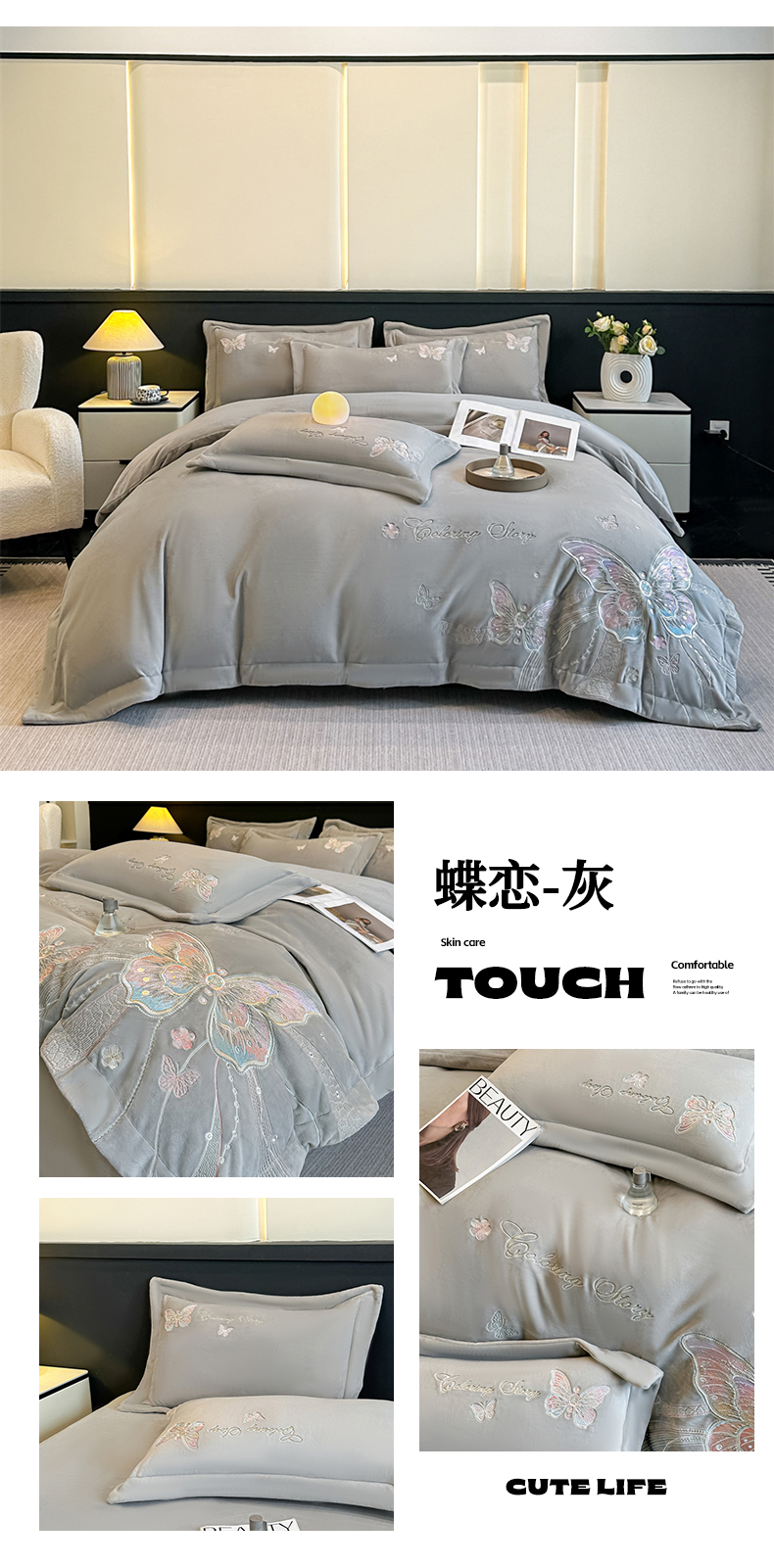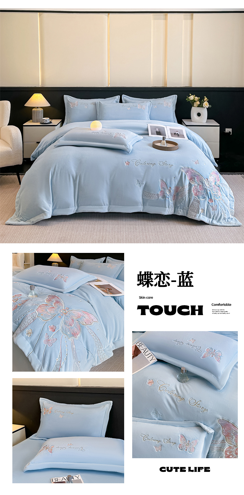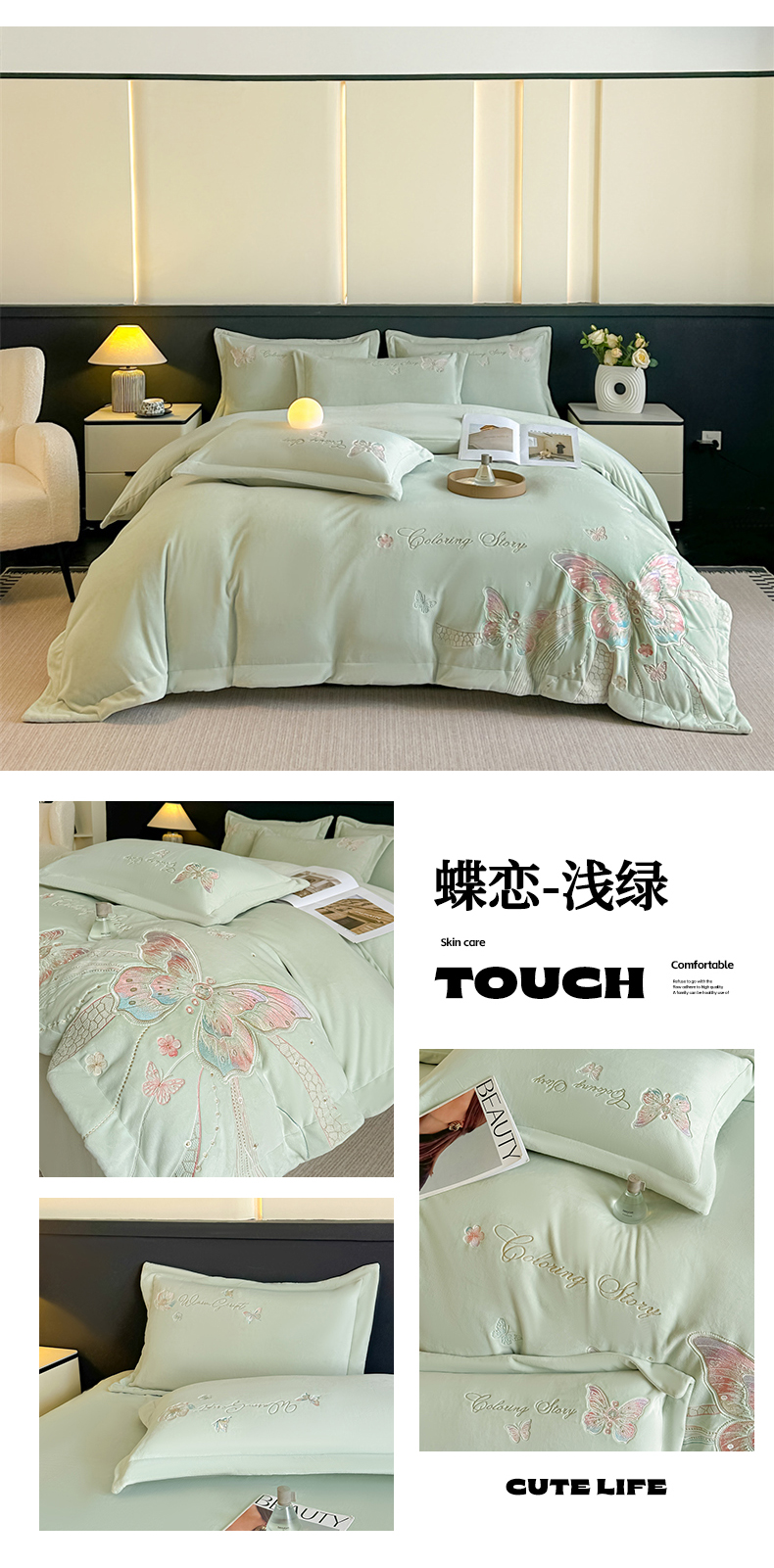 (总)锦铭源家纺 2025新款75D全消光超柔樱花绒绣花四件套牛奶绒四件套【有买家秀】,花颜-浅绿,花颜-奶白,花颜-蓝,花颜-咖,花颜-灰,花颜-粉,蝶恋-浅绿,蝶恋-奶白,蝶恋-蓝,蝶恋-咖,蝶恋-灰,蝶恋-粉