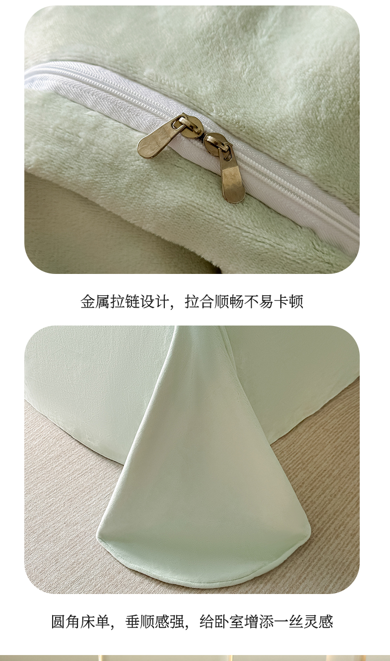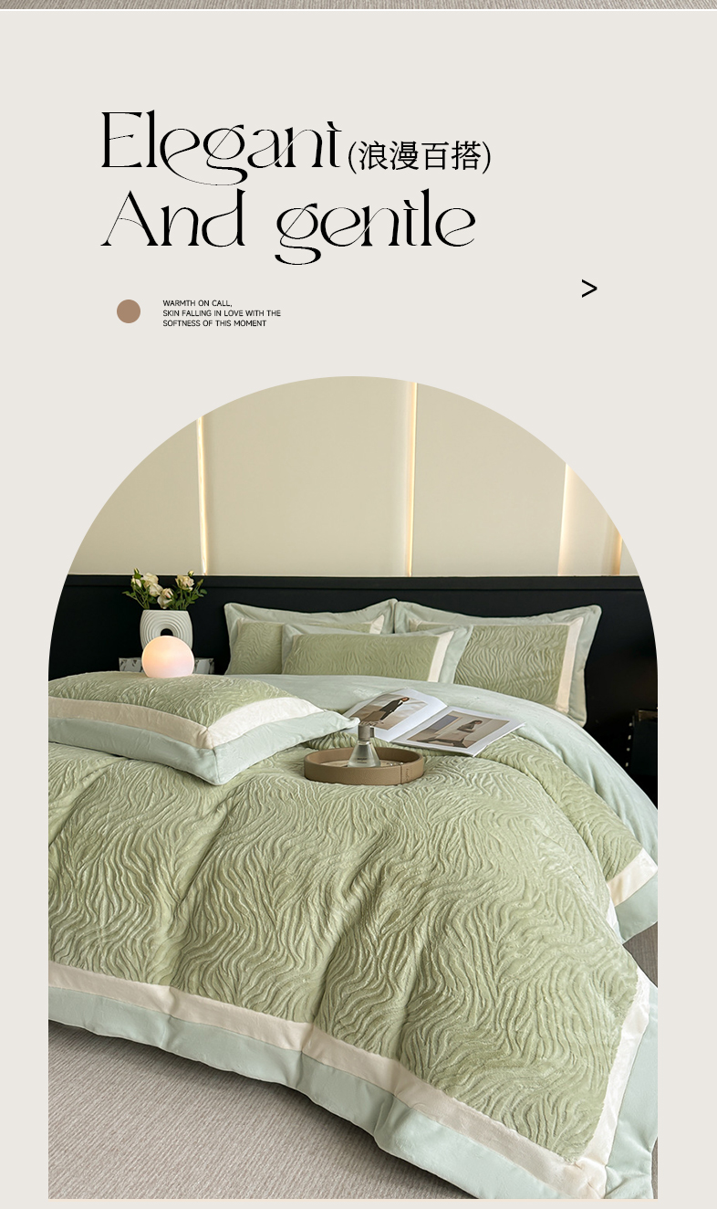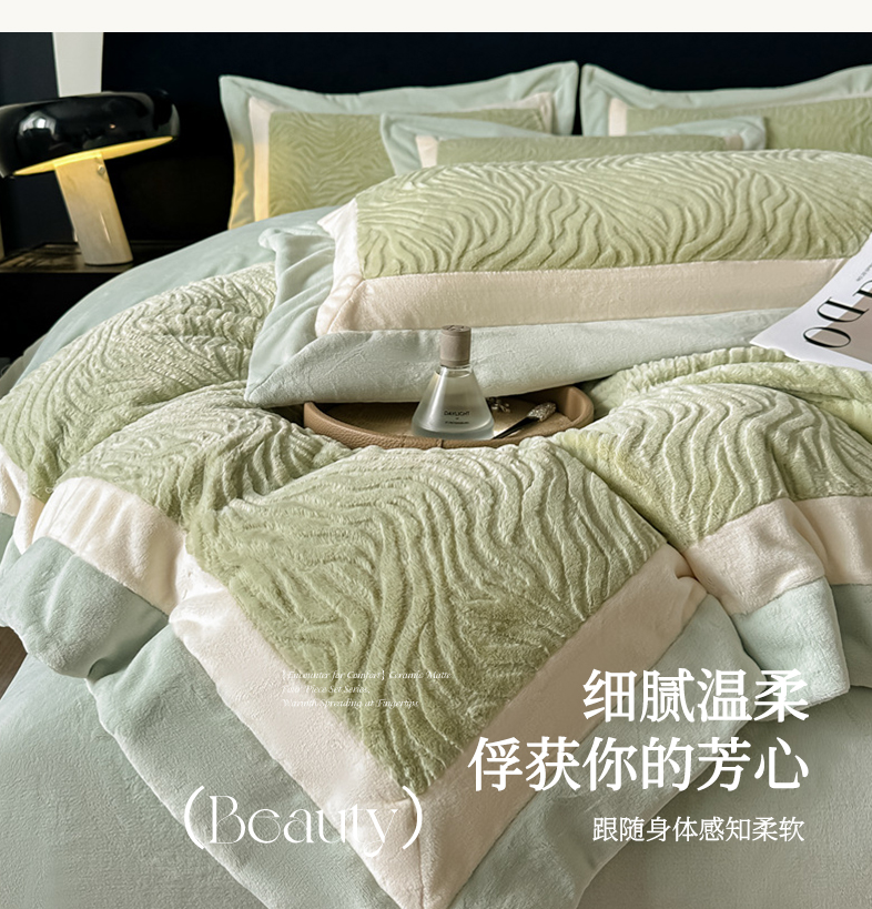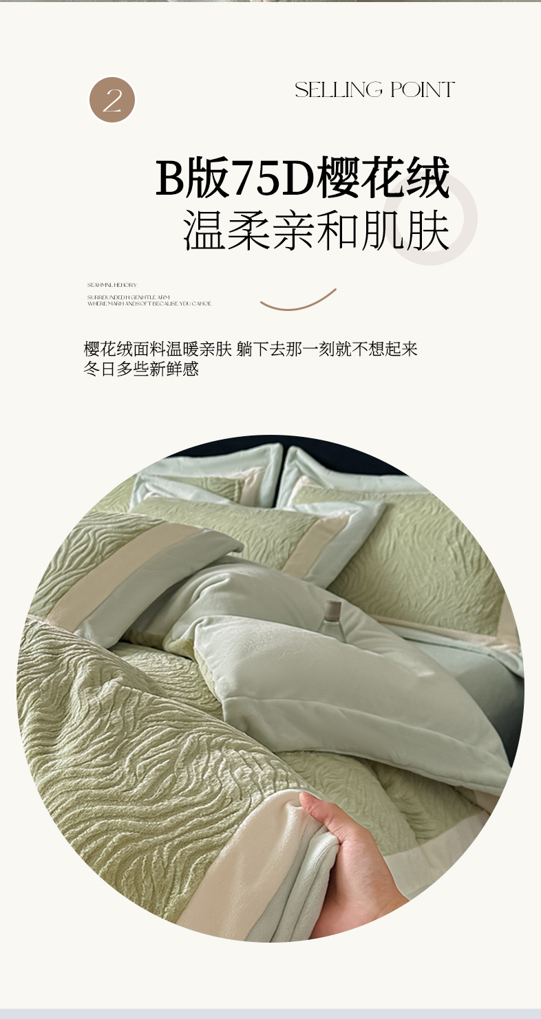 商品名称:锦铭源家纺 2025新款雪貂绒烂花75D全消光超柔樱花绒双拼角四件套牛奶绒四件套【有买家秀】 轻奢-浅绿