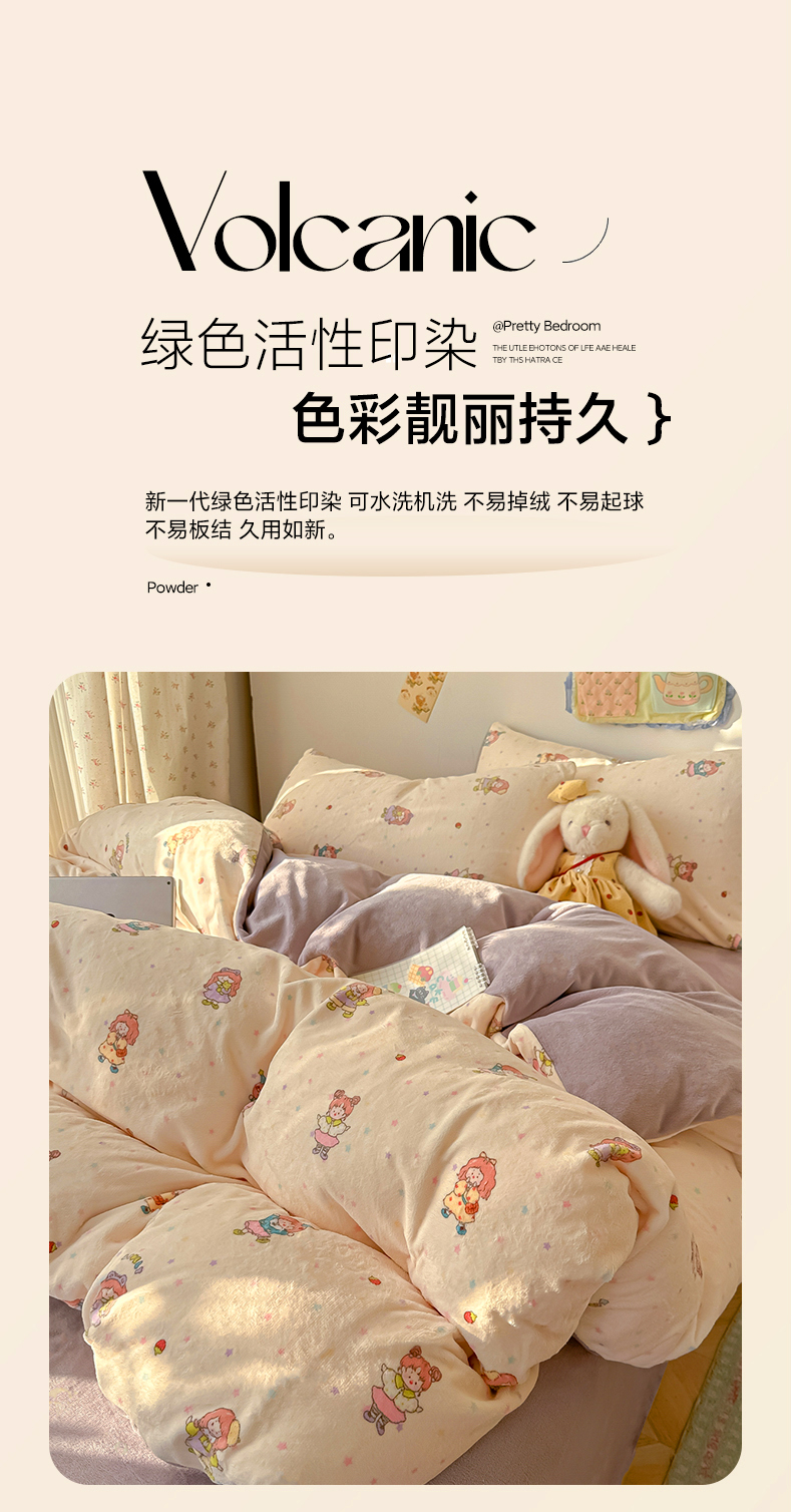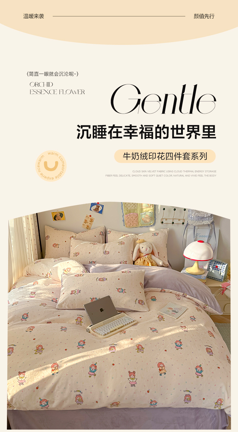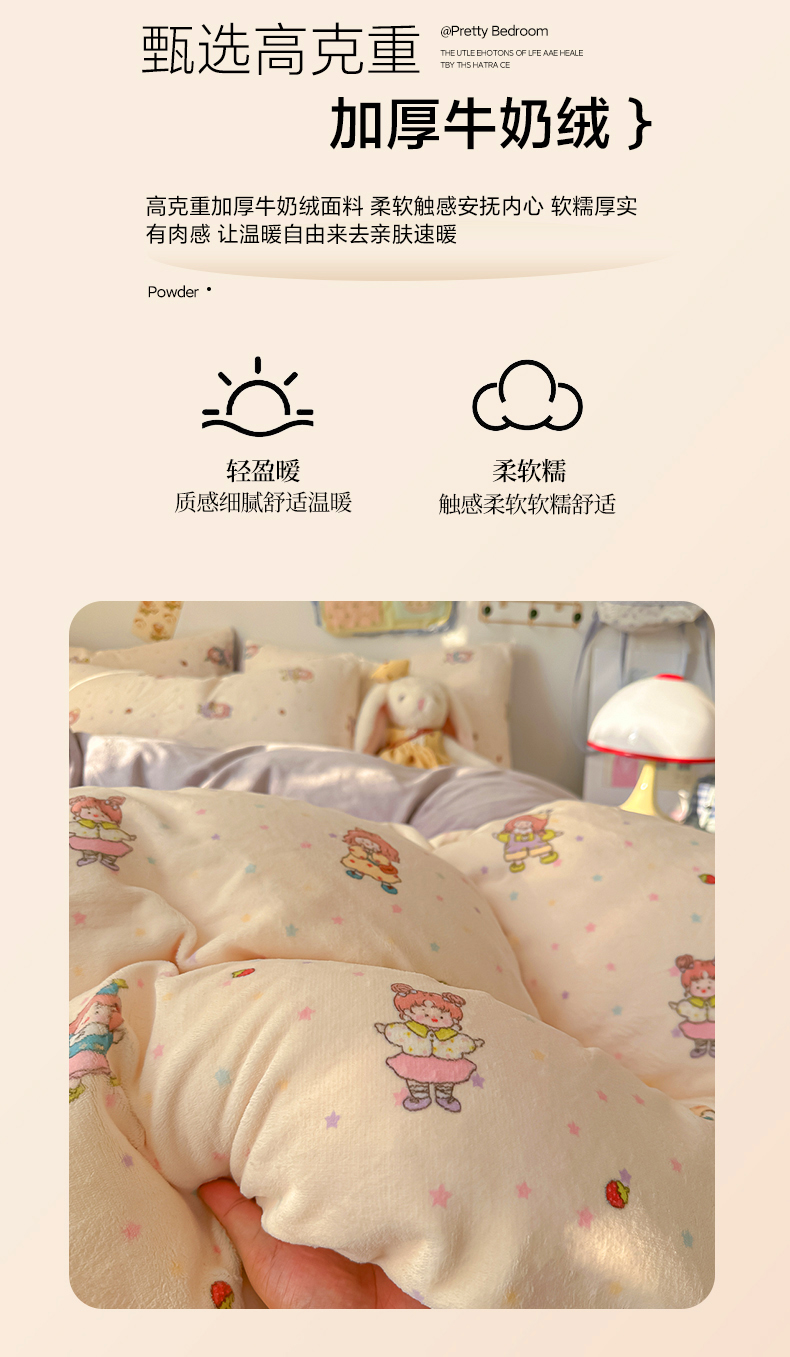 当前位置: 91家纺网 > 商品网购 > 床品套件 > 四件套 > 牛奶绒四件套 > 韩巢家纺 2025新款高克重牛奶绒四件套冬季绒床品被套床单三件套 奶糖少女