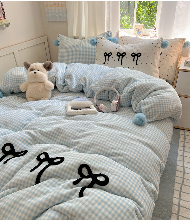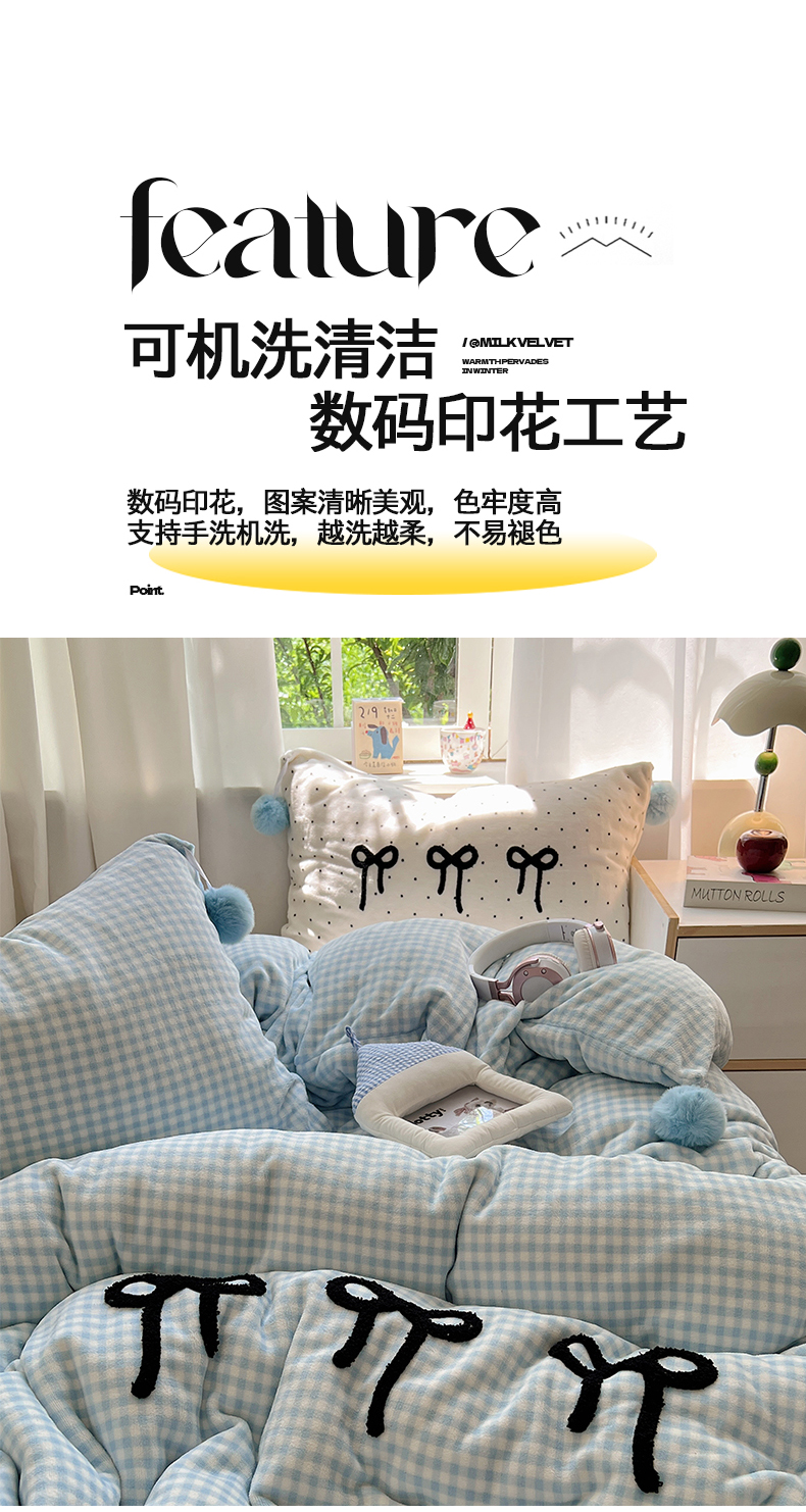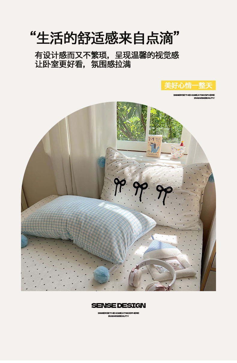 当前位置: 91家纺网 > 商品网购 > 床品套件 > 四件套 > 牛奶绒四件套 > 桃子家居 2025新款insA类少女甜心毛球混搭工艺蝴蝶结刺绣毛巾绣印花加厚牛奶绒四件套 绒毛球-蝴蝶结蓝格白点