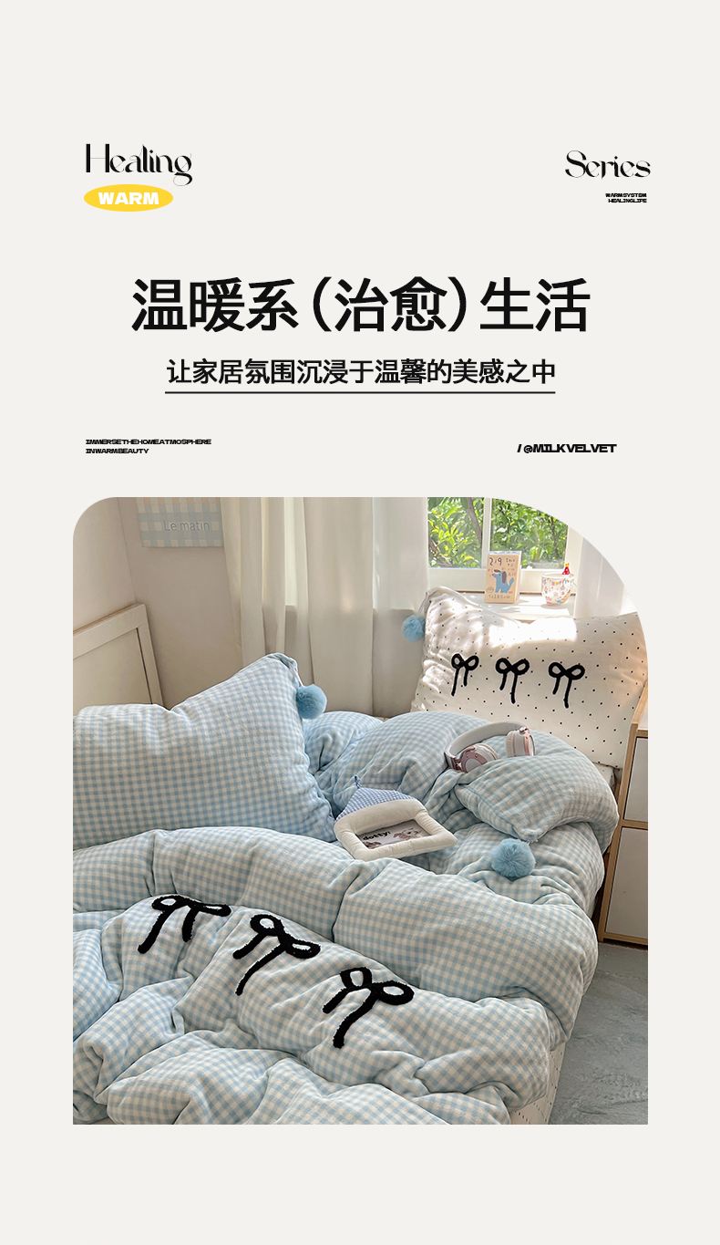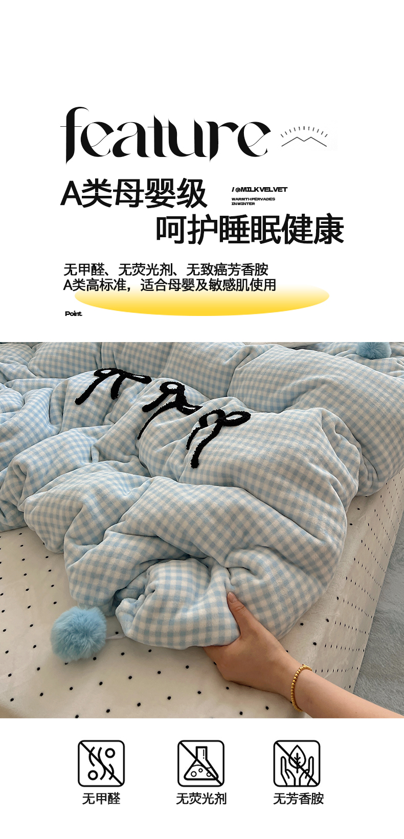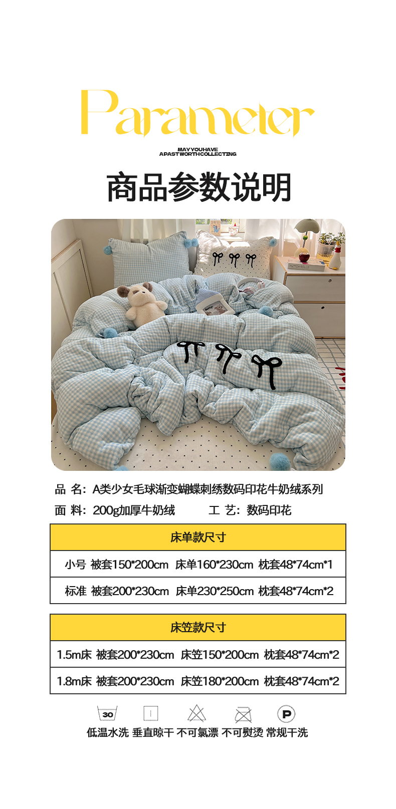 当前位置: 91家纺网 > 商品网购 > 床品套件 > 四件套 > 牛奶绒四件套 > 桃子家居 2025新款insA类少女甜心毛球混搭工艺蝴蝶结刺绣毛巾绣印花加厚牛奶绒四件套 绒毛球-蝴蝶结蓝格白点