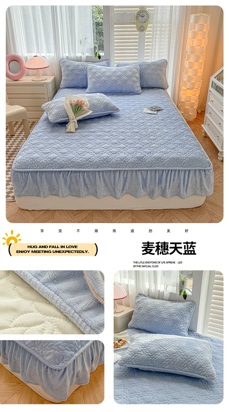 布柔 2025新款加厚刺绣花边夹棉牛奶绒床裙款床笠 麦穗天蓝