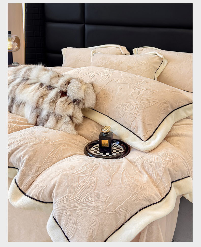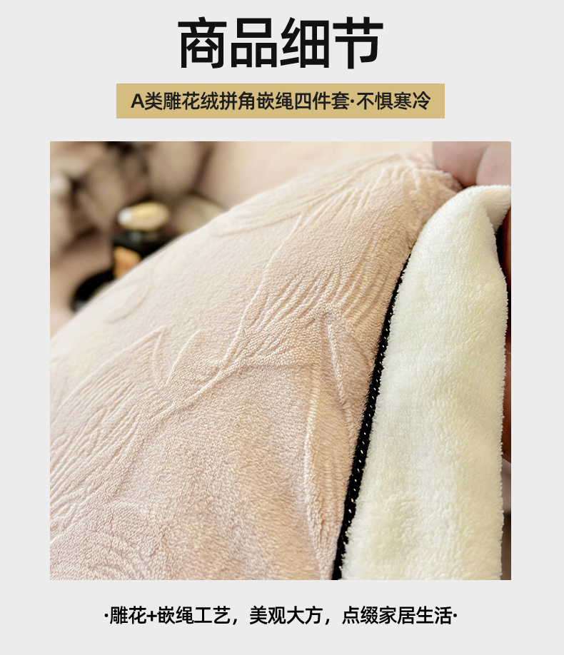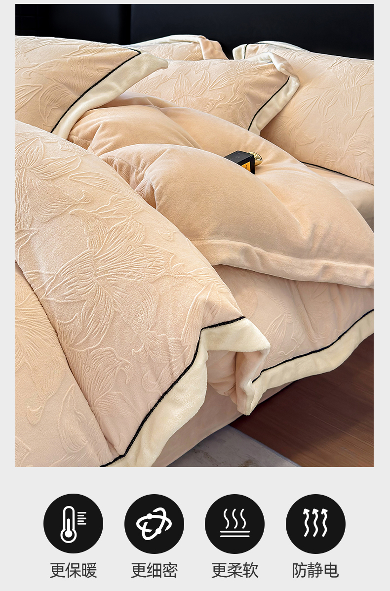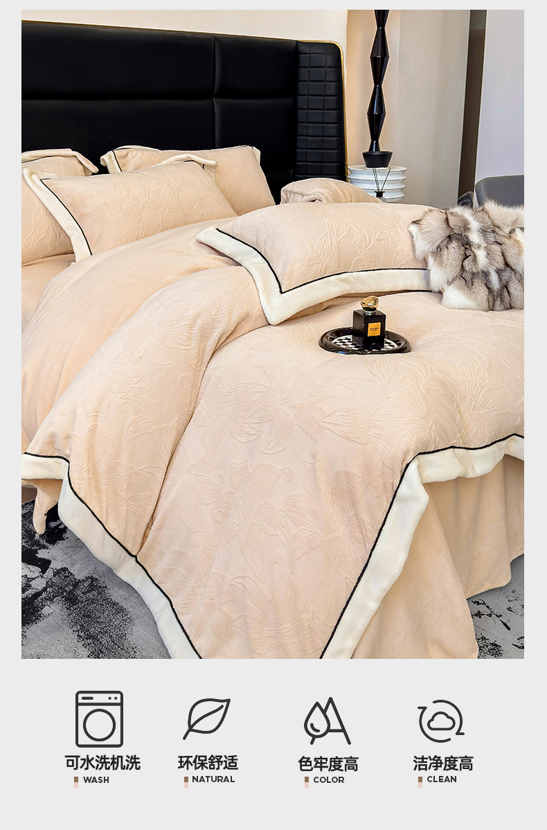 商品名称:金喜 2025秋冬新款230克高克重牛奶绒四件套雕花绒拼角宽边嵌绳系列四件套 百合-奶咖