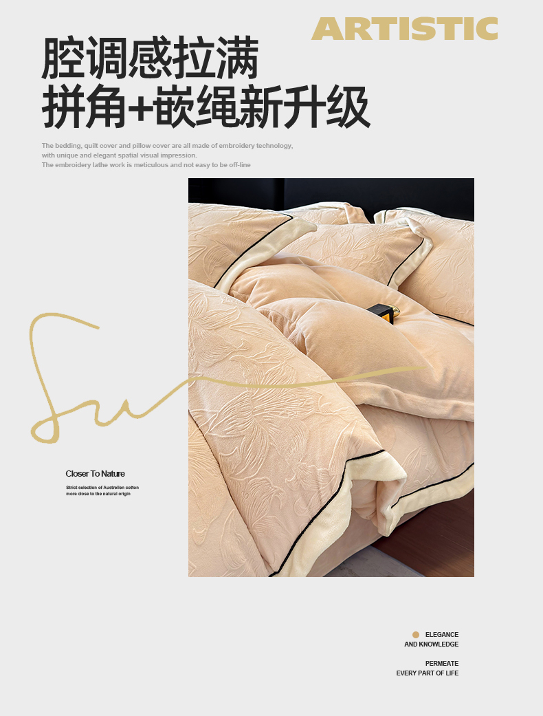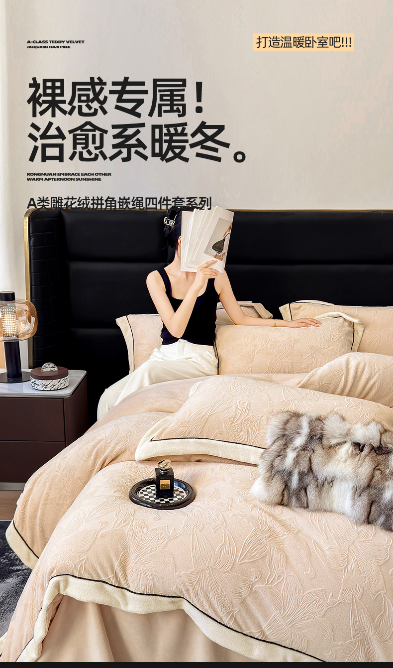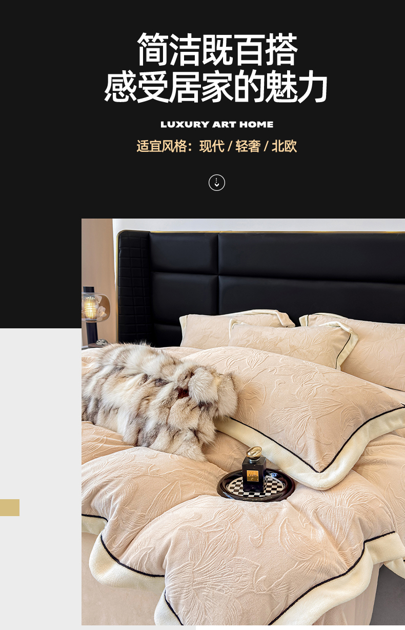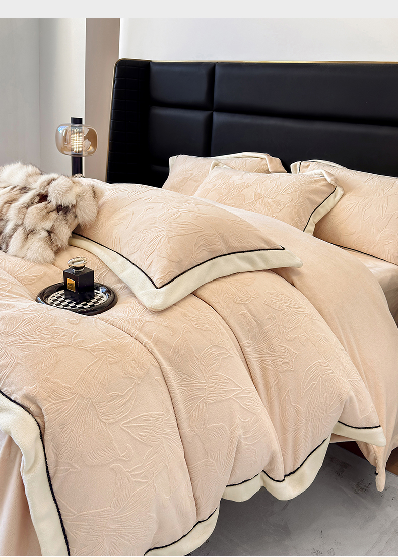 商品名称:金喜 2025秋冬新款230克高克重牛奶绒四件套雕花绒拼角宽边嵌绳系列四件套 百合-奶咖