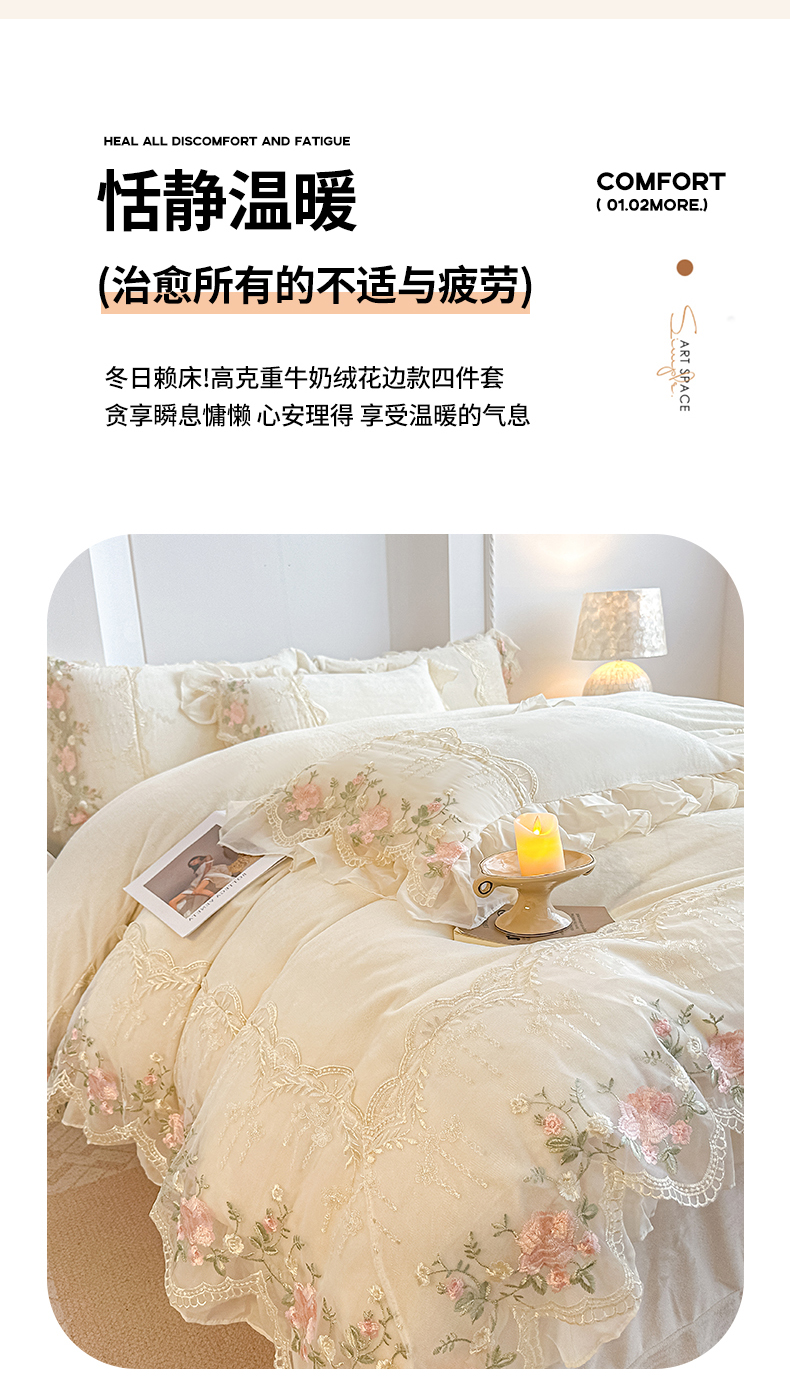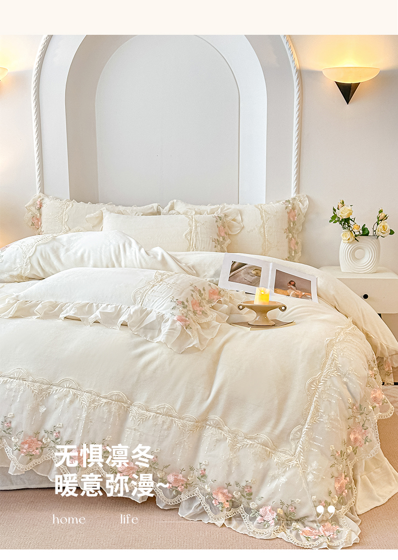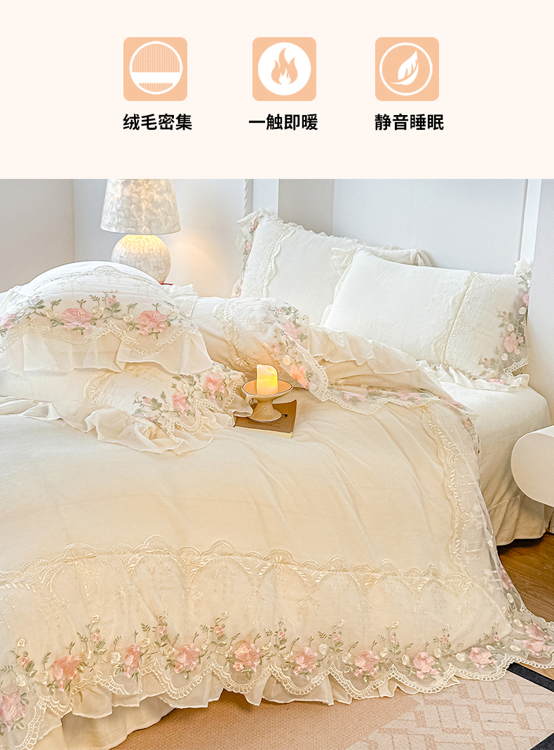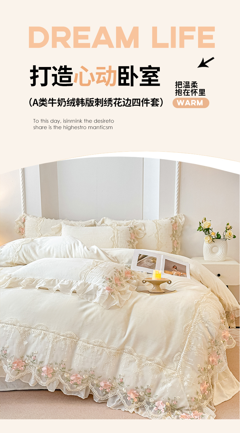 当前位置: 91家纺网 > 商品网购 > 床品套件 > 四件套 > 牛奶绒四件套 > 凯美家居 2025新款A类牛奶绒蕾丝刺绣四件套-锦上添花 锦上添花-奶白