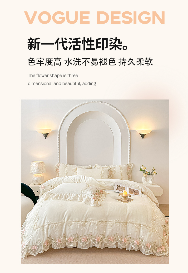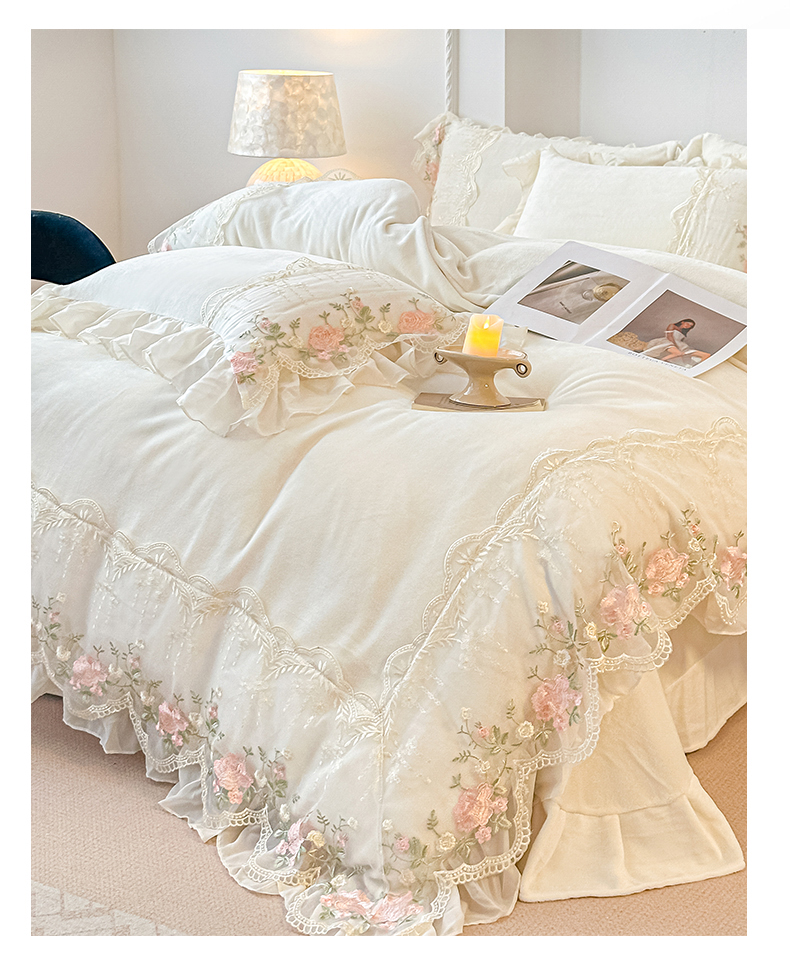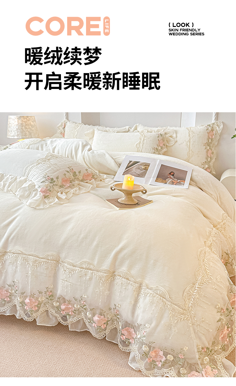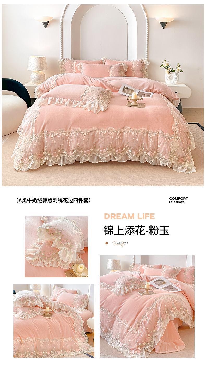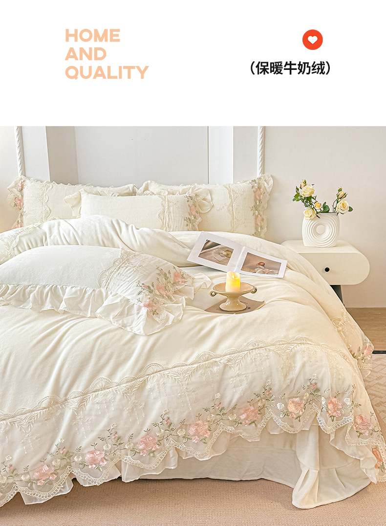 当前位置: 91家纺网 > 商品网购 > 床品套件 > 四件套 > 牛奶绒四件套 > 凯美家居 2025新款A类牛奶绒蕾丝刺绣四件套-锦上添花 锦上添花-奶白