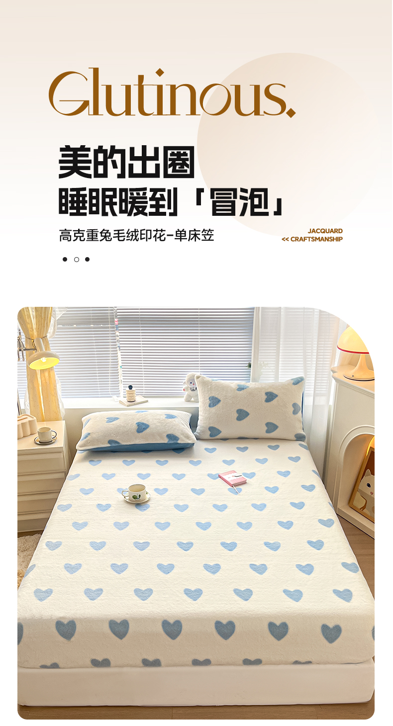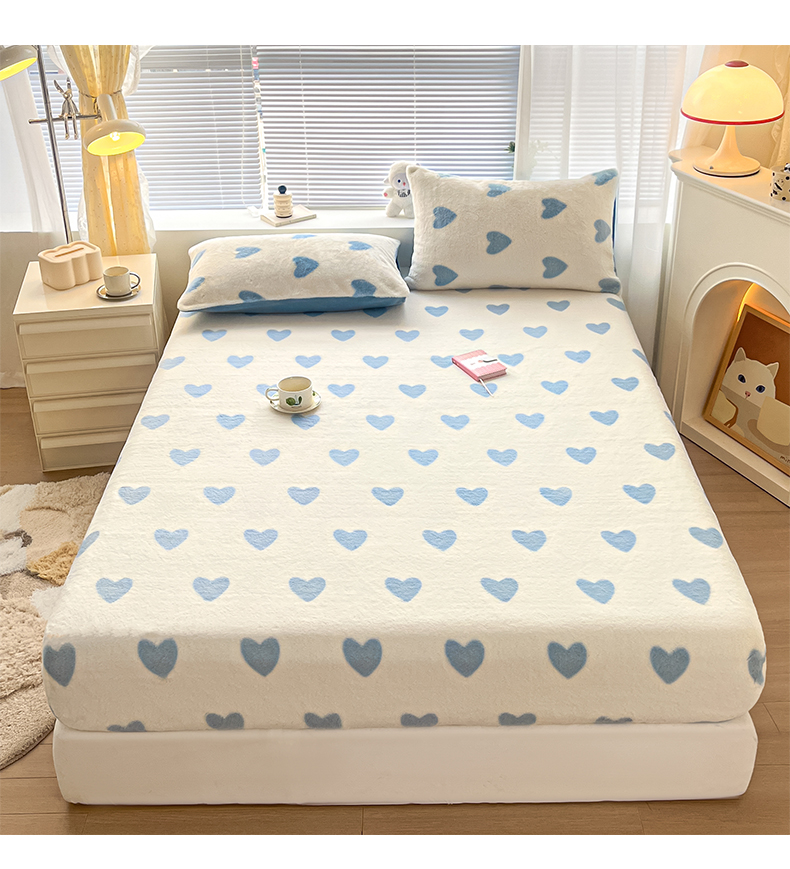 雅居纺家纺 2025新款高克重兔绒印花单床笠-爱心 爱心-蓝