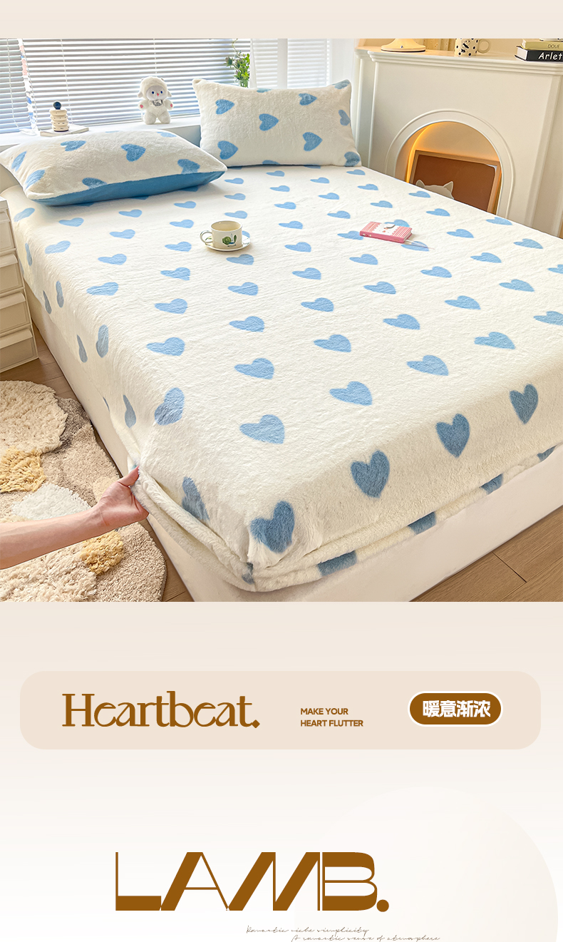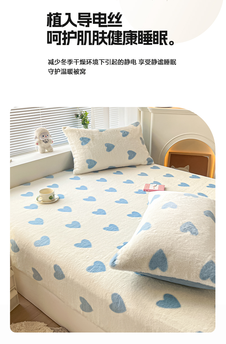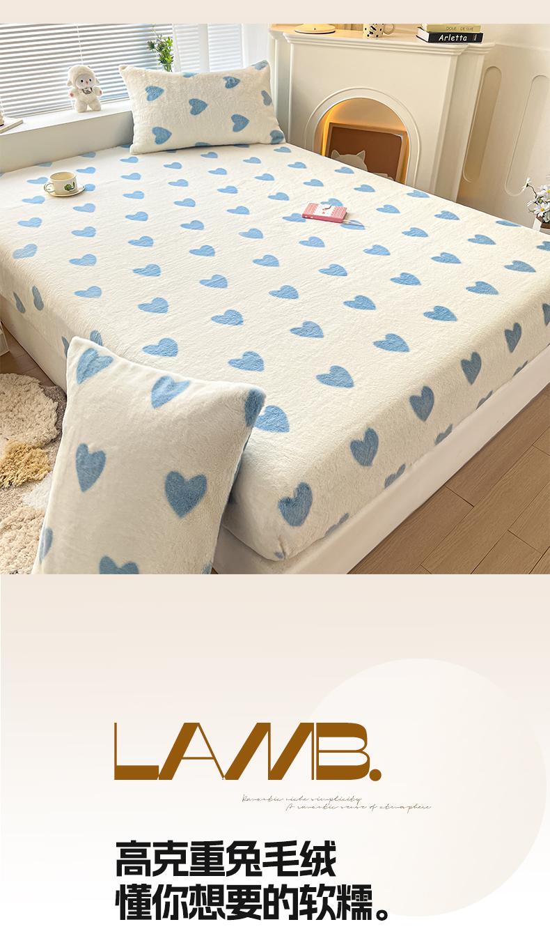 商品名称:雅居纺家纺 2025新款高克重兔绒印花单床笠-爱心 爱心-蓝