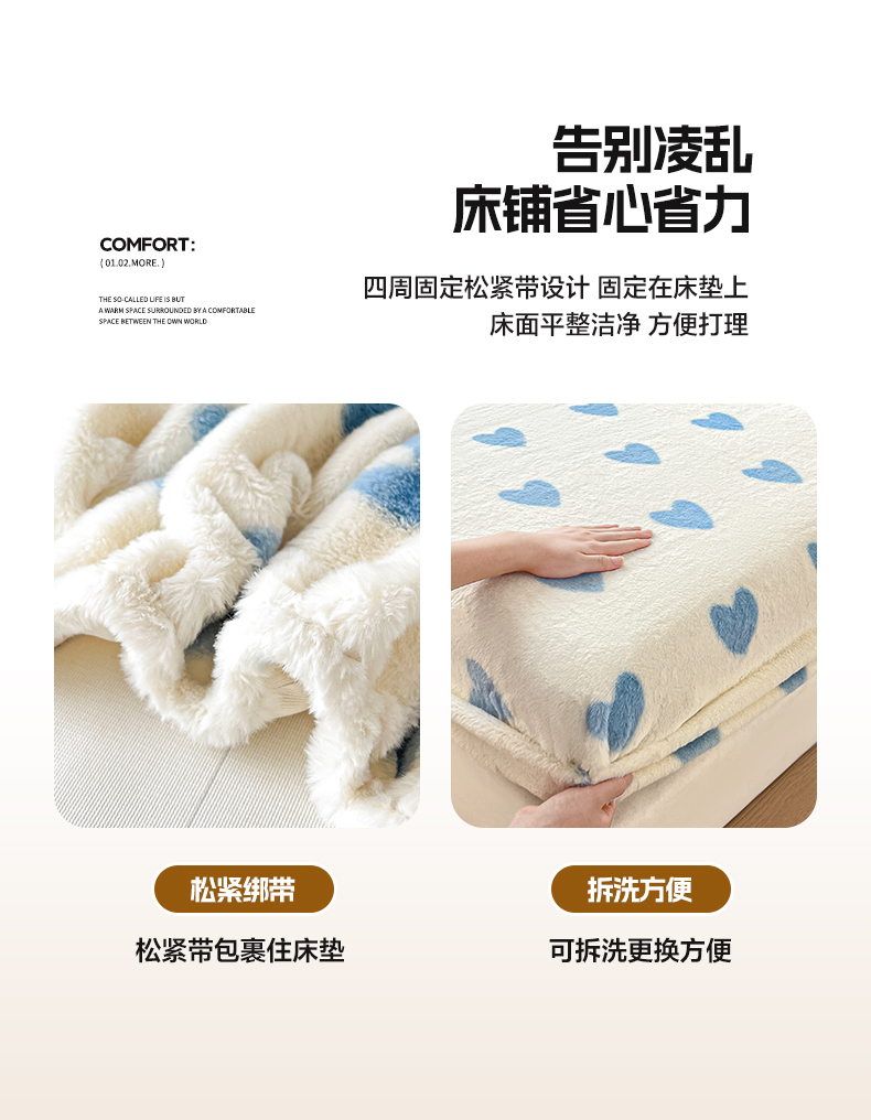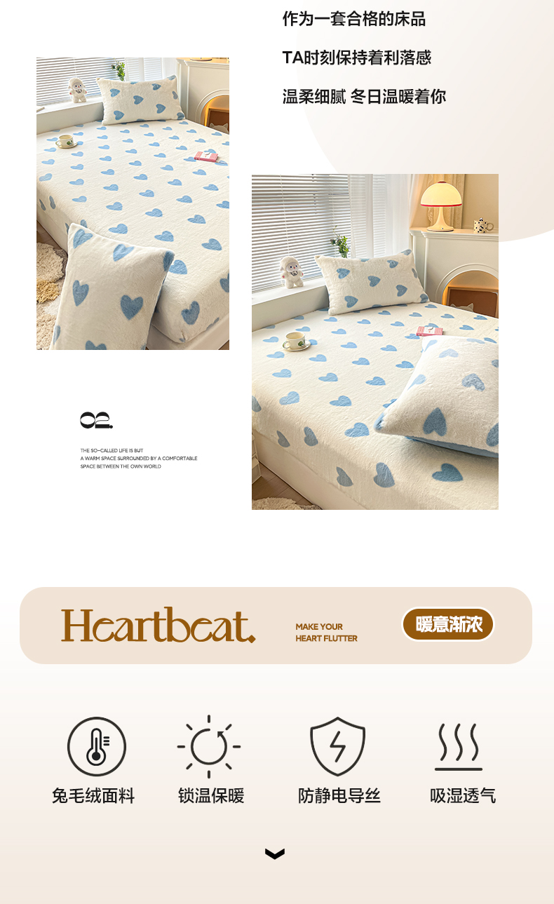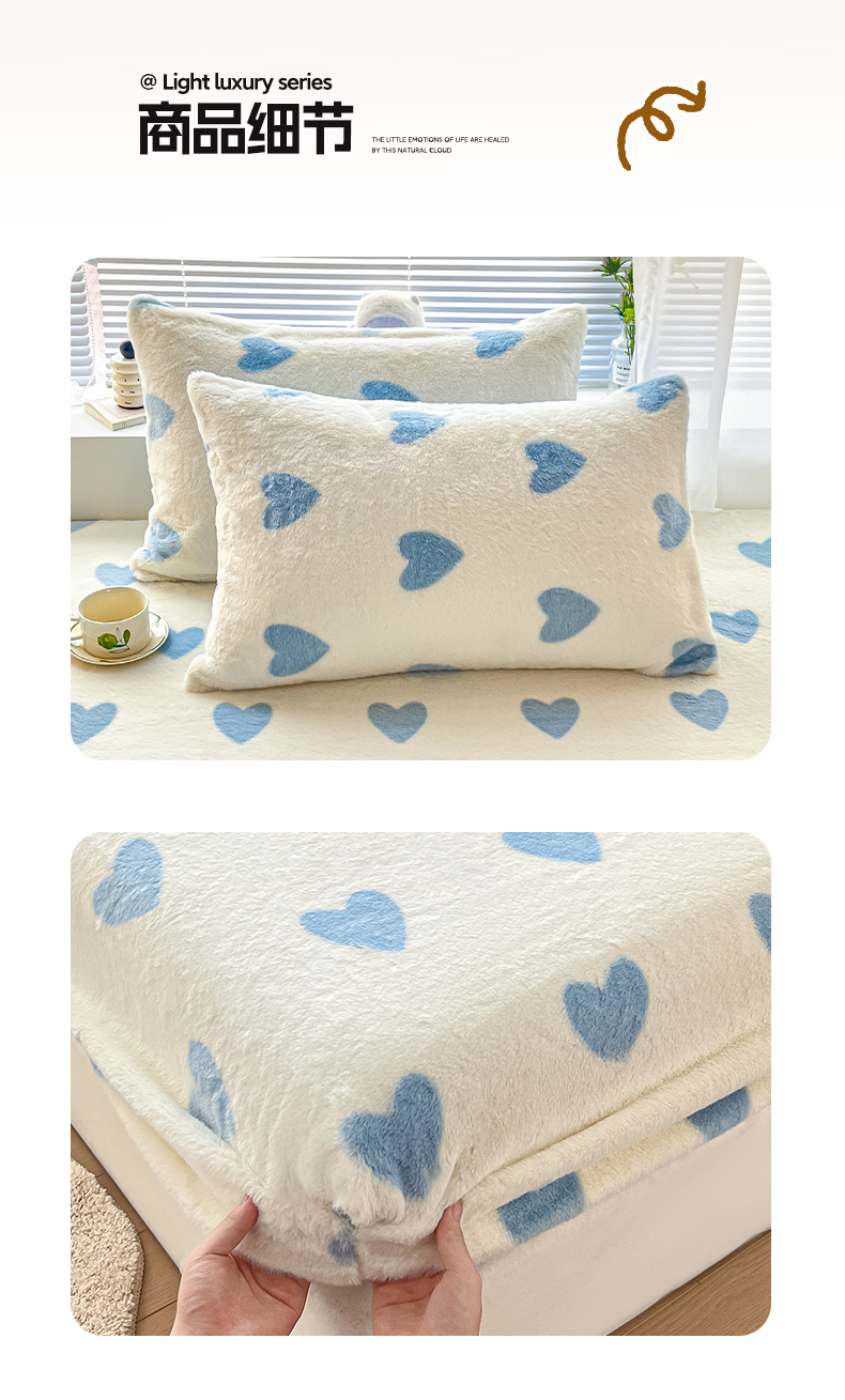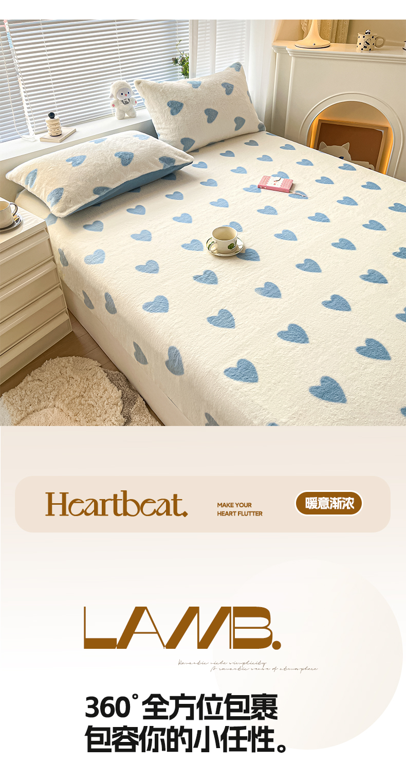 商品名称:雅居纺家纺 2025新款高克重兔绒印花单床笠-爱心 爱心-蓝