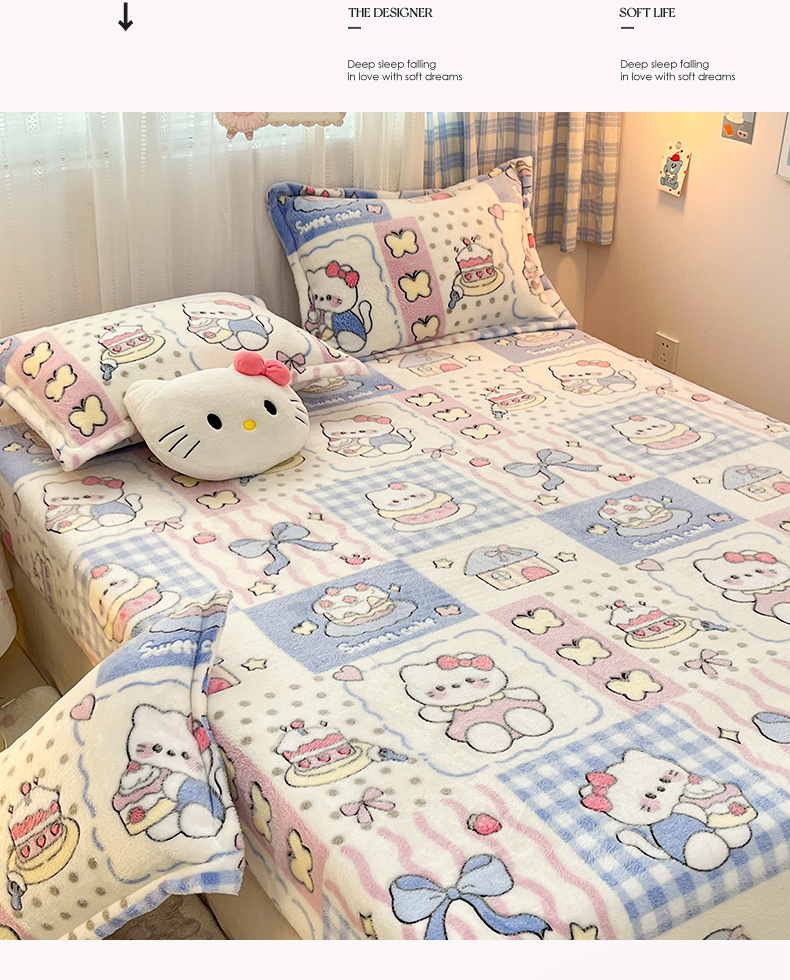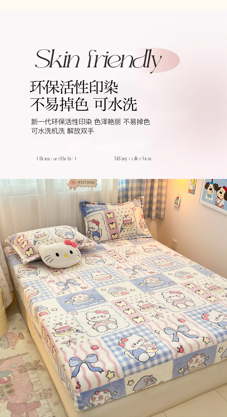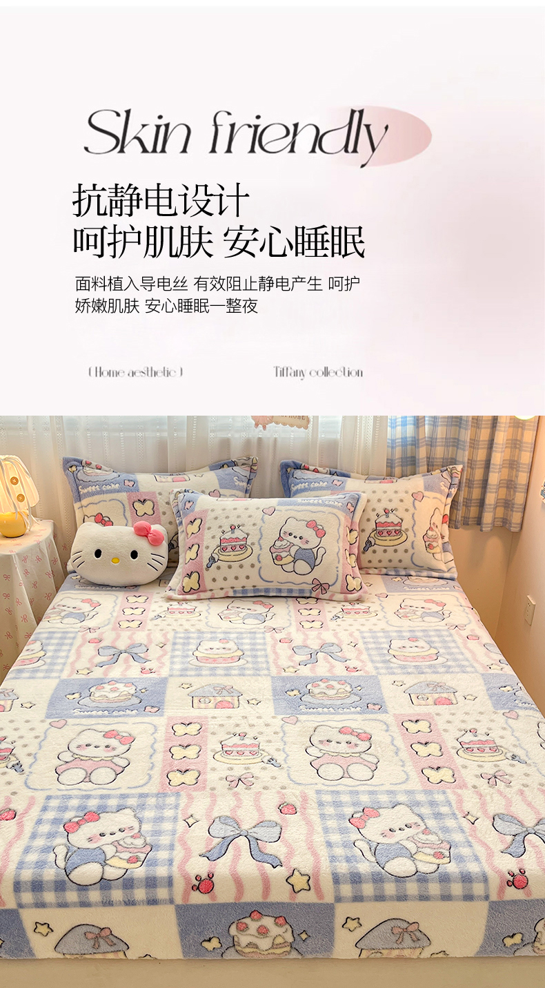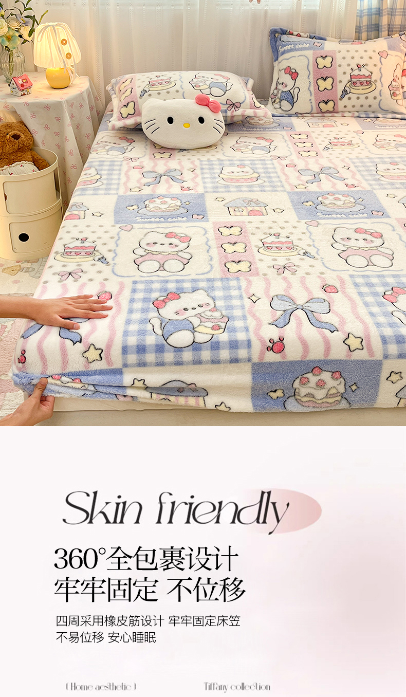 川悦生活 2025新款高克重雪花绒卡通印花加厚保暖大床单床笠 床笠小喵甜心