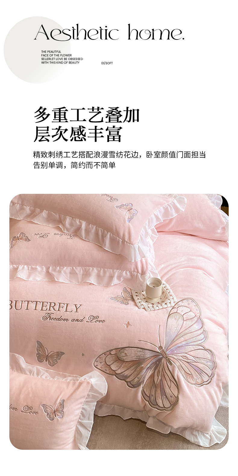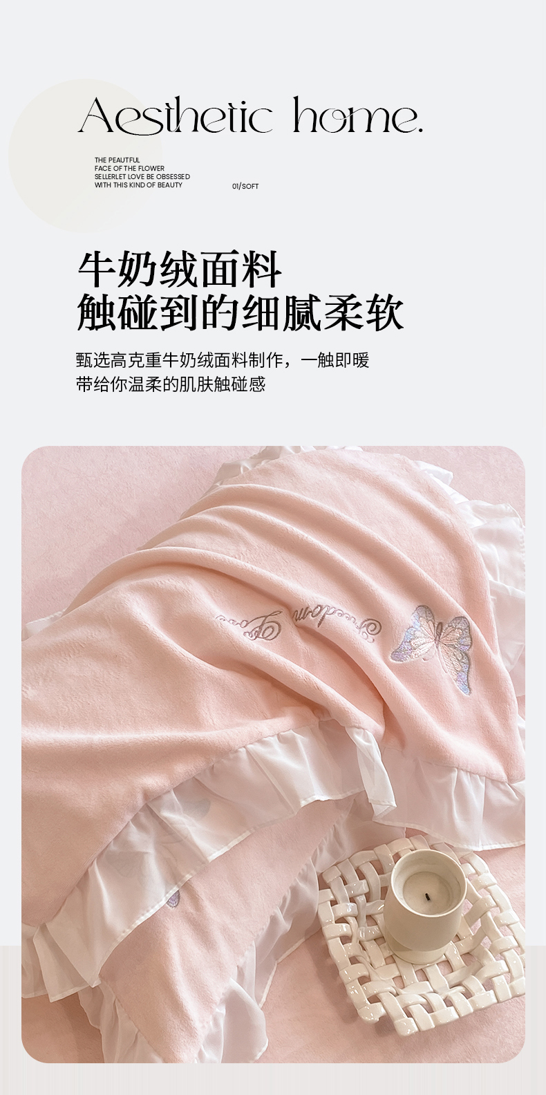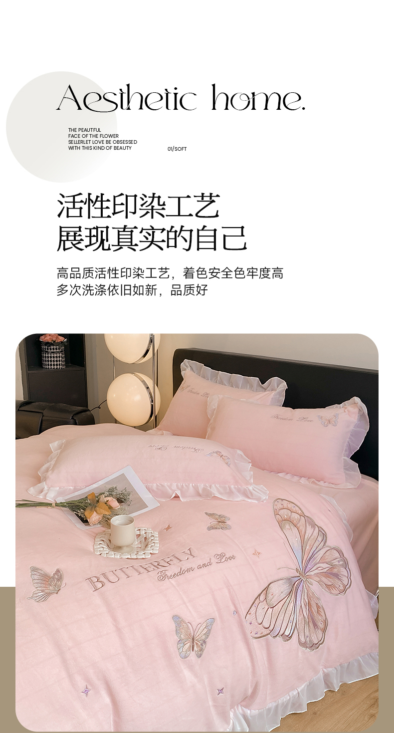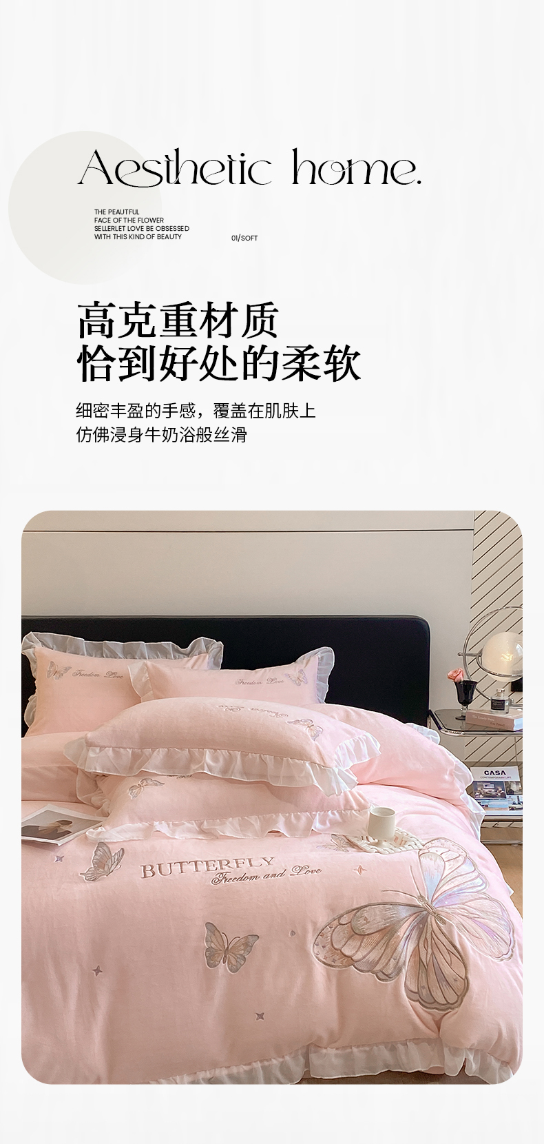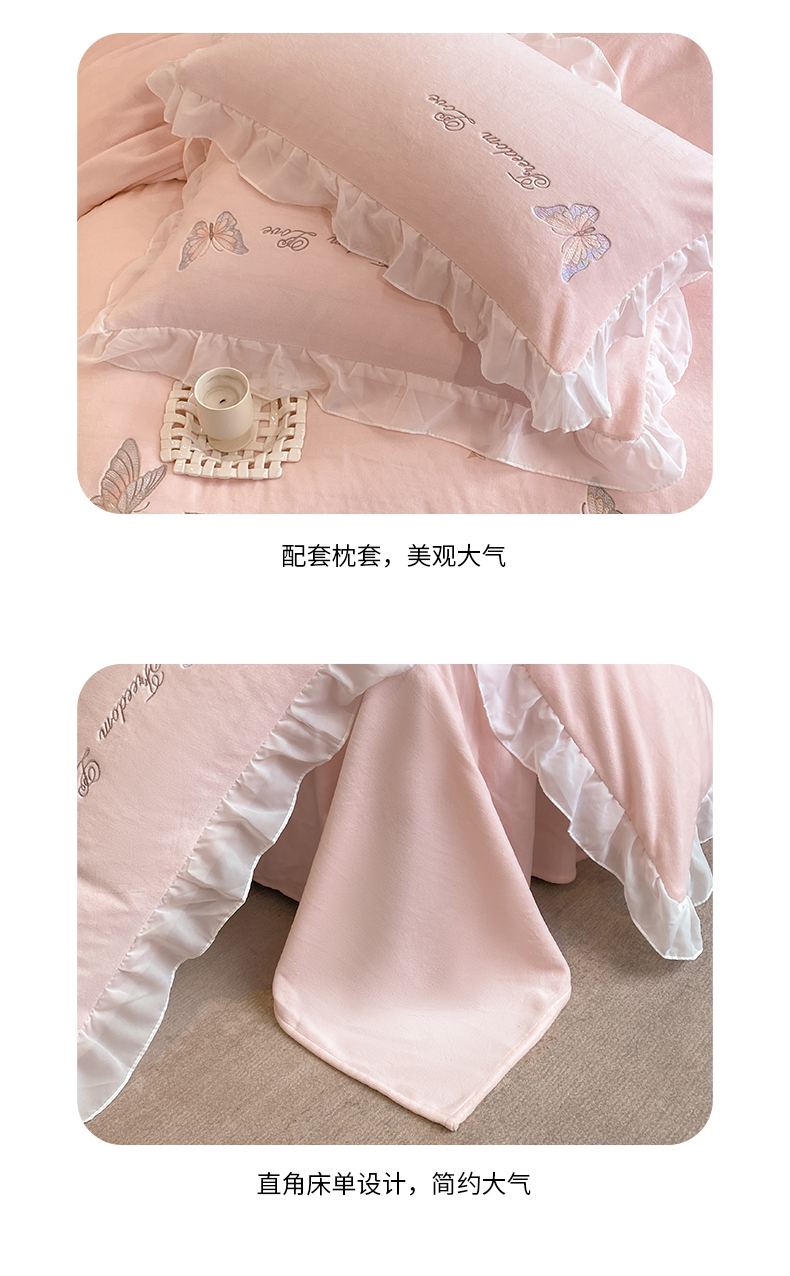 商品名称:木子家纺 2025新款牛奶绒纯色刺绣花边四件套 轻罗粉