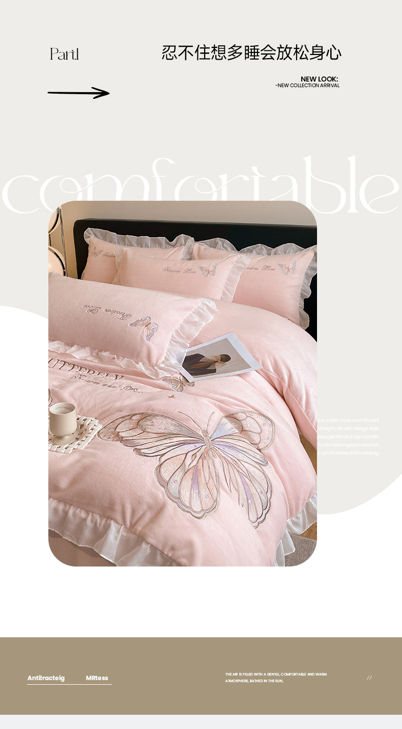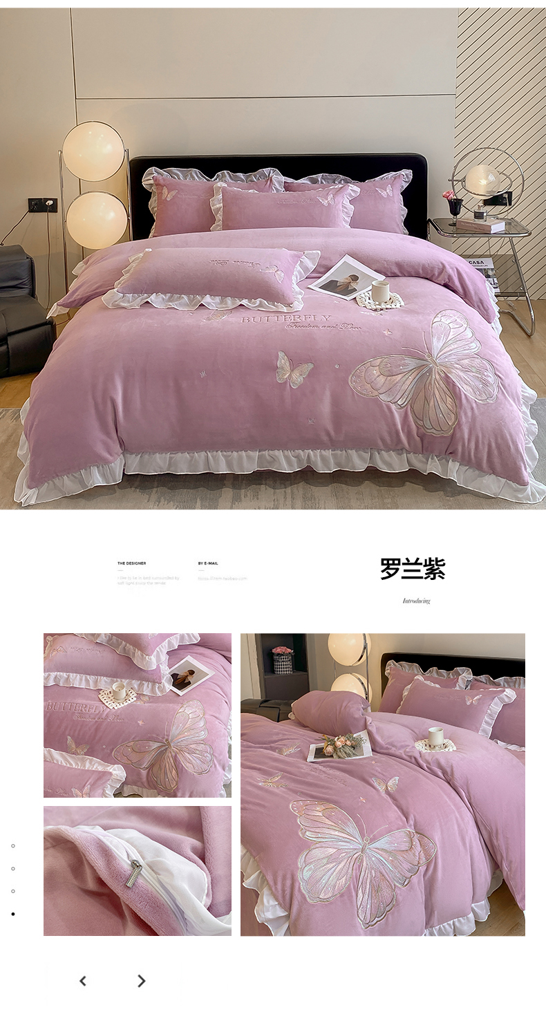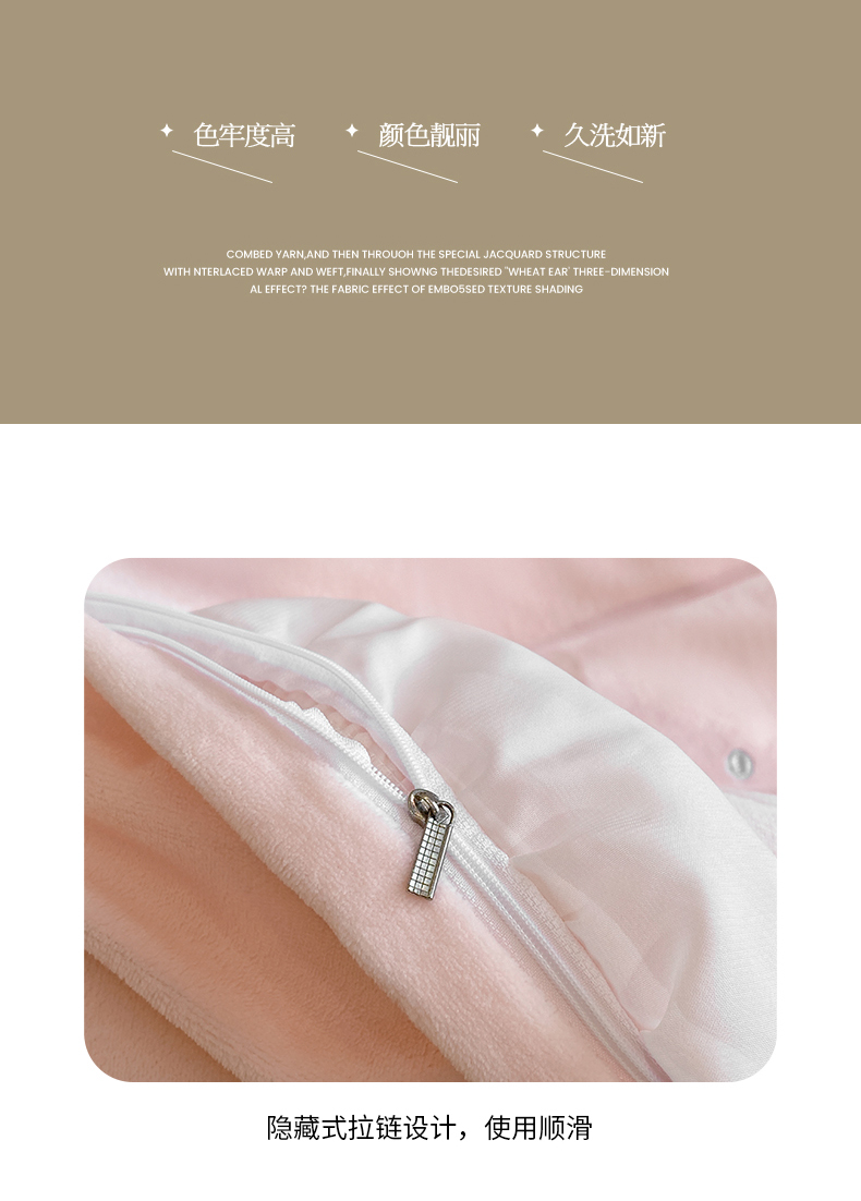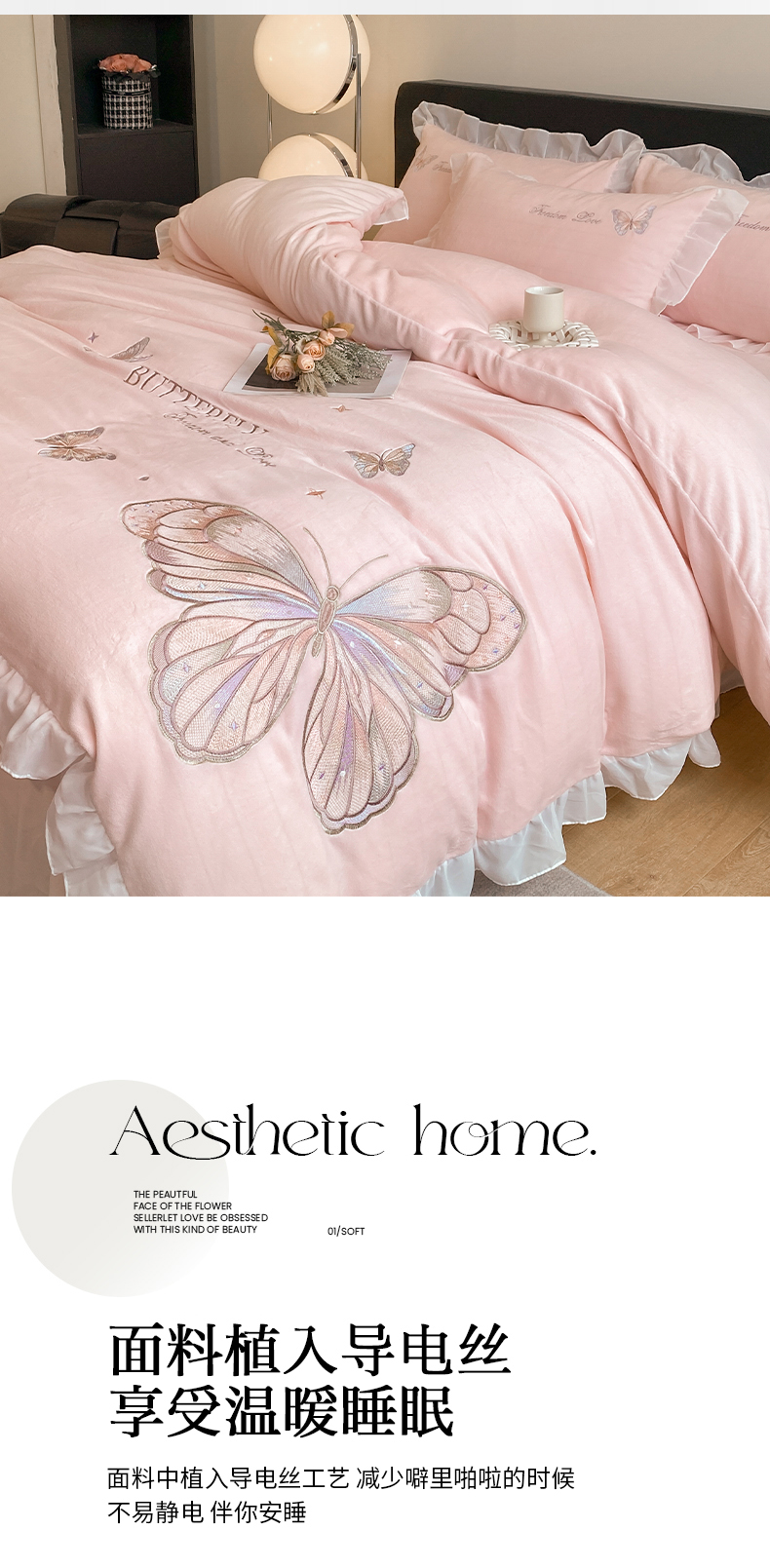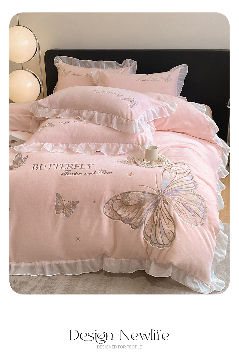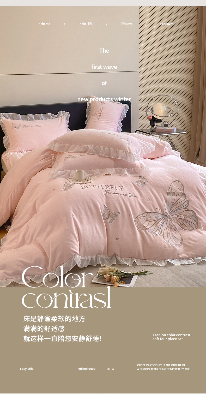 商品名称:木子家纺 2025新款牛奶绒纯色刺绣花边四件套 轻罗粉