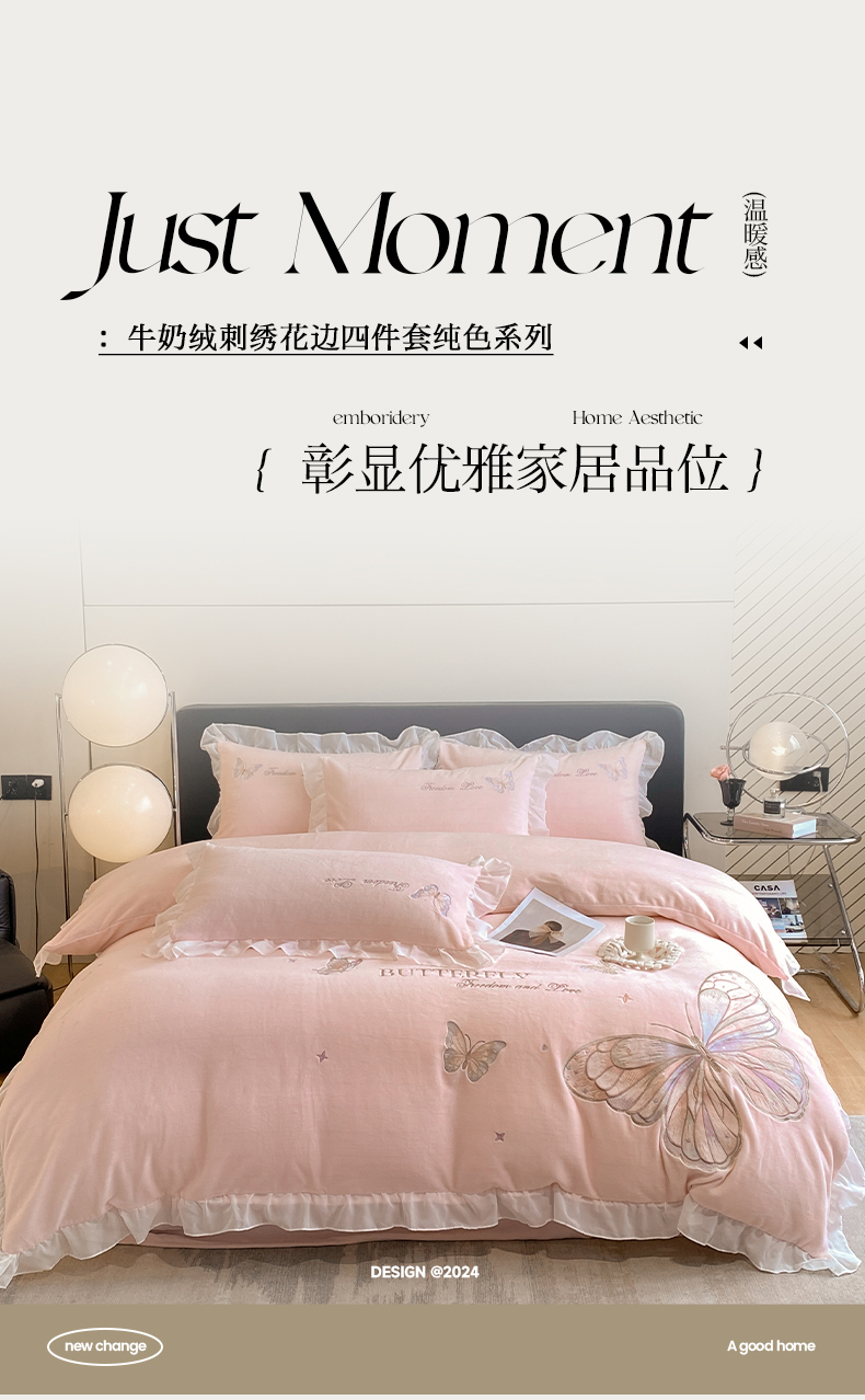 木子家纺 2025新款牛奶绒纯色刺绣花边四件套 轻罗粉