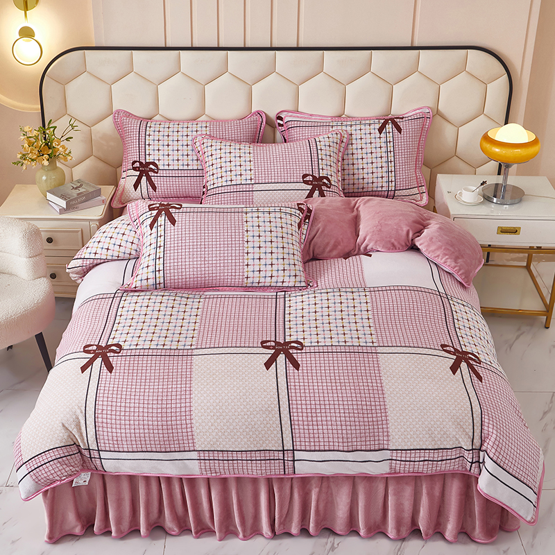 商品名称:凤杰 2025新款高克重7斤加厚印花牛奶绒金貂法莱绒四件套 粉恋