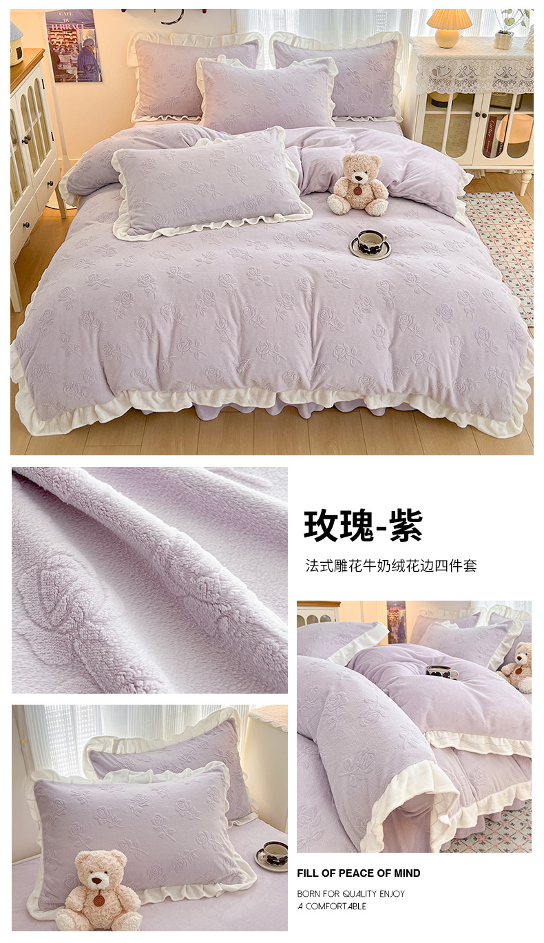当前位置: 91家纺网 > 商品网购 > 床品套件 > 四件套 > 牛奶绒四件套 > 安哆啦家纺 2025新款法式雕花牛奶绒花边四件套 花中蝶-粉