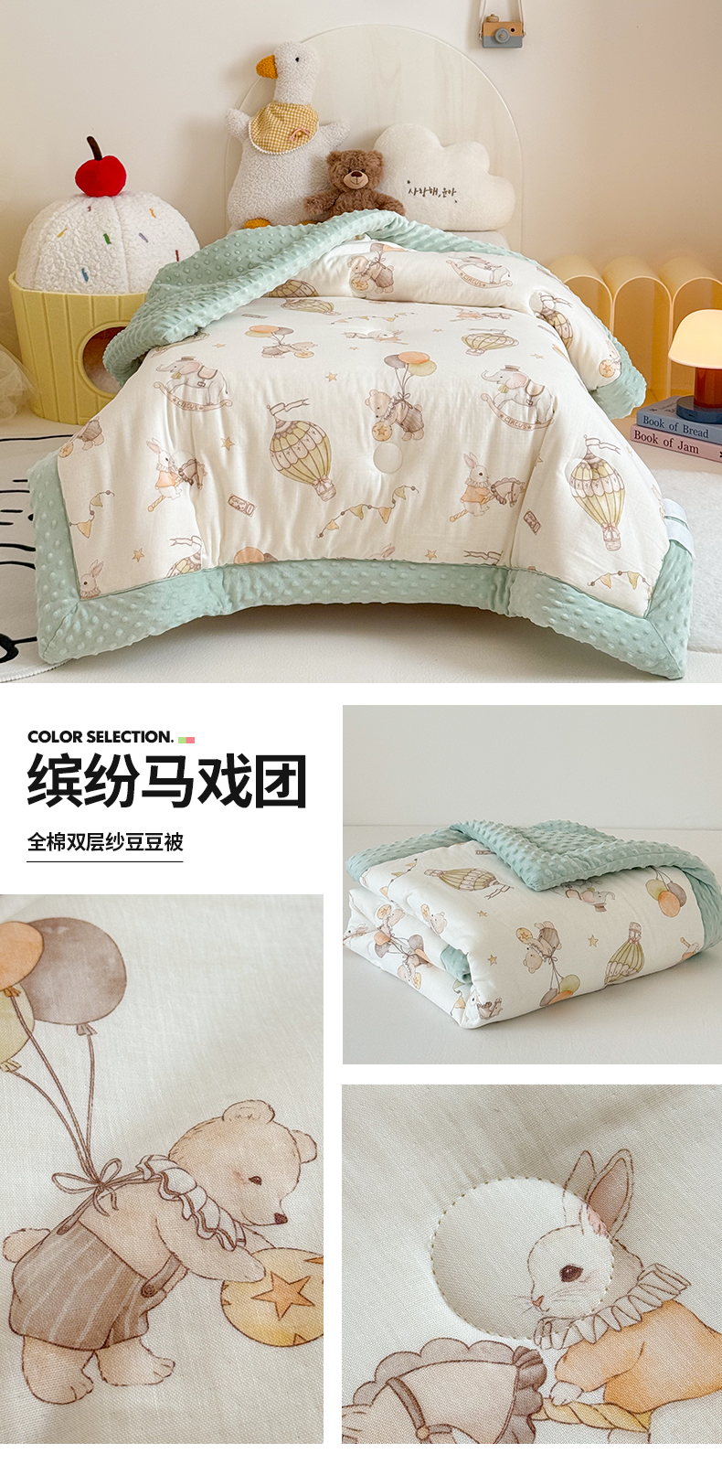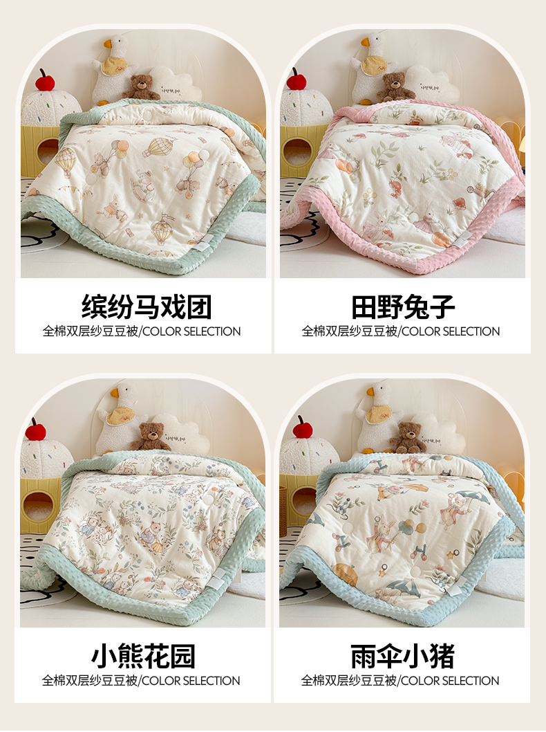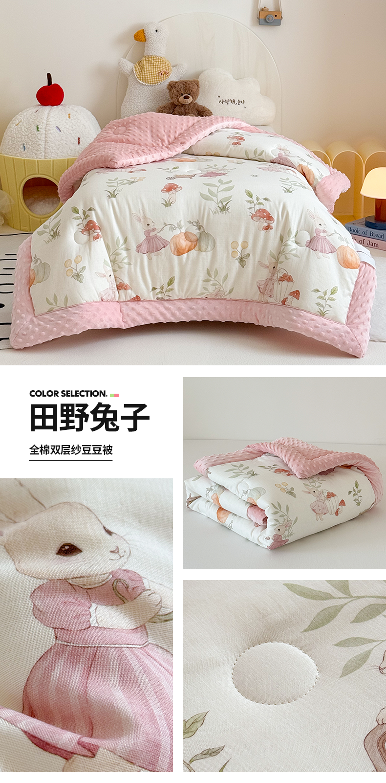 (总)嗨生活 2025新款全棉双层纱豆豆被 儿童被 春秋被 冬被 幼儿园被子,草莓兔兔,花丛小兔,米菲兔,汽车乐园,挖机恐龙,玩具屋,小海豚,熊猫盼盼