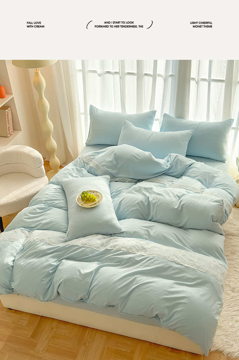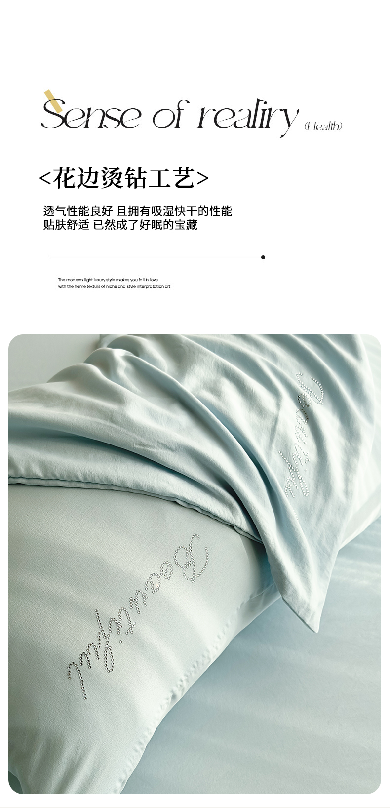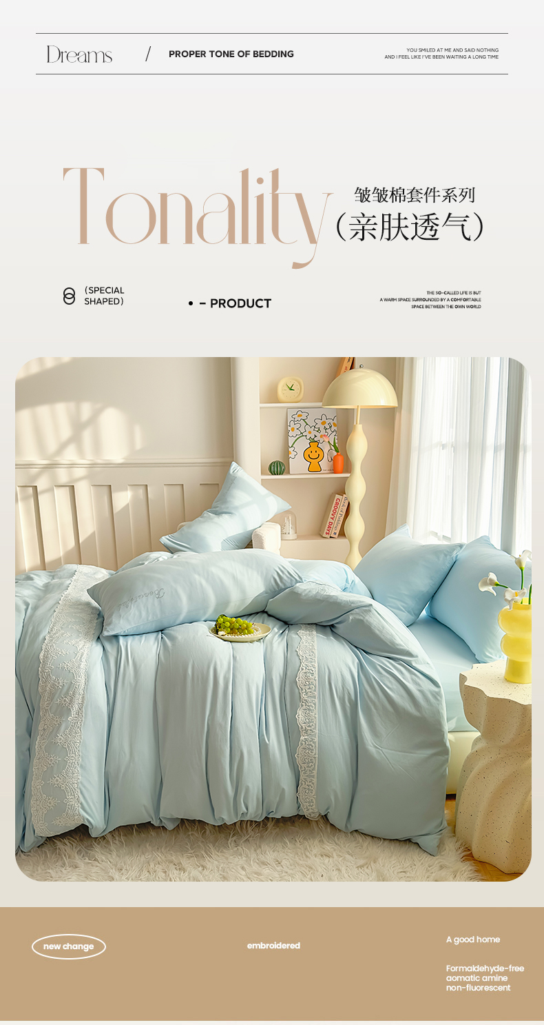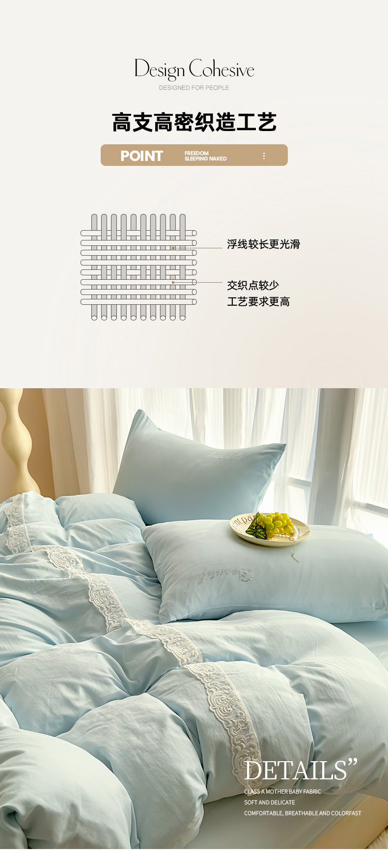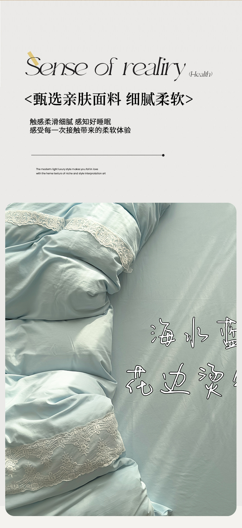 当前位置: 91家纺网 > 商品网购 > 床品套件 > 四件套 > 水洗棉四件套 > 灿哈 2025新款烫钻蕾丝花边水洗棉四件套 海水蓝