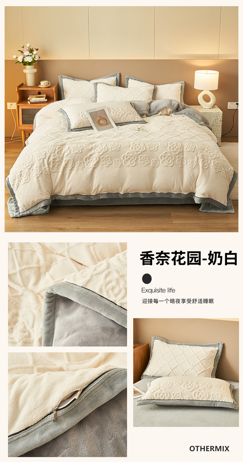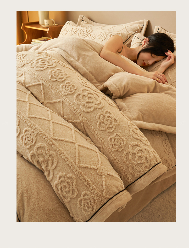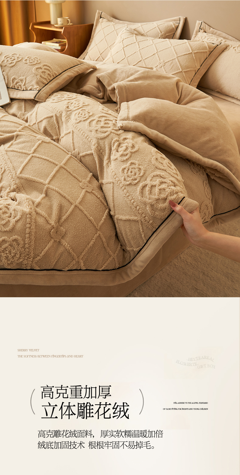 (总)金鹰 2025新款A类雕花牛奶绒烂花兔毛包边四件套,羽毛,波澜壮阔,繁花,蝴蝶梦,简爱,兰花,玫瑰物语,梦幻森林,清晨玫瑰,羽叶,仲夏晨歌