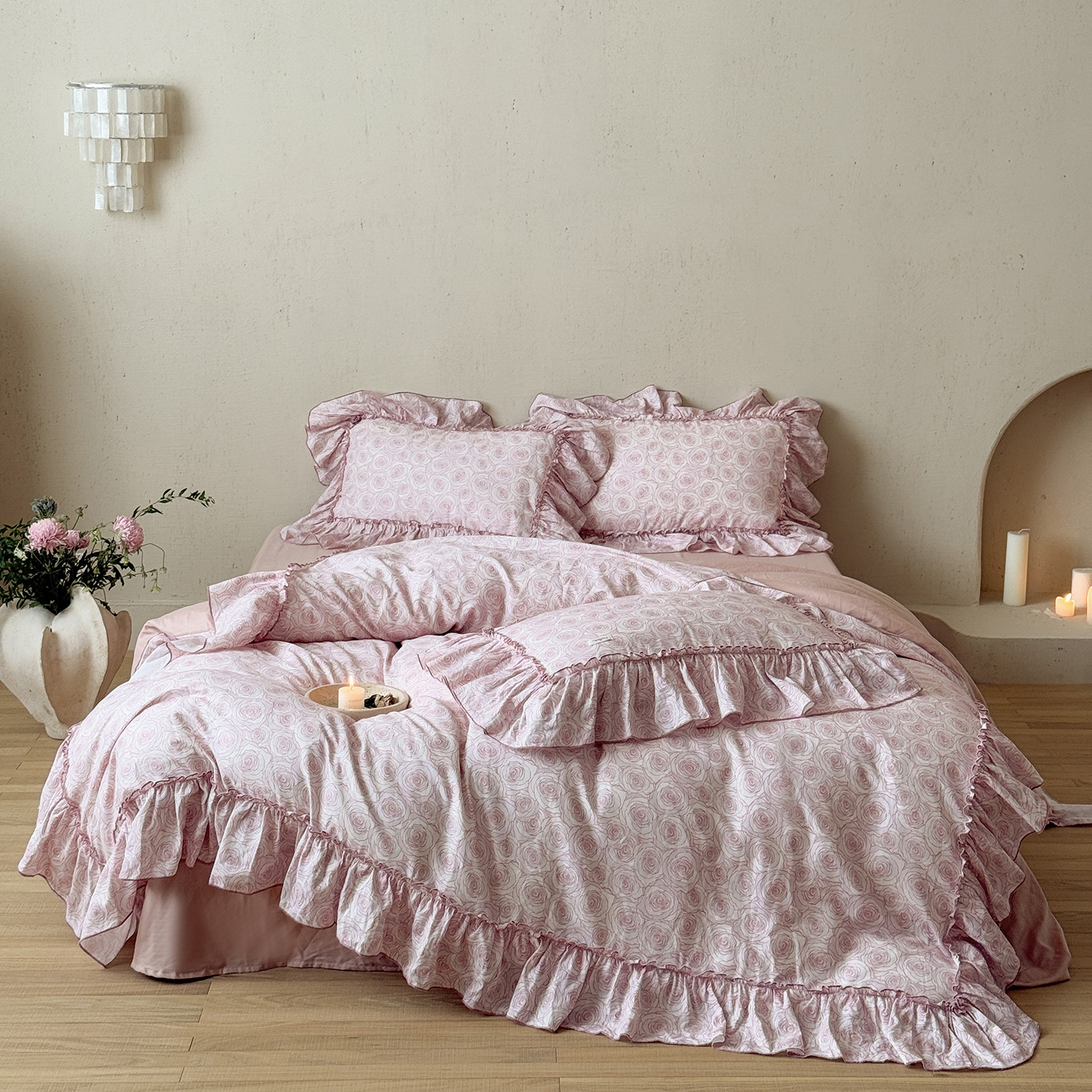 (总)多乐娜 2025新款轻法式100S贡缎长绒棉数码印花纯棉双层花边四件套 轻奢全棉(会员-20),浮光影(双层花边款)