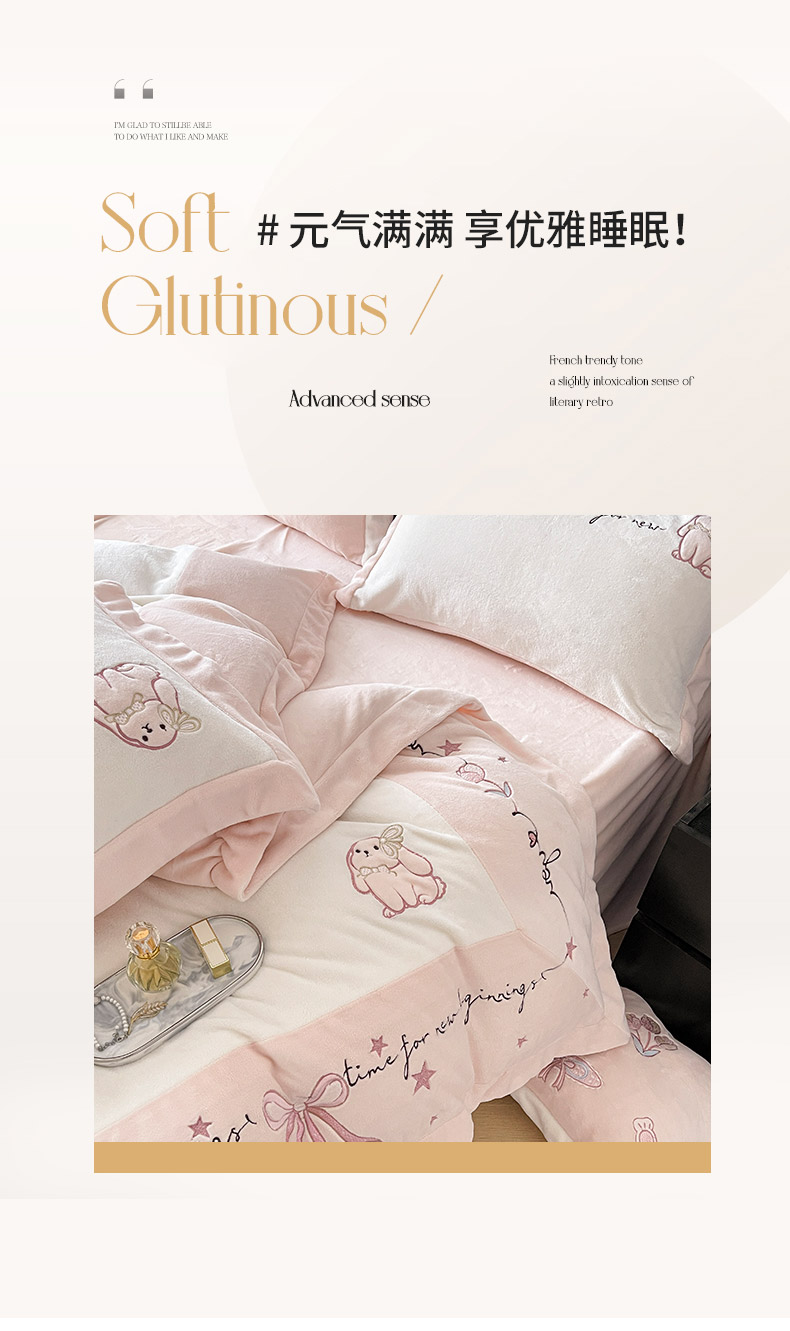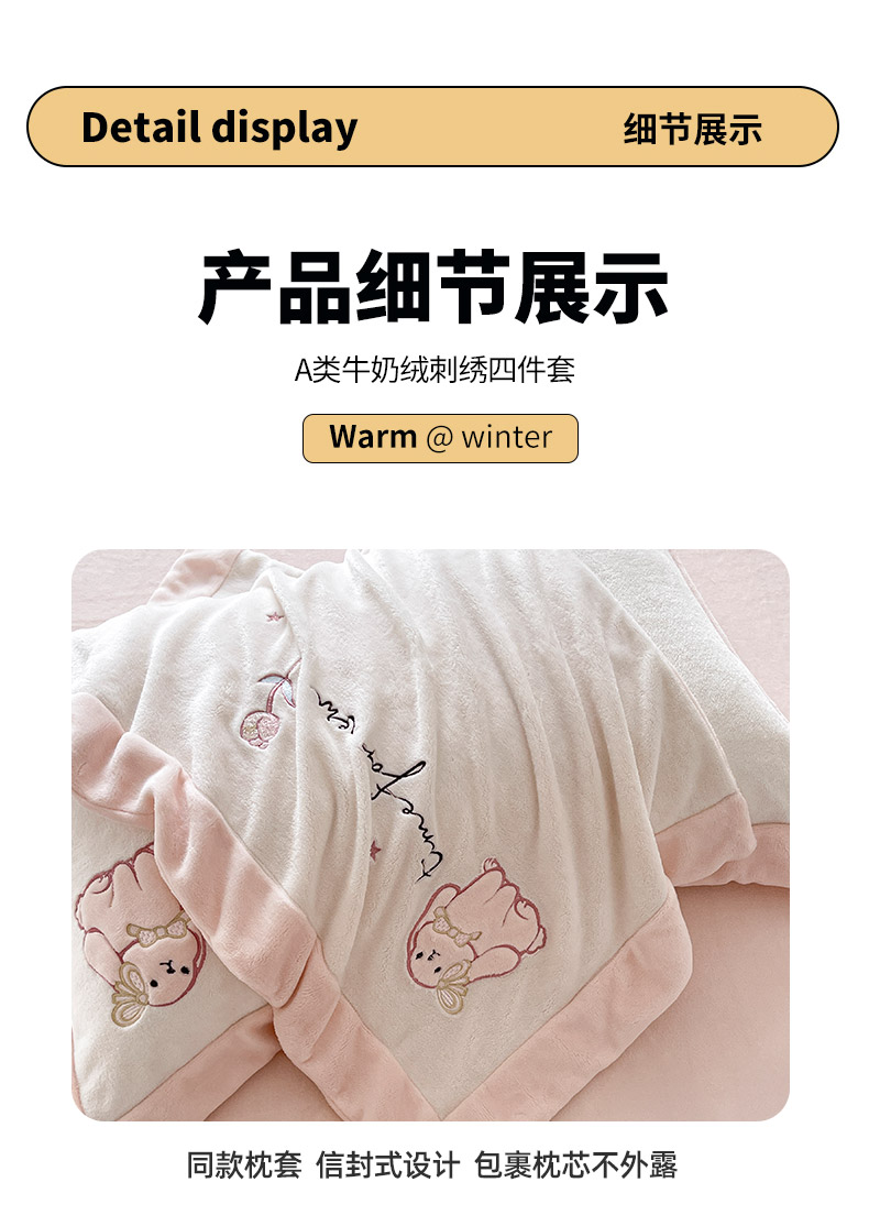 商品名称: 2025冬季爆款A类加厚牛奶绒四件套保暖双面加绒珊瑚绒重工刺绣被套床单卡通床上用品 萌兔-白粉
