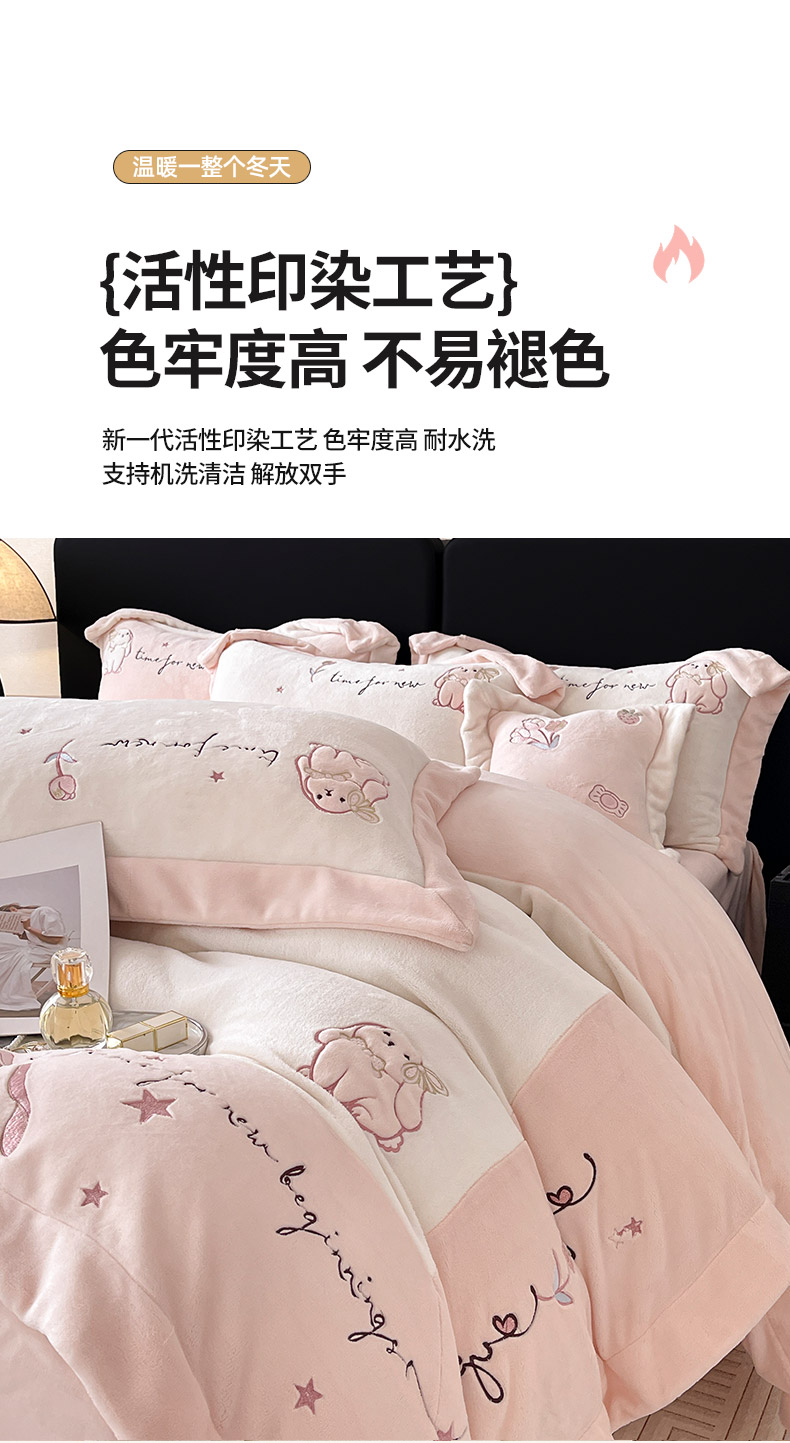 2025冬季爆款A类加厚牛奶绒四件套保暖双面加绒珊瑚绒重工刺绣被套床单卡通床上用品 萌兔-白粉