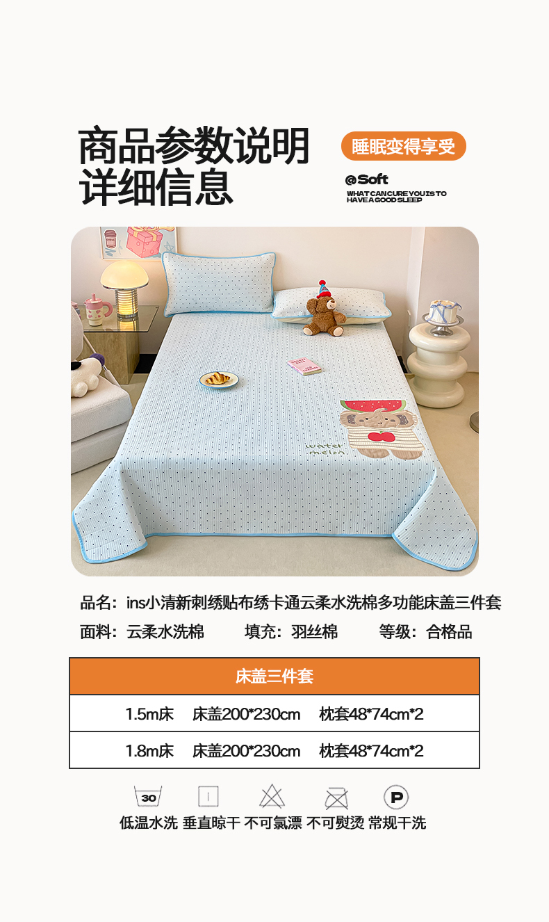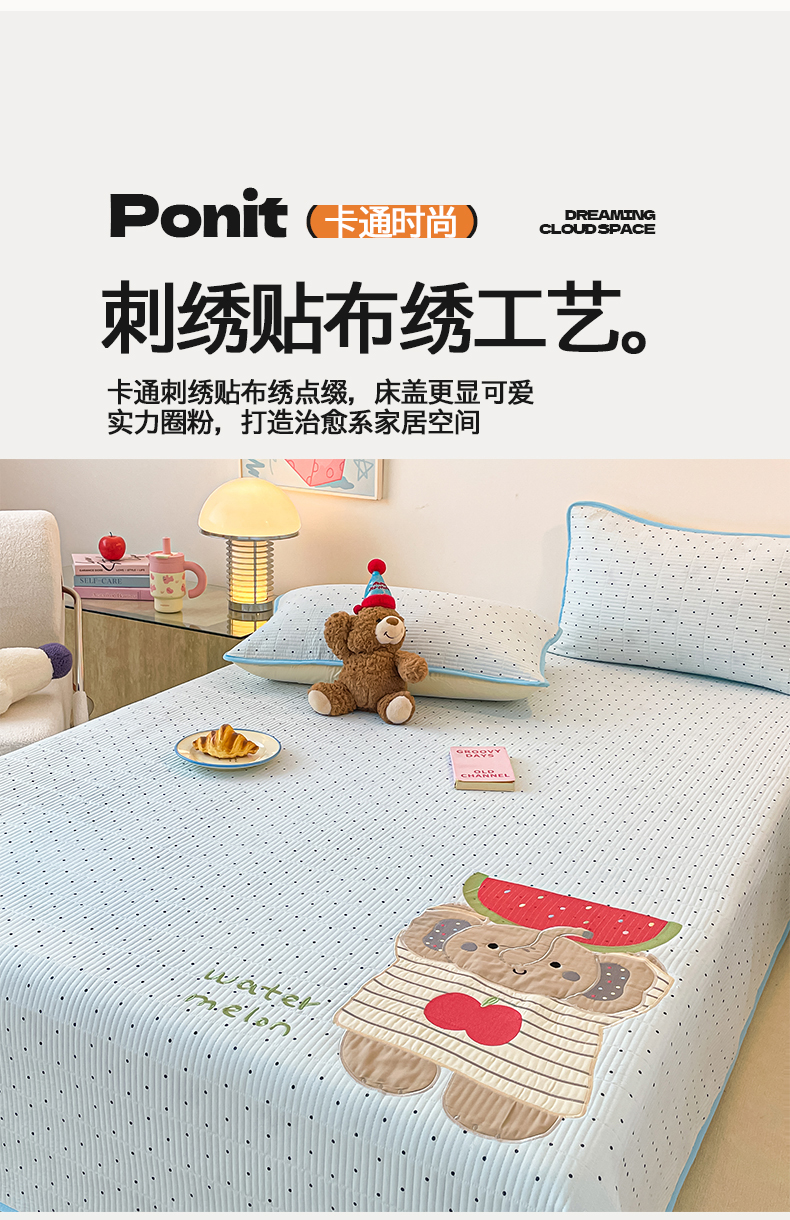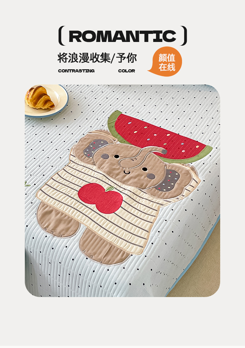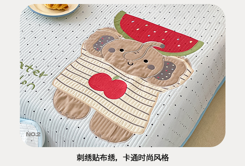 商品名称:桃心家居 2025新款ins小清新刺绣贴布绣卡通云柔水洗棉多功能床盖三件套 水洗棉床盖-西瓜象