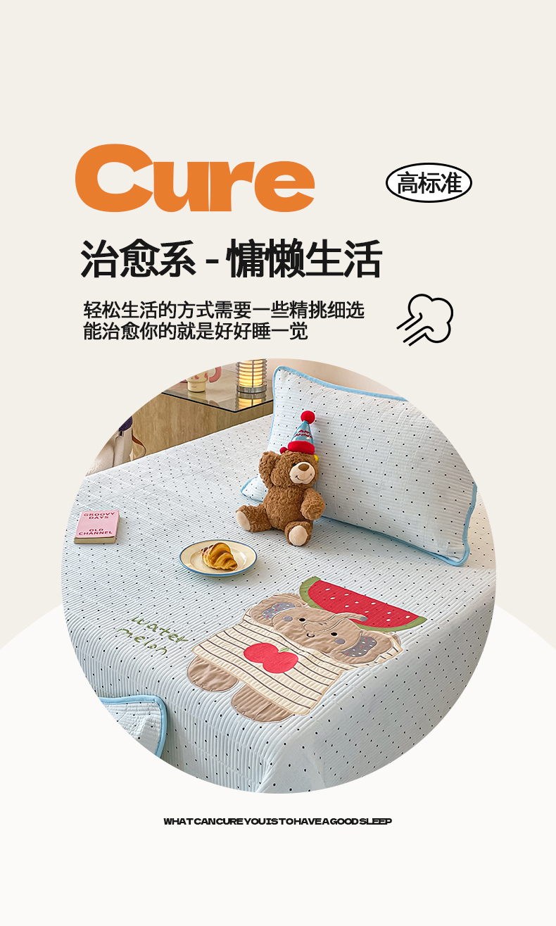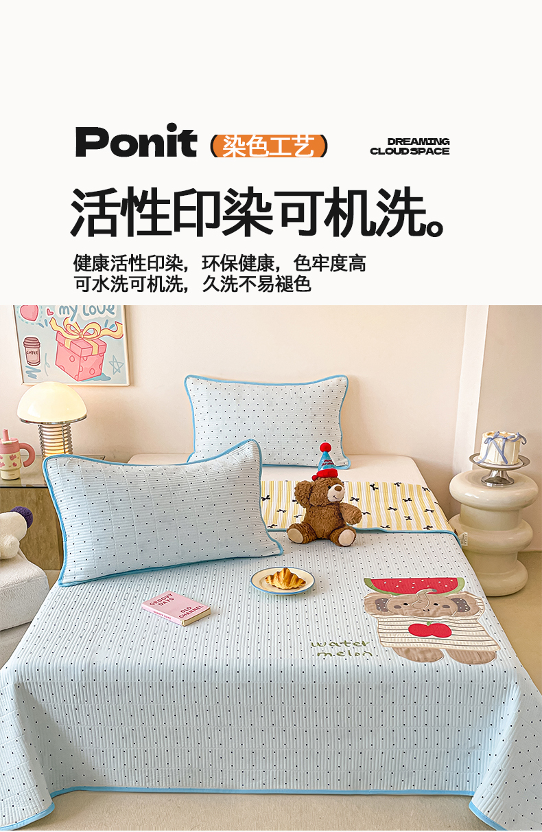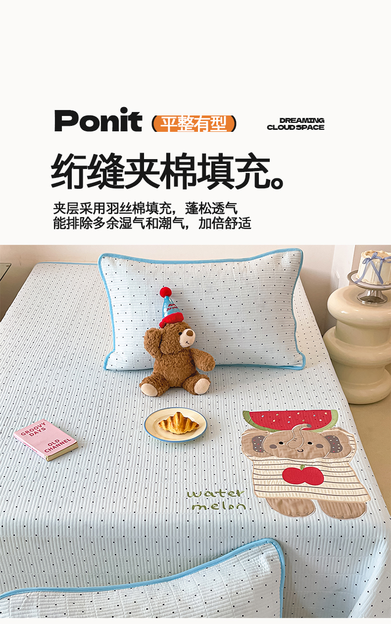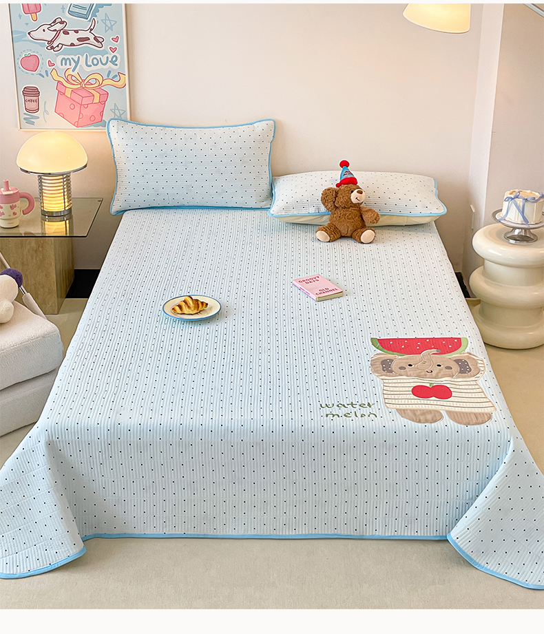 商品名称:桃心家居 2025新款ins小清新刺绣贴布绣卡通云柔水洗棉多功能床盖三件套 水洗棉床盖-西瓜象