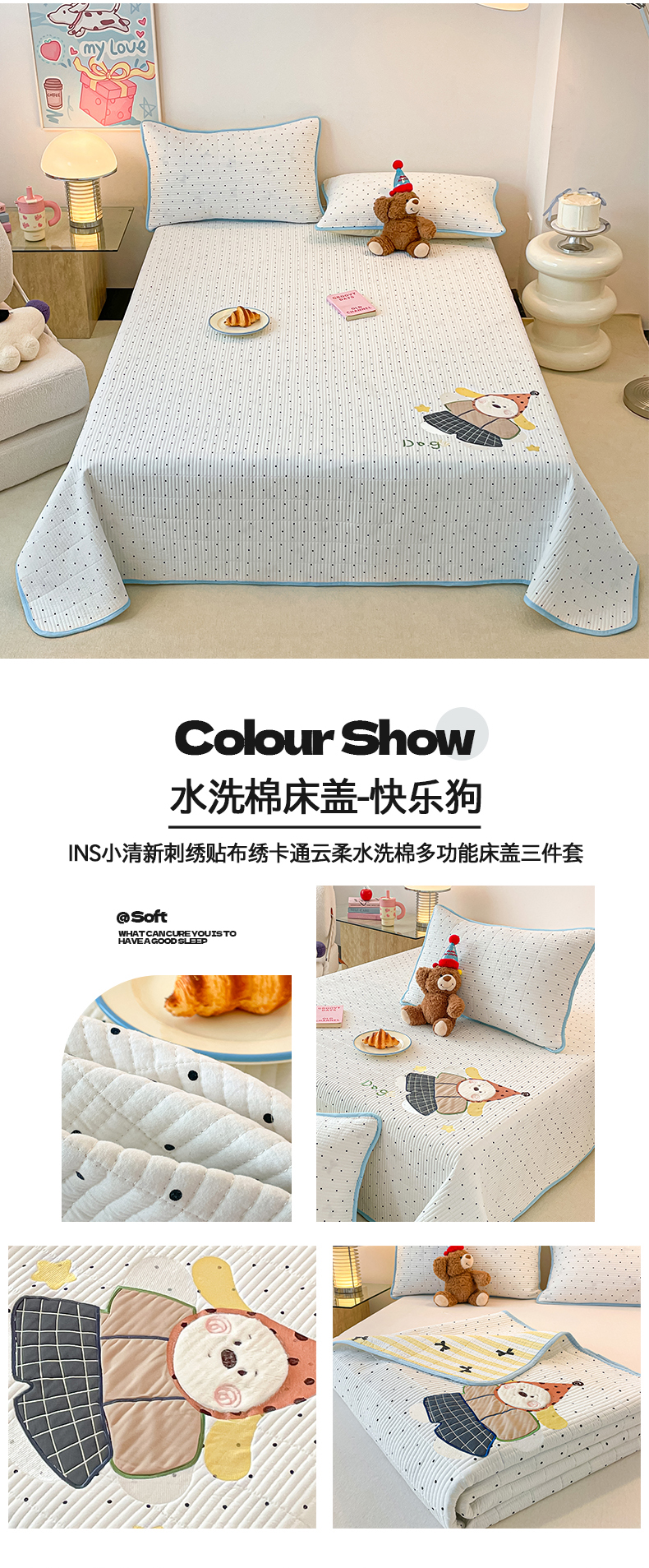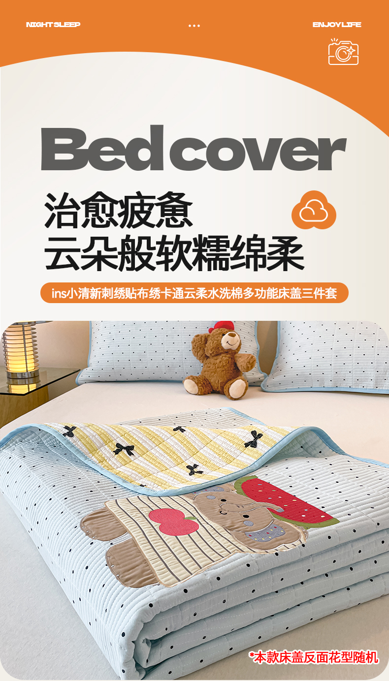 (总)桃心家居 2025新款ins小清新刺绣贴布绣卡通云柔水洗棉多功能床盖三件套,组合图仅供展示不可下单,水洗棉床盖-草莓兔,水洗棉床盖-可爱女孩,水洗棉床盖-快乐狗,水洗棉床盖-西瓜象