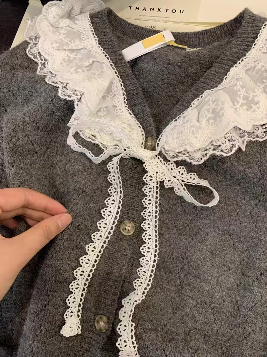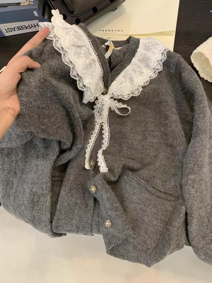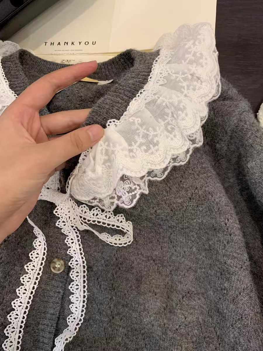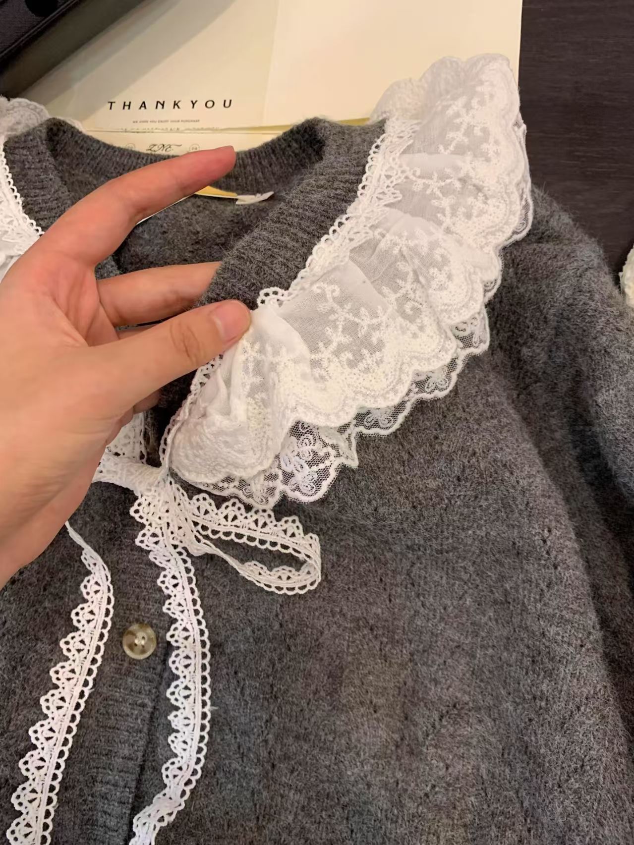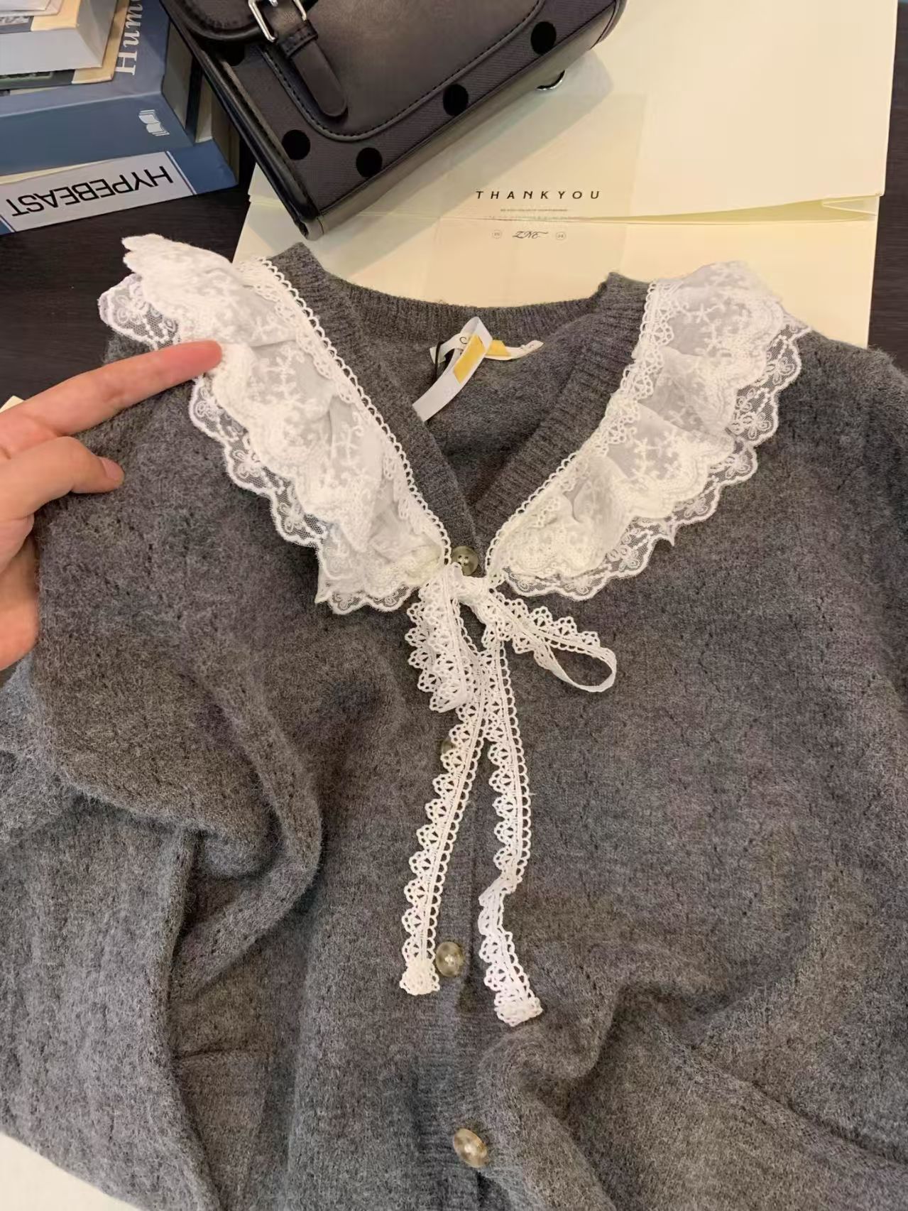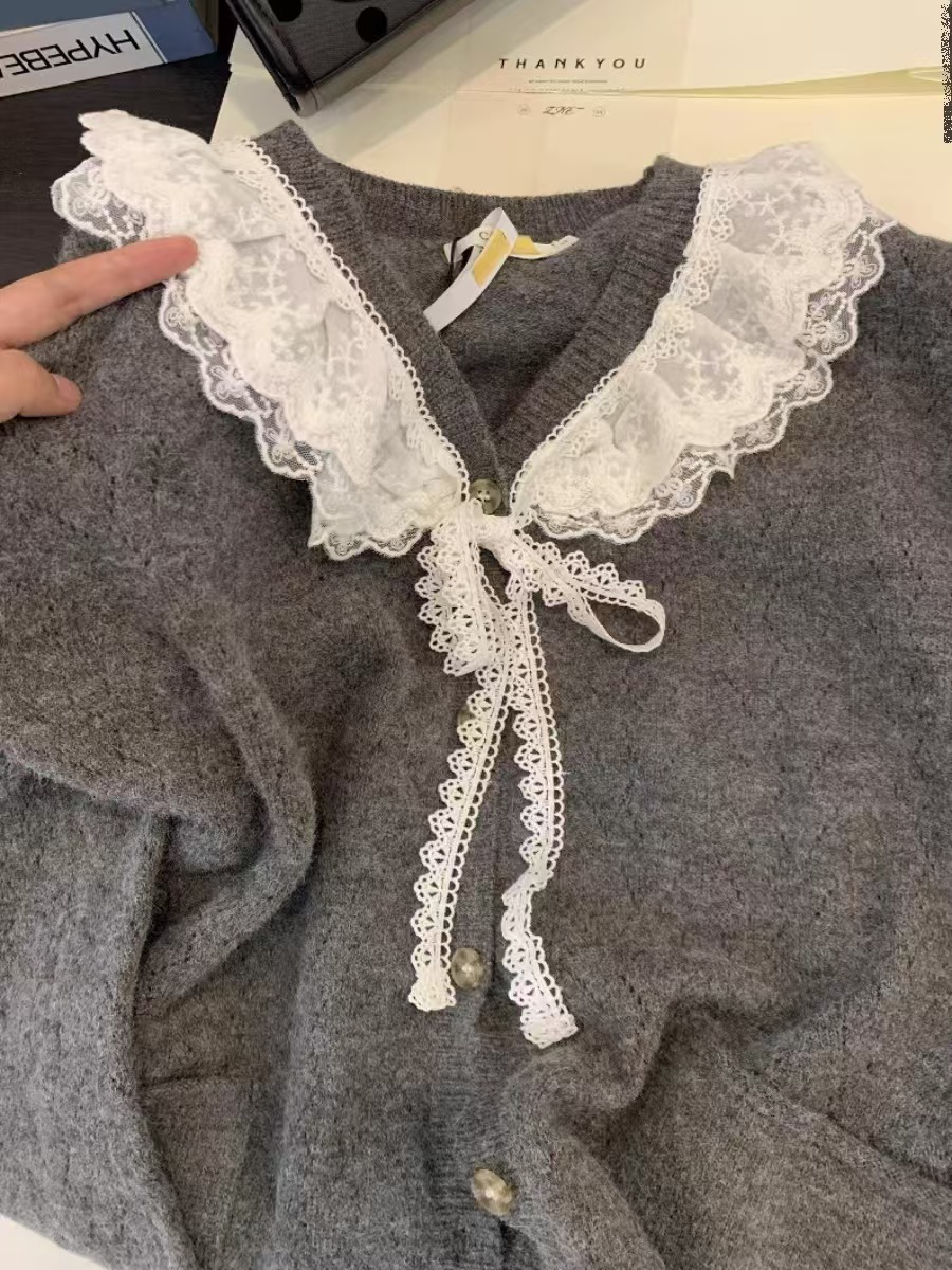 (总)洛兰沙家居馆 只代发小香风毛衣女春秋慵懒可爱甜美蕾丝圆领针织开衫短款外套温柔上衣