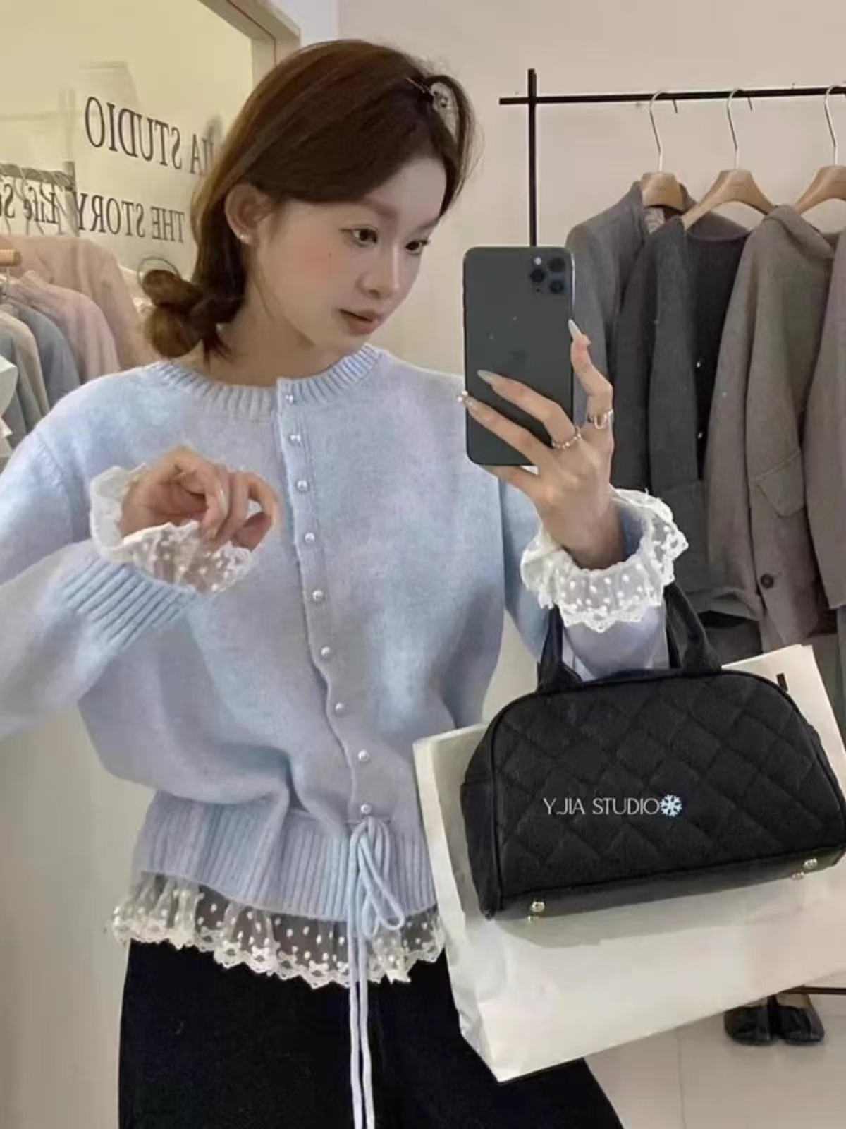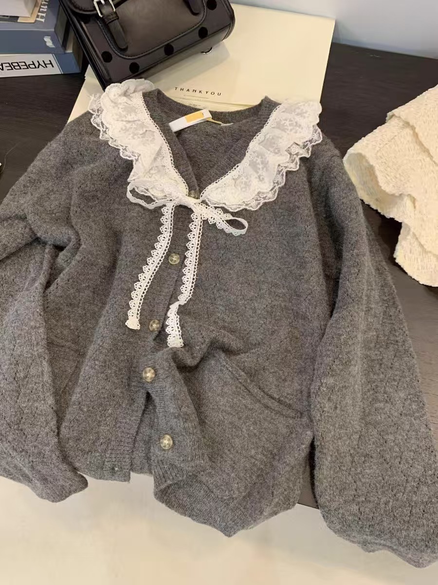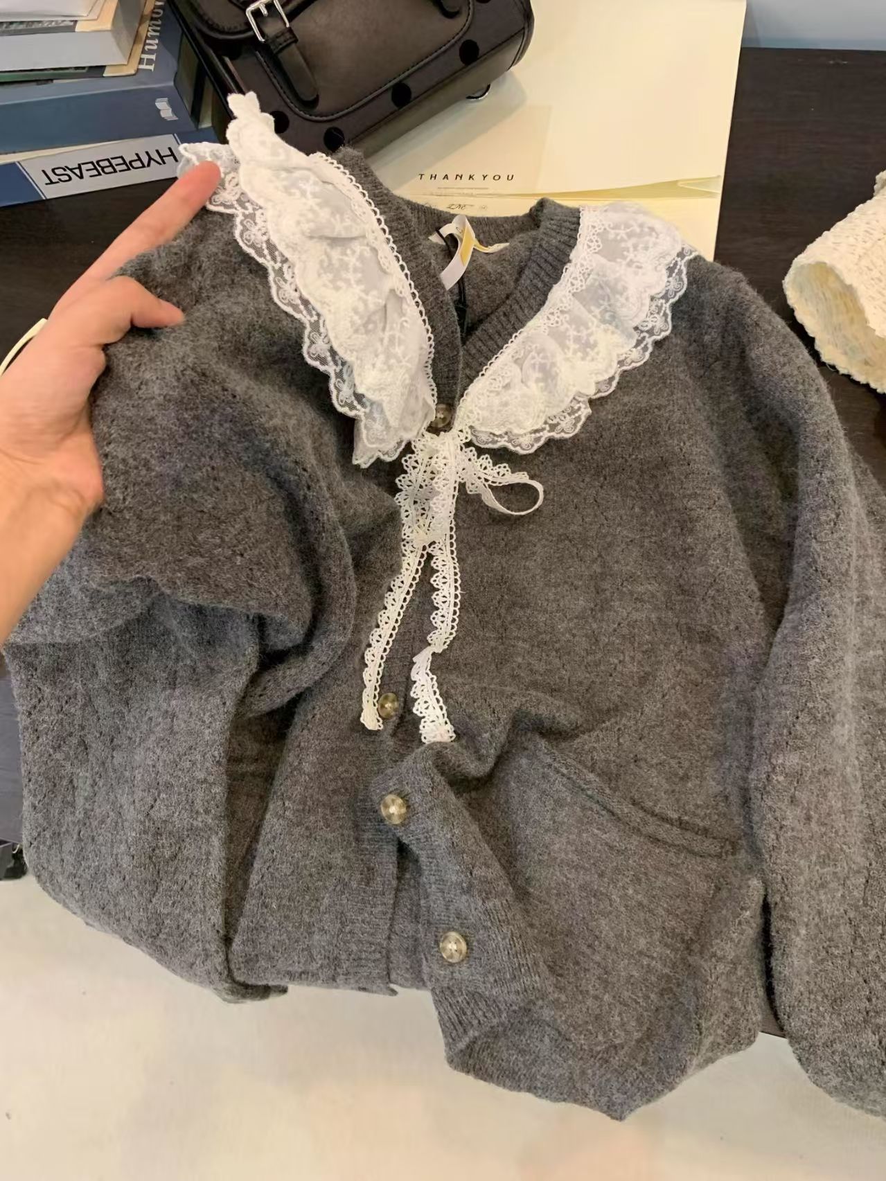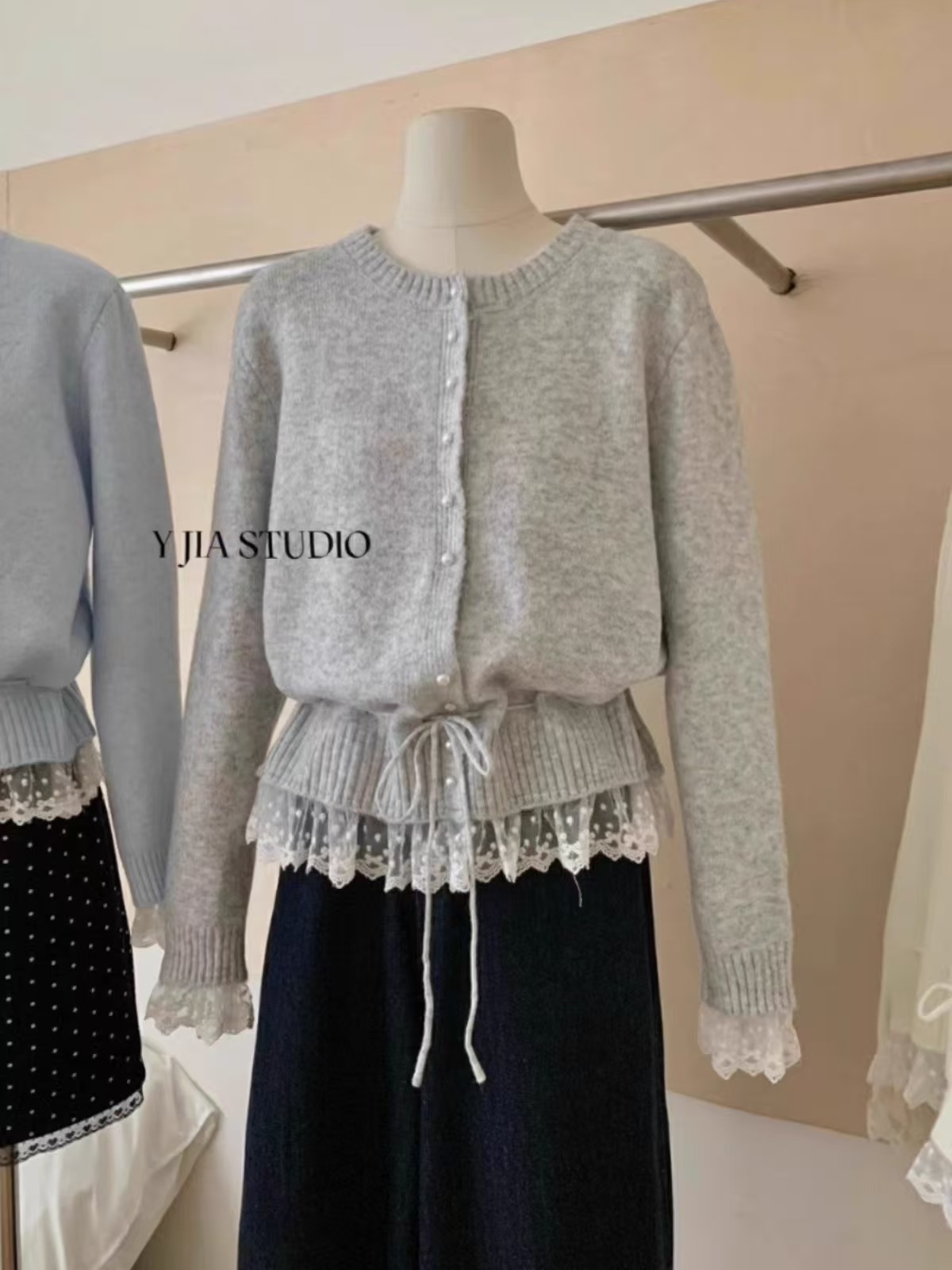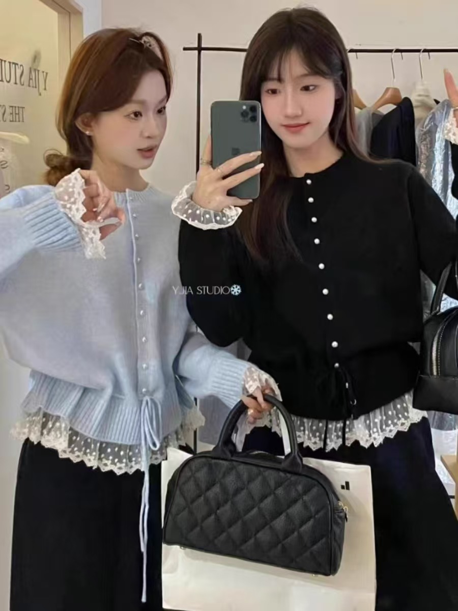 (总)洛兰沙家居馆 只代发小香风毛衣女春秋慵懒可爱甜美蕾丝圆领针织开衫短款外套温柔上衣