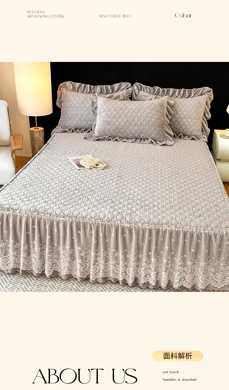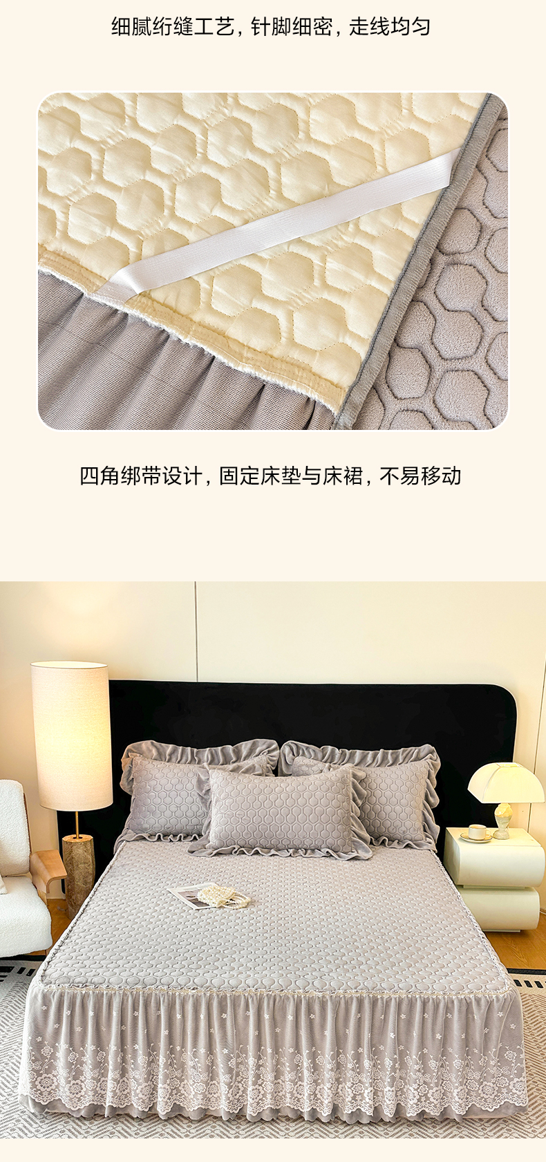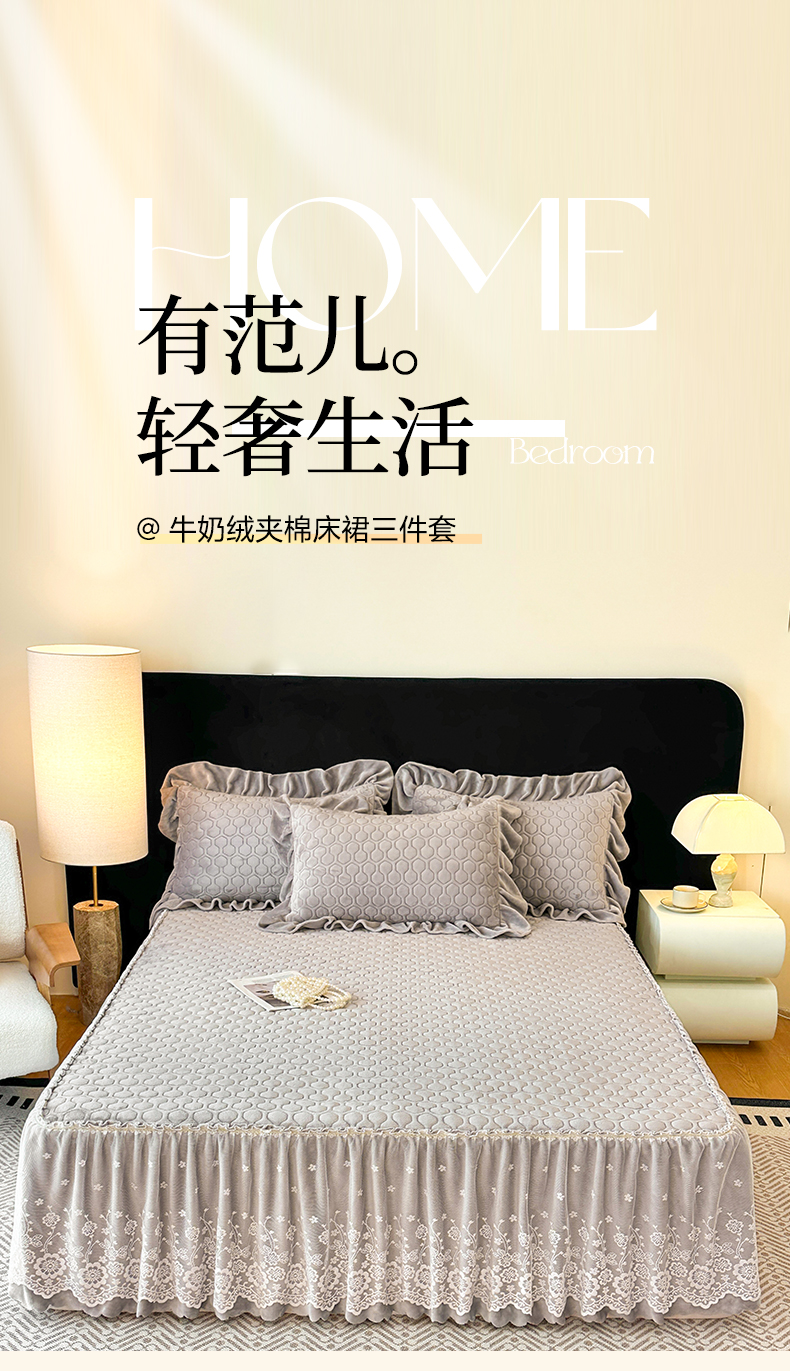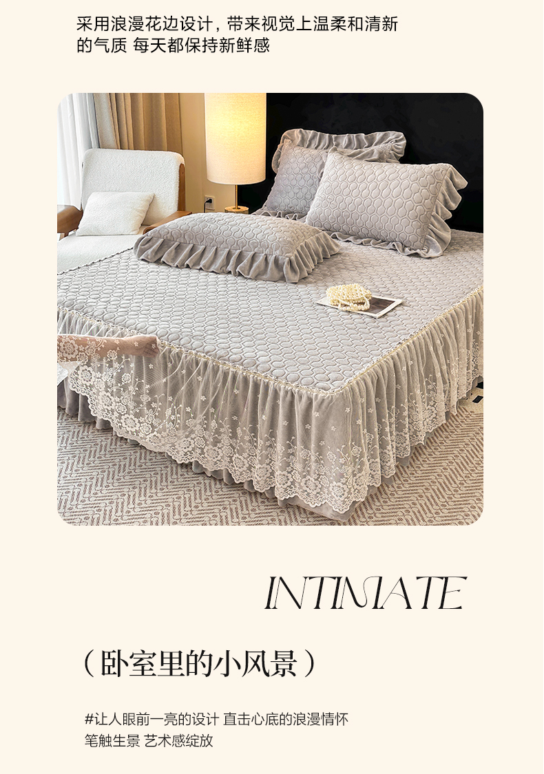 当前位置: 91家纺网 > 商品网购 > 床品套件 > 三件套 > 民新家纺 2025新款牛奶绒夹棉床裙三件套 浪漫时光-灰