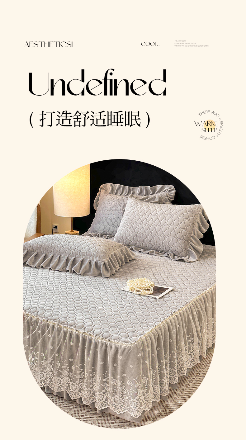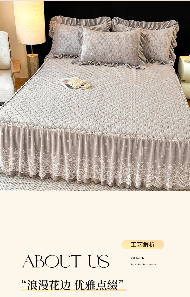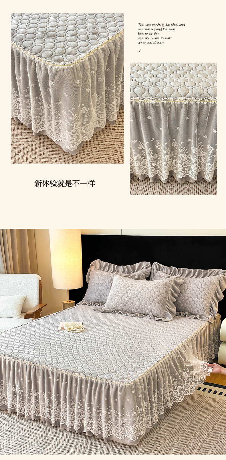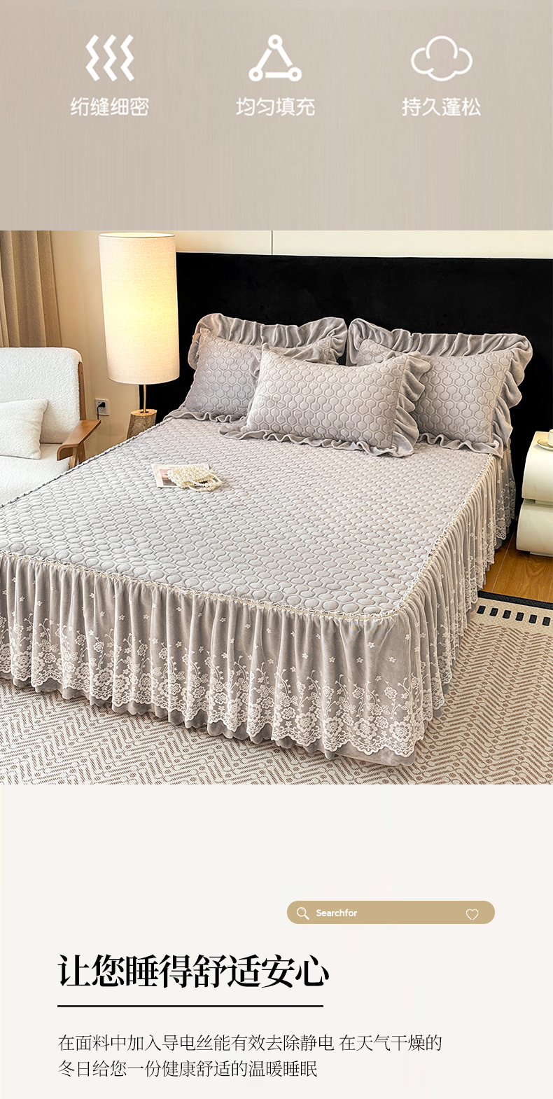 当前位置: 91家纺网 > 商品网购 > 床品套件 > 三件套 > 民新家纺 2025新款牛奶绒夹棉床裙三件套 浪漫时光-灰
