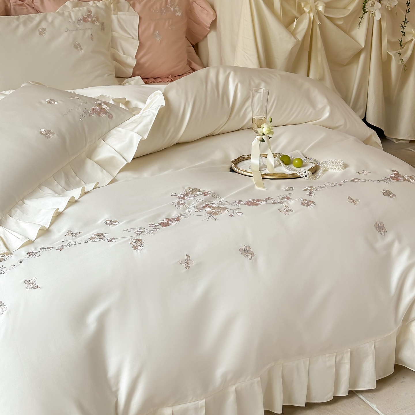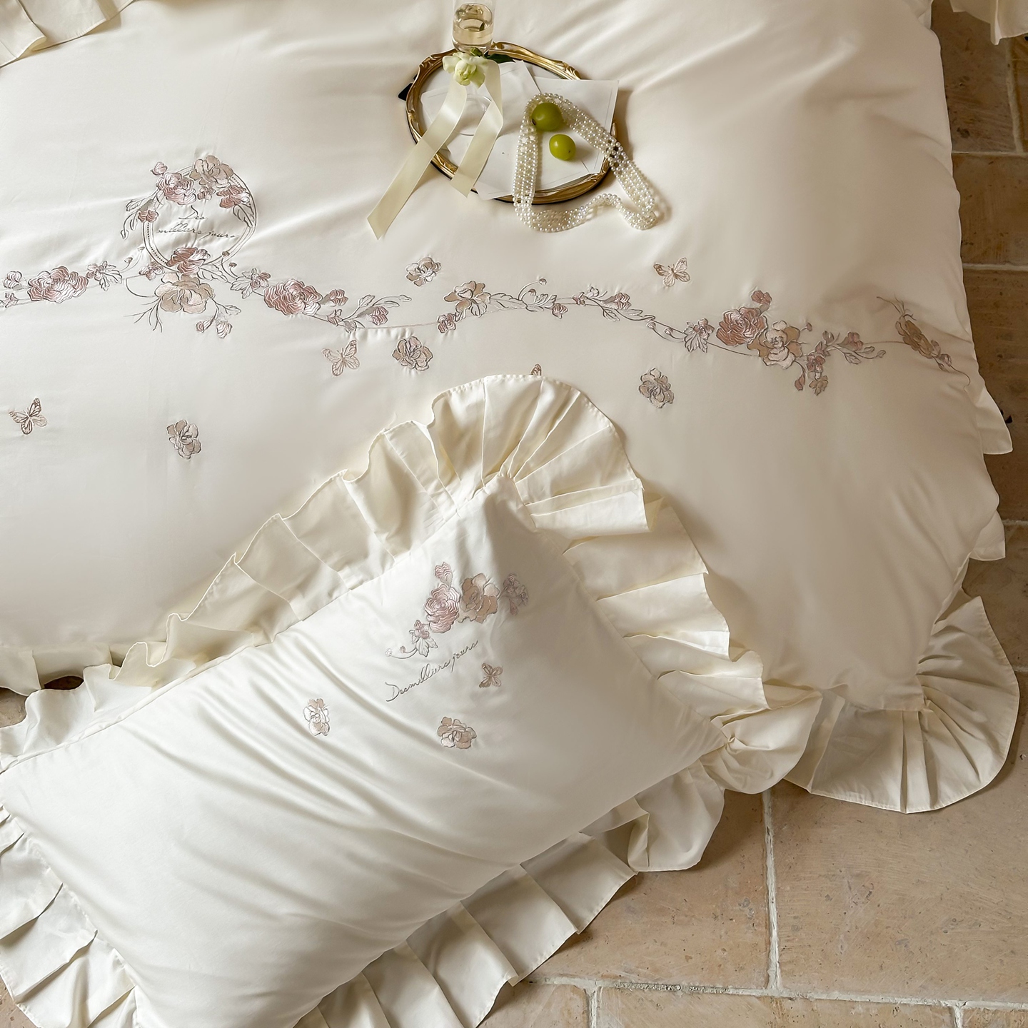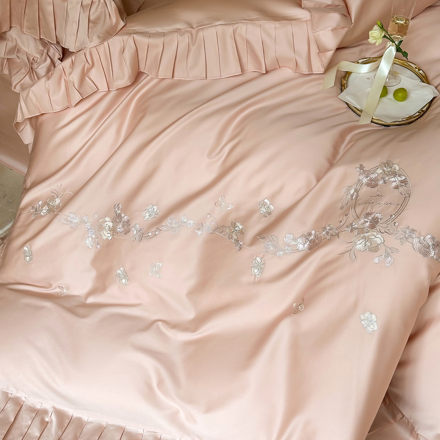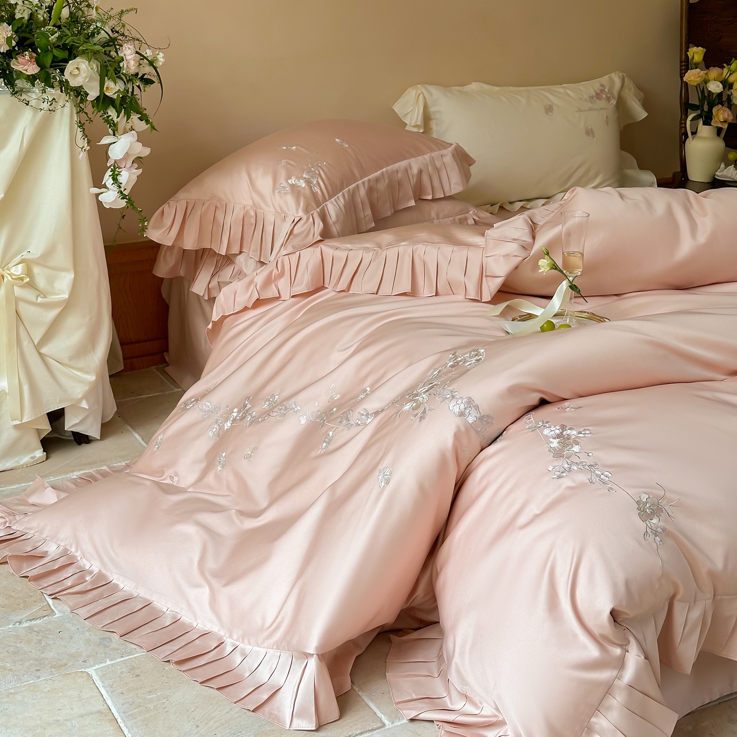 窝米 2025新款长绒棉纯棉荷叶边100支刺绣工艺款四件套-玫瑰园 玫瑰园-粉