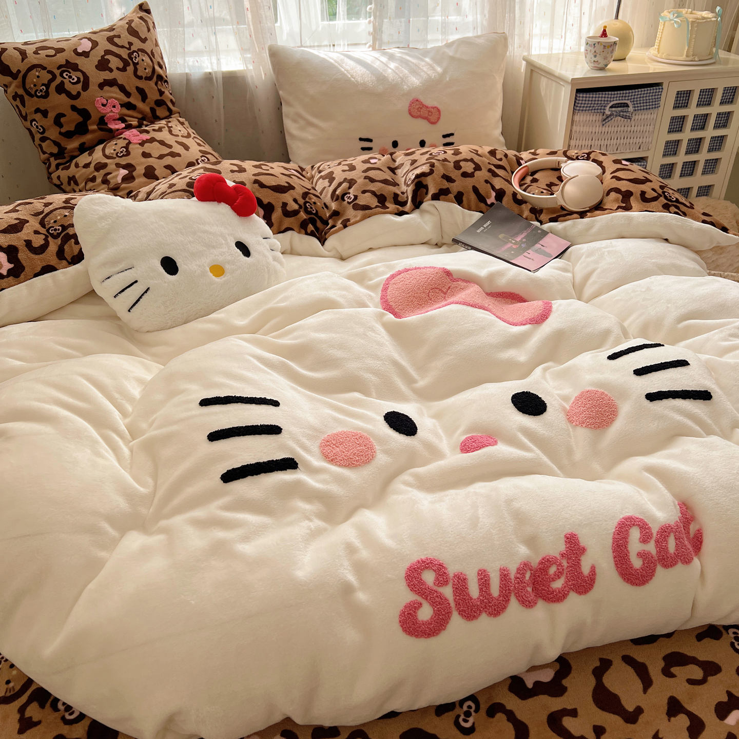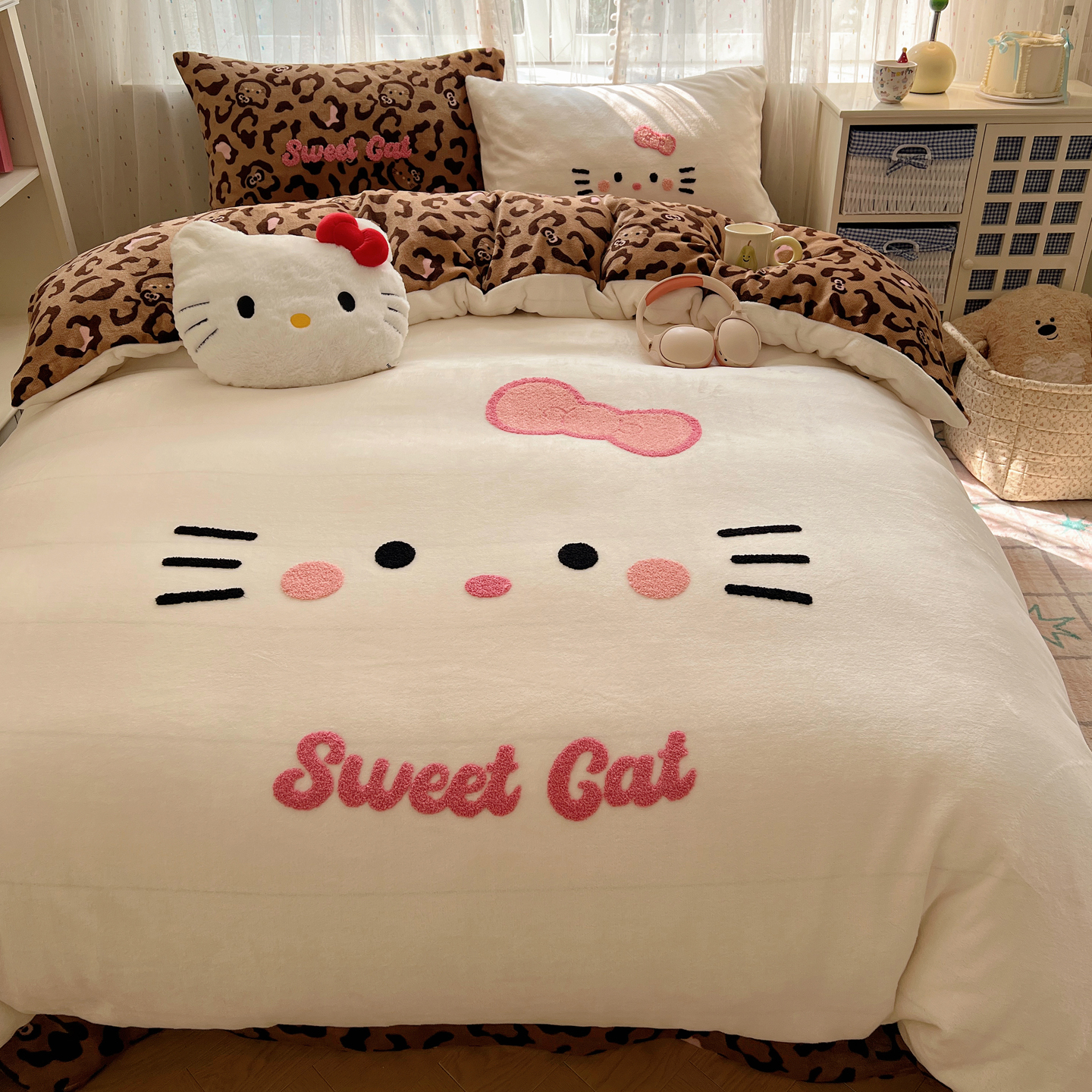 (总)顾里家纺 2024新款印花牛奶绒毛巾绣四件套,爱心花猫,蛋糕花猫,苹果狗