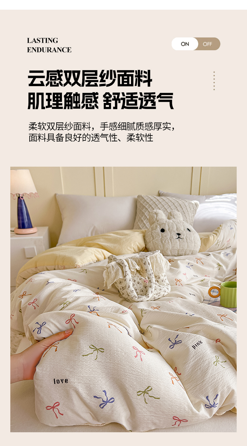 • 91家纺网 家纺一手货源 找家纺 (总)佳鸿家纺 2025新款卡通云感双层纱四件套碎花学生宿舍三件套床单款(提供买家秀),紫花梦境,彩格kt,萌趣小狗,萌宠咖,灰调碎花,粉猫甜心派对,彩色蝴蝶结,蓝格田园风,小熊露营记,小熊甜点乐园