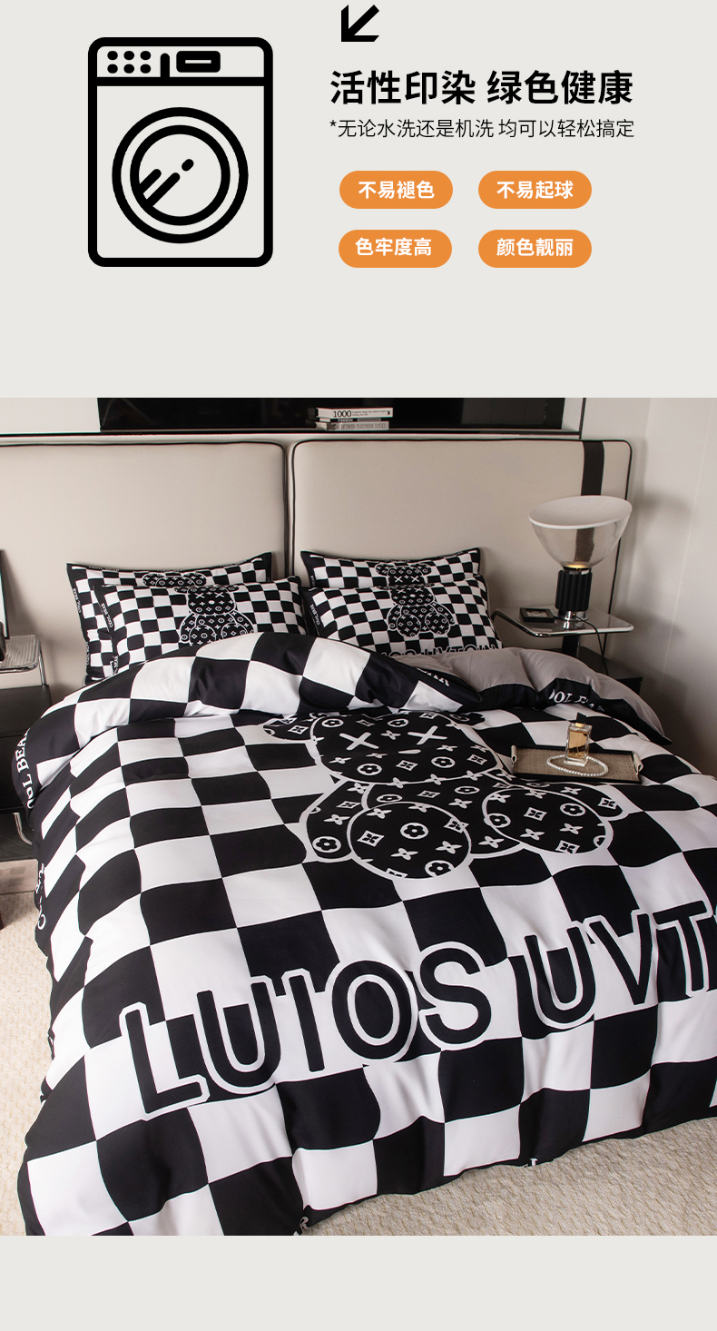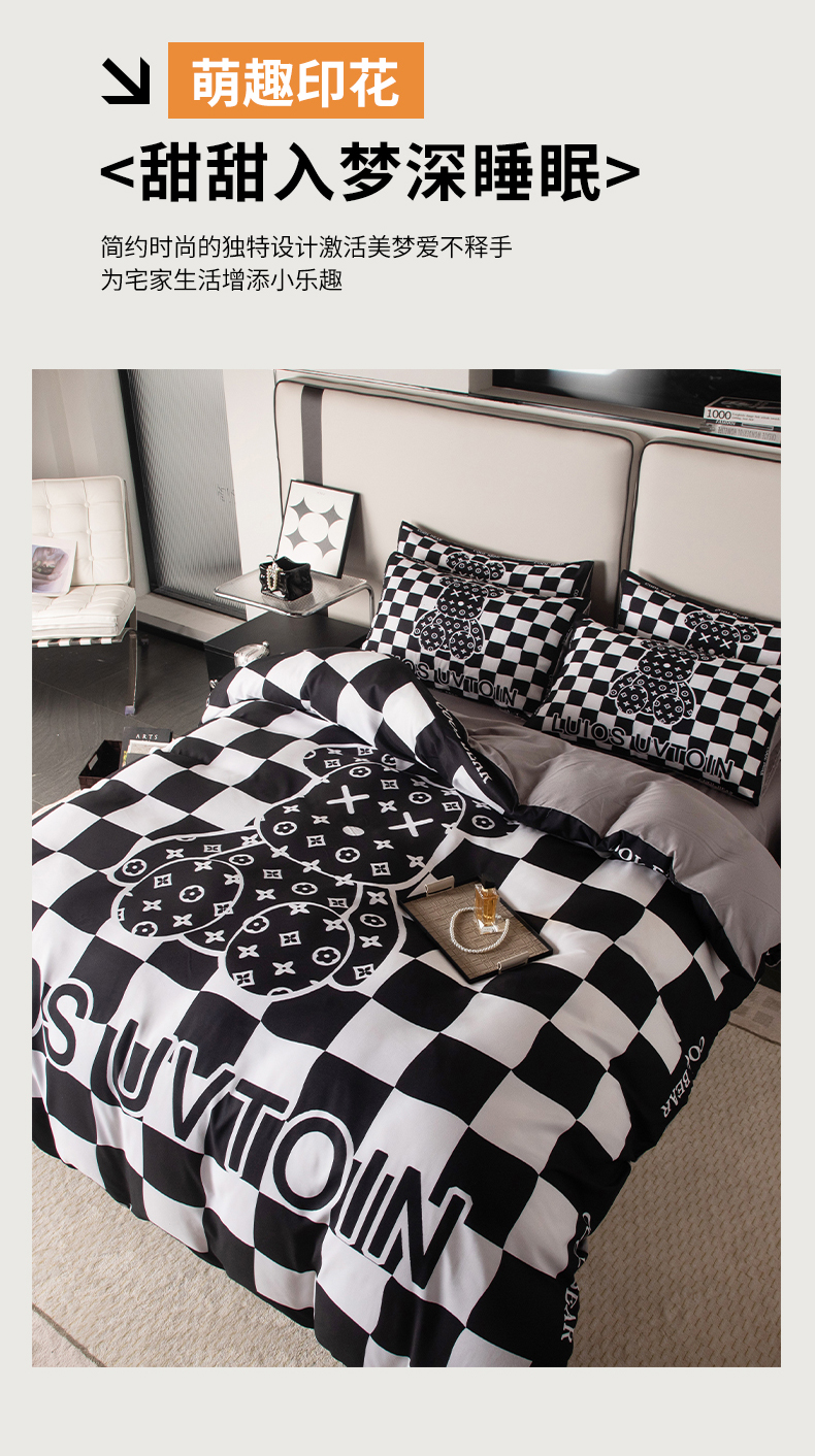 商品名称:色鬼布艺高端家居主号 2025新款直播热款网红款四季棉四件套 棋盘格公仔