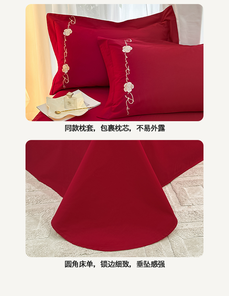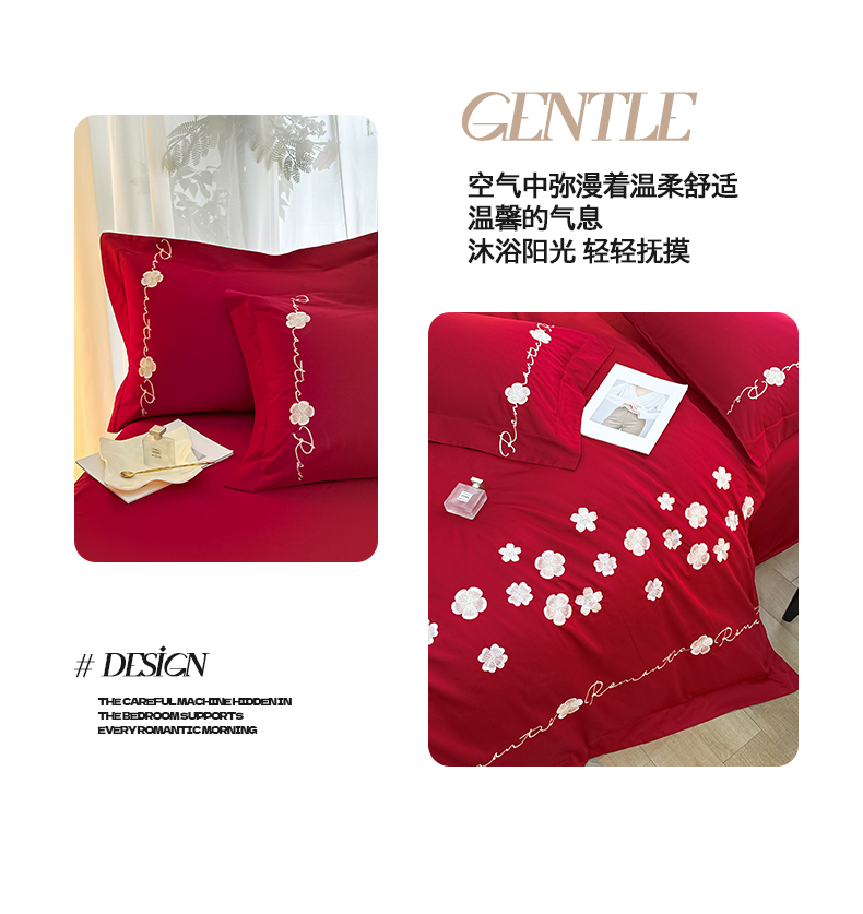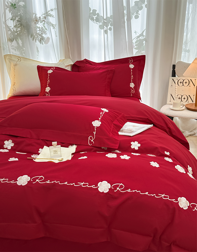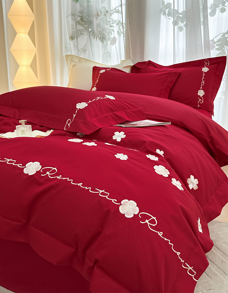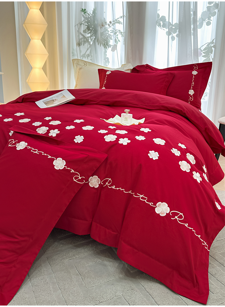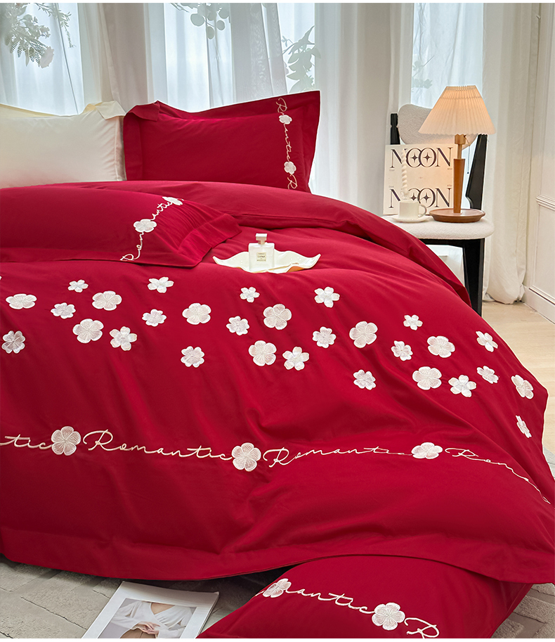 置顶家纺 2025新款全棉纯棉刺绣四件套桃花朵朵系列 桃花朵朵-大红