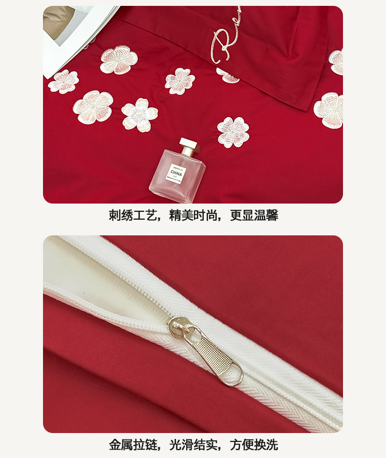 商品名称:置顶家纺 2025新款全棉纯棉刺绣四件套桃花朵朵系列 桃花朵朵-大红