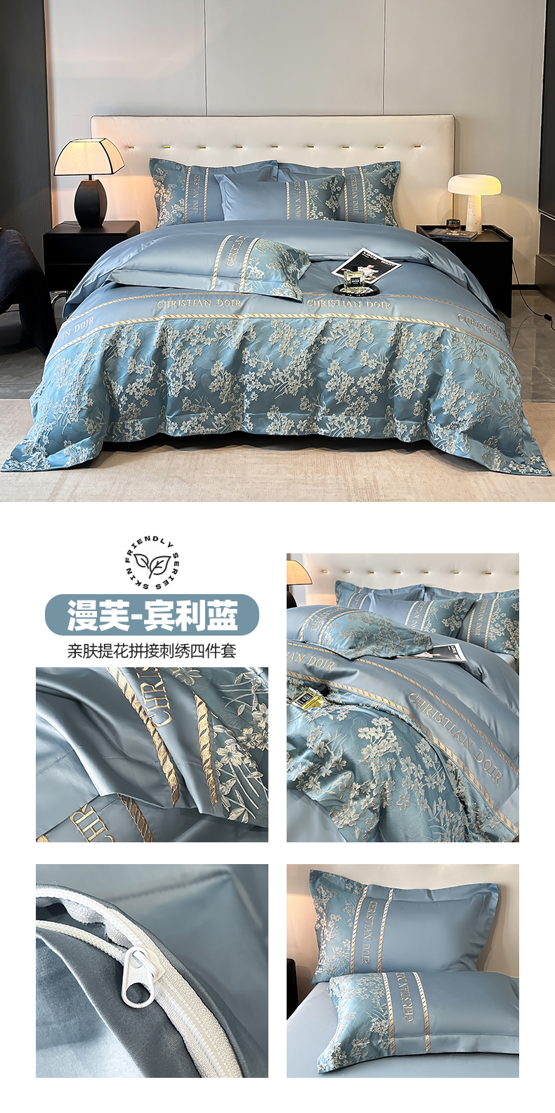 商品名称:置顶家纺 2025新款漫芙提花亲肤系列四件套 漫芙-宾利蓝
