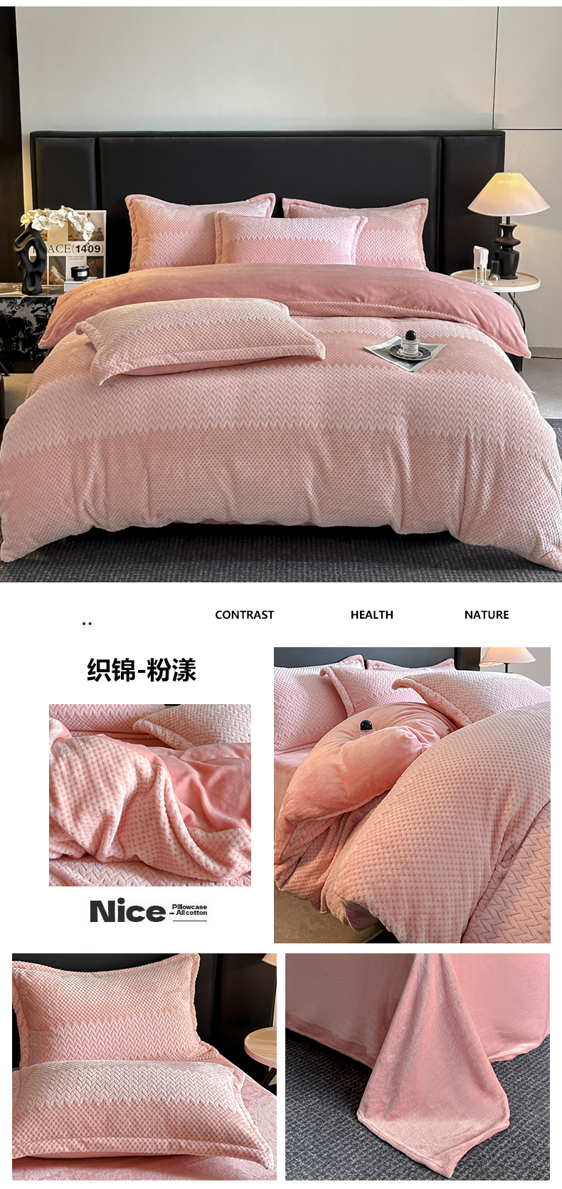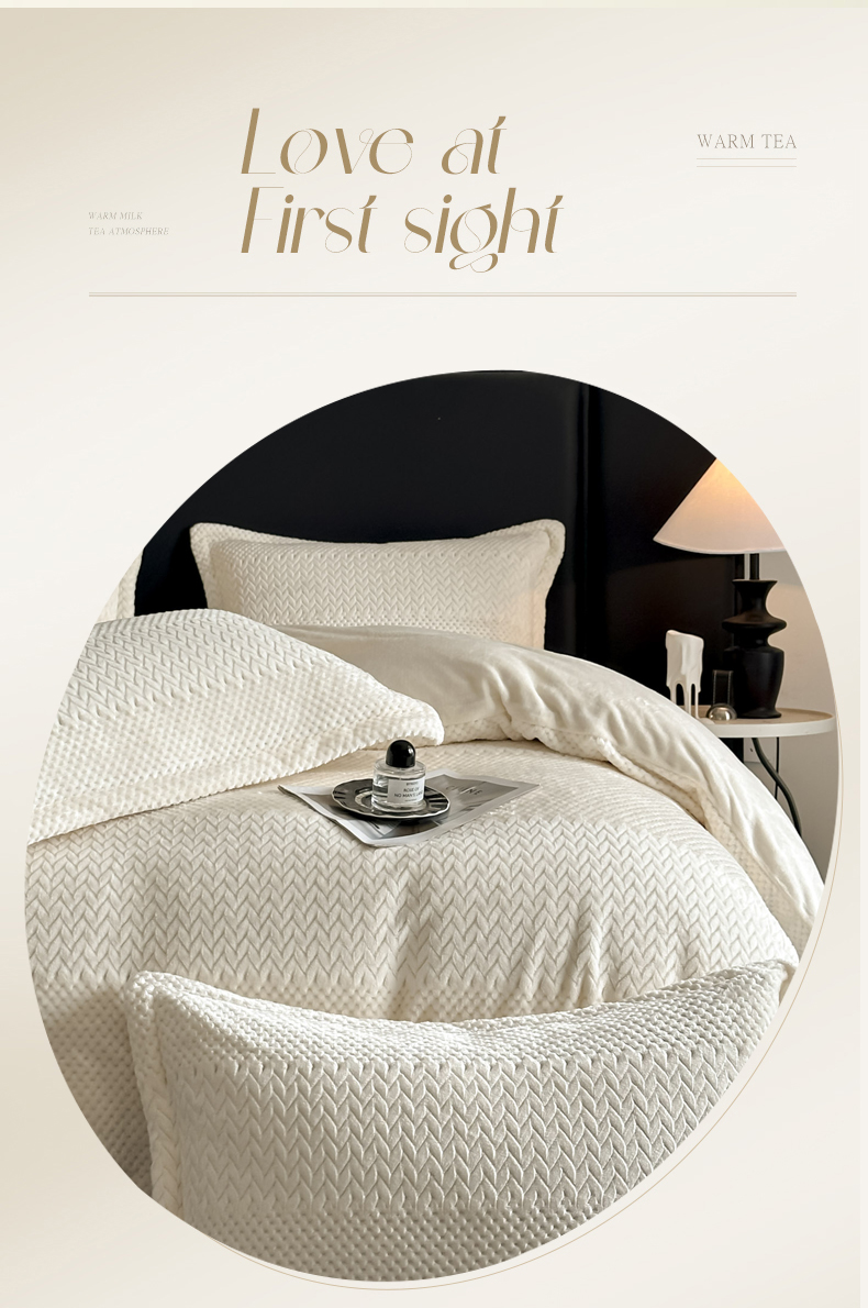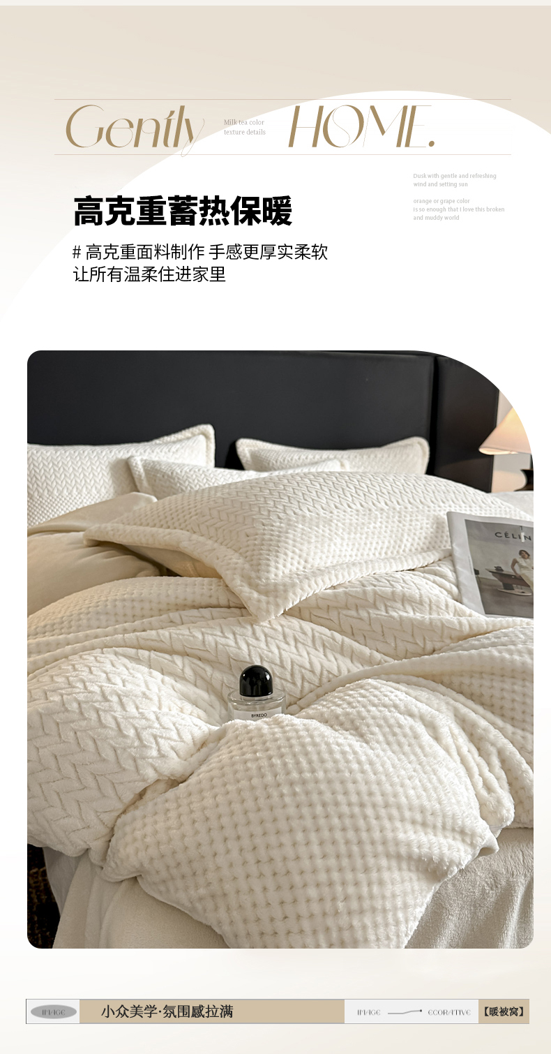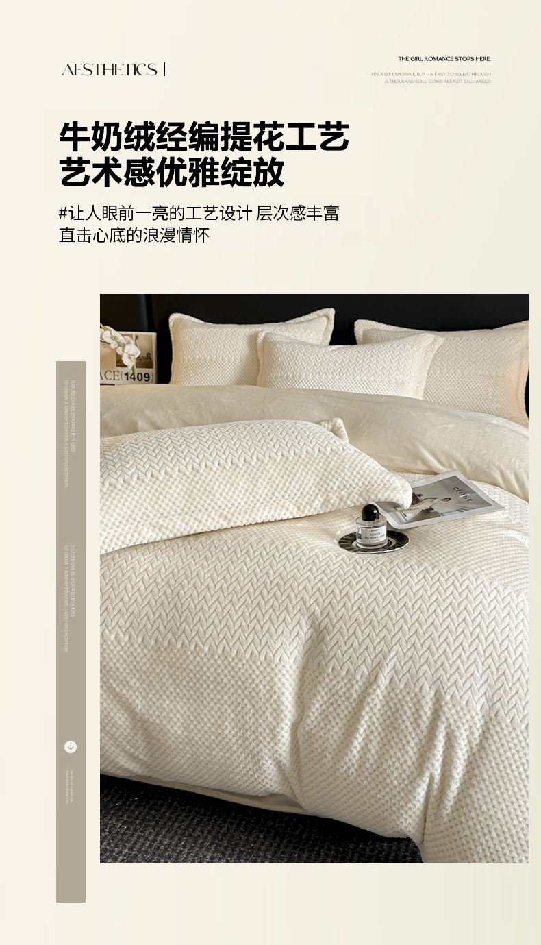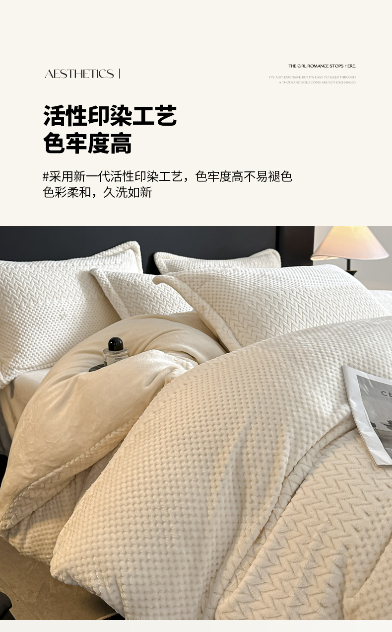 当前位置: 91家纺网 > 商品网购 > 床品套件 > 四件套 > 牛奶绒四件套 > 爱彼家纺 2025冬季新款色织拼色编织提花轻奢牛奶绒四件套-织锦系列 织锦-白露
