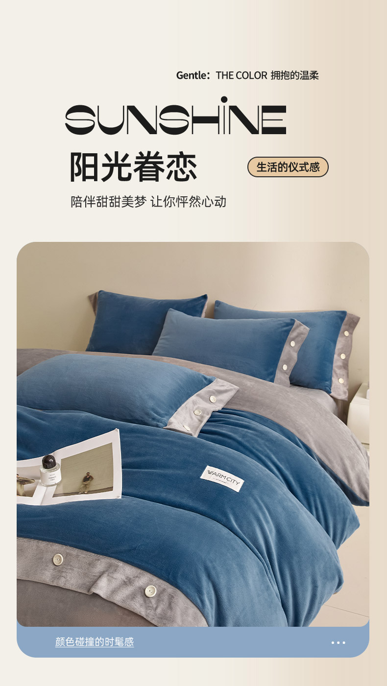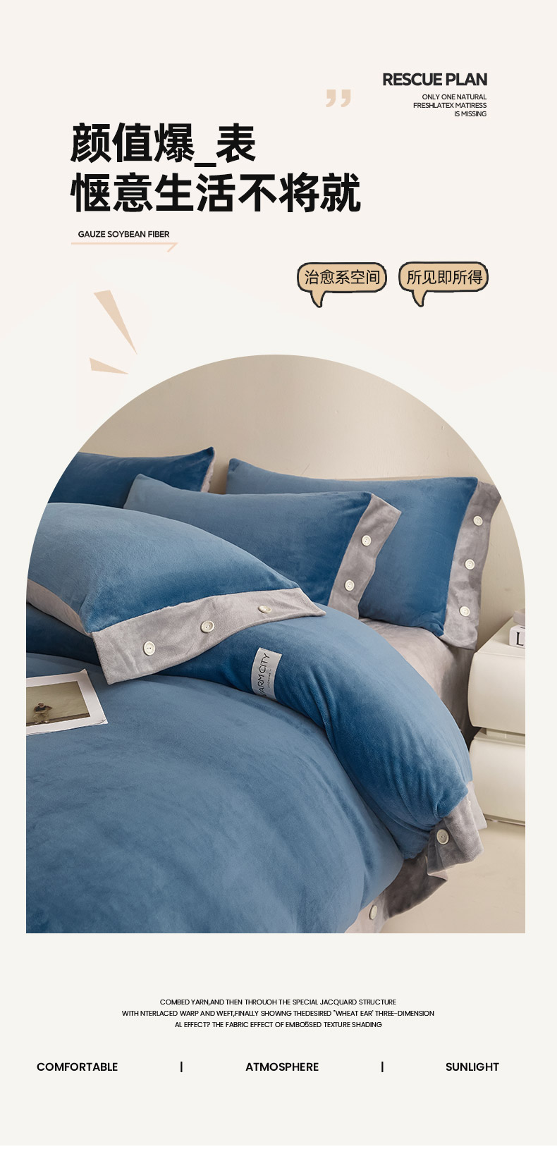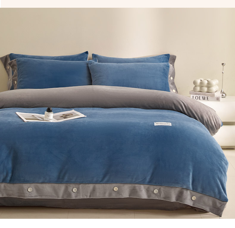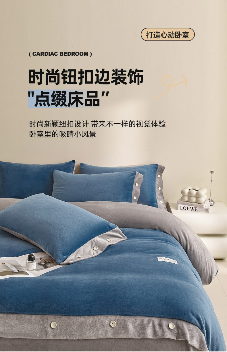 商品名称:吾诺家居 吾诺 2025 双拼色牛奶绒四件套纽扣四件套钮扣牛奶绒四件套 - 纽扣系列 钮扣-景泰蓝