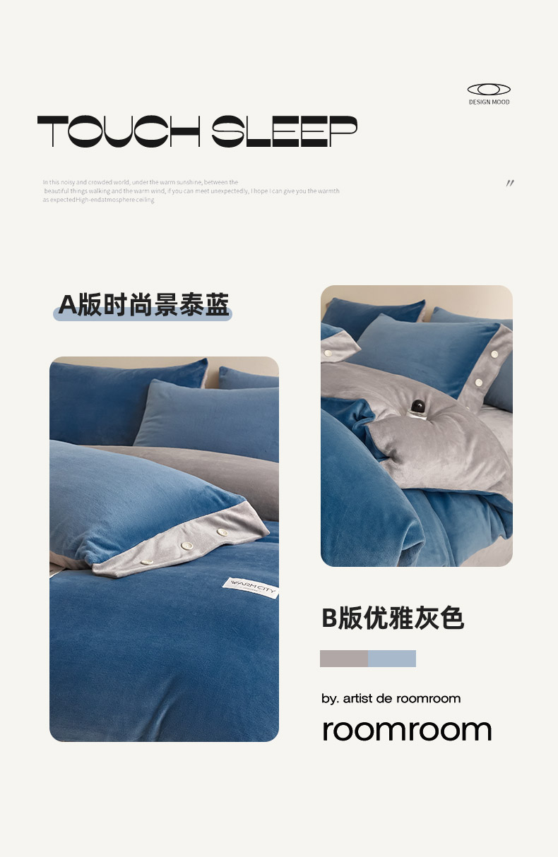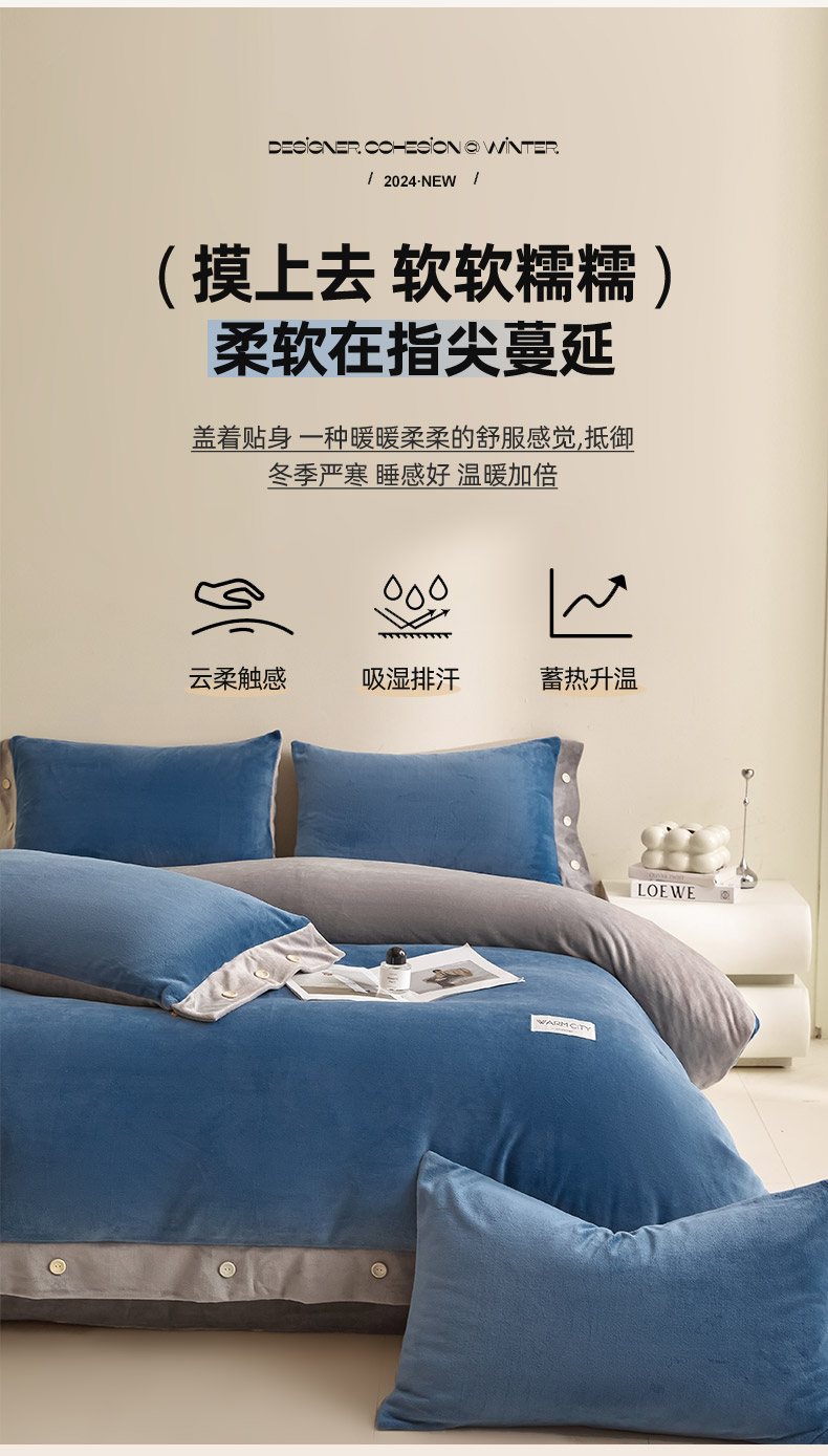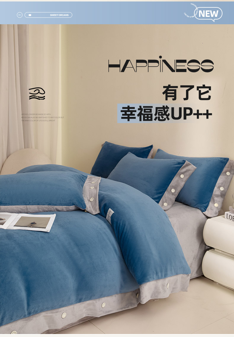 商品名称:吾诺家居 吾诺 2025 双拼色牛奶绒四件套纽扣四件套钮扣牛奶绒四件套 - 纽扣系列 钮扣-景泰蓝