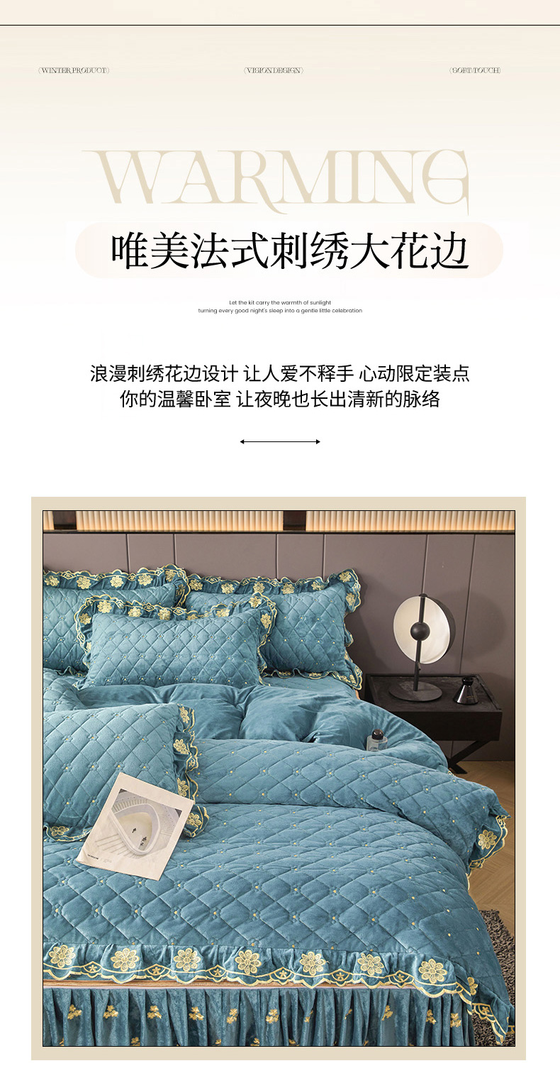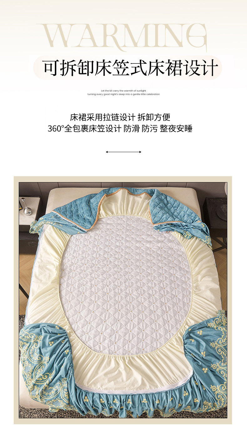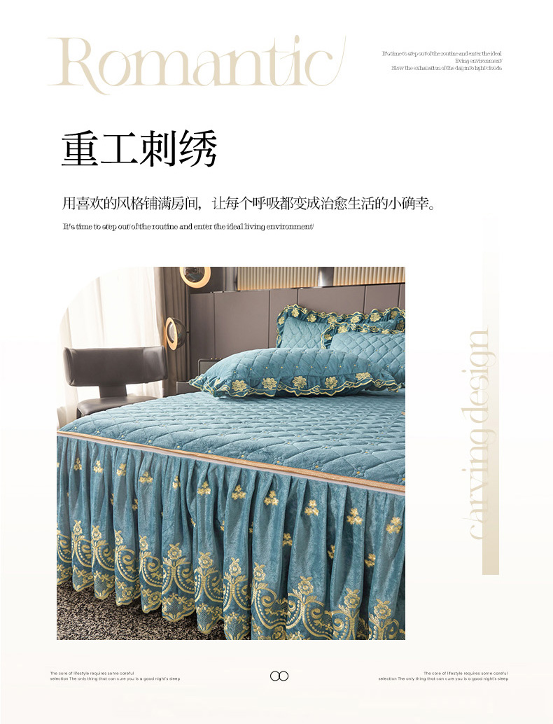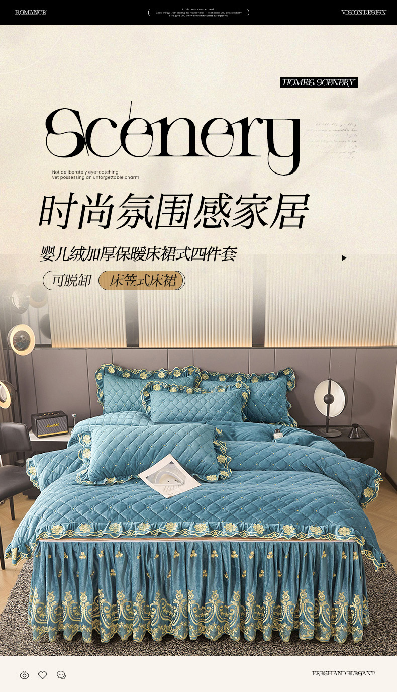 当前位置: 91家纺网 > 商品网购 > 床品套件 > 四件套 > 其它四件套 > 罗艺轩 2025新款婴儿绒加厚保暖床裙式四件套-心语 心语-湖蓝