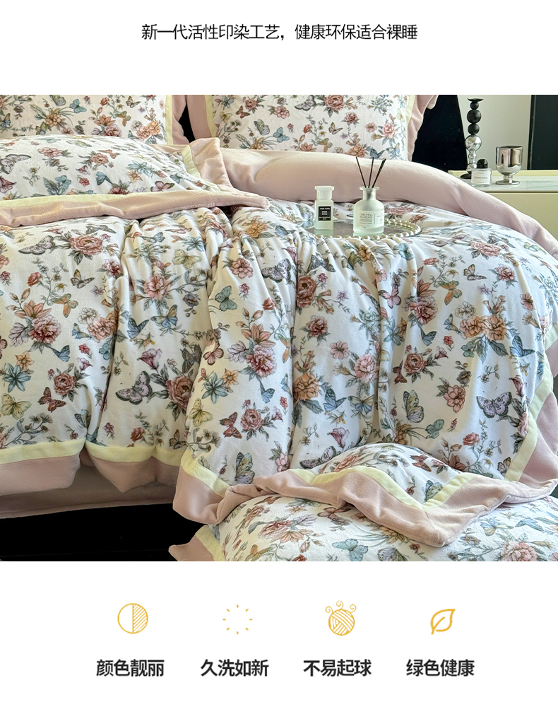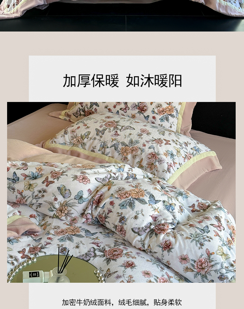 娇逸家居 2025新款高克重A类数码印花牛奶绒双拼边款四件套 浅影