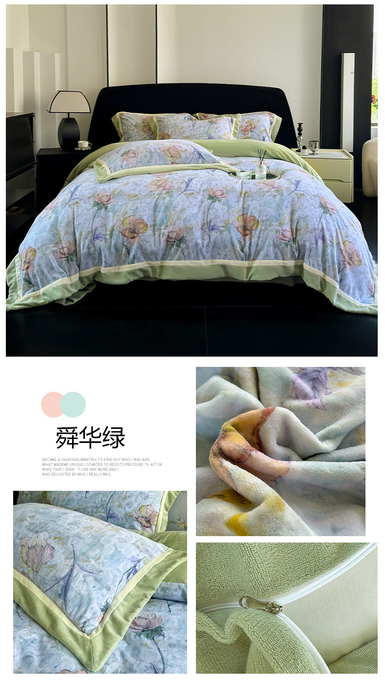 (总)娇逸家居 2025新款高克重A类数码印花牛奶绒双拼边款四件套,采薇灰,扶桑,浅影,秋灵粉,秋灵黄,秋灵绿,舜华粉,采薇米,舜华绿,仙客,栩蝶,璎珞,玉树,芸芙