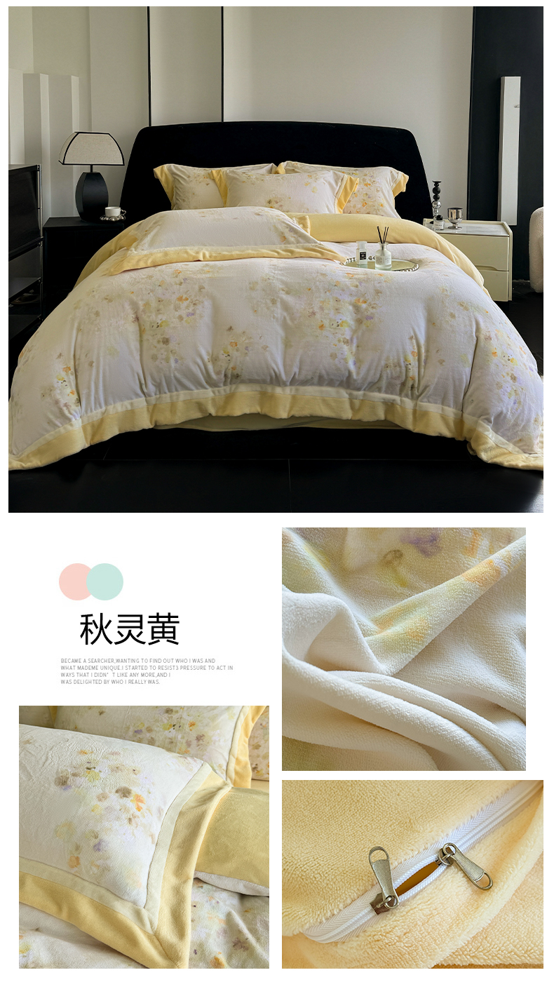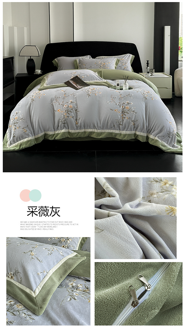 (总)娇逸家居 2025新款高克重A类数码印花牛奶绒双拼边款四件套,采薇灰,扶桑,浅影,秋灵粉,秋灵黄,秋灵绿,舜华粉,采薇米,舜华绿,仙客,栩蝶,璎珞,玉树,芸芙