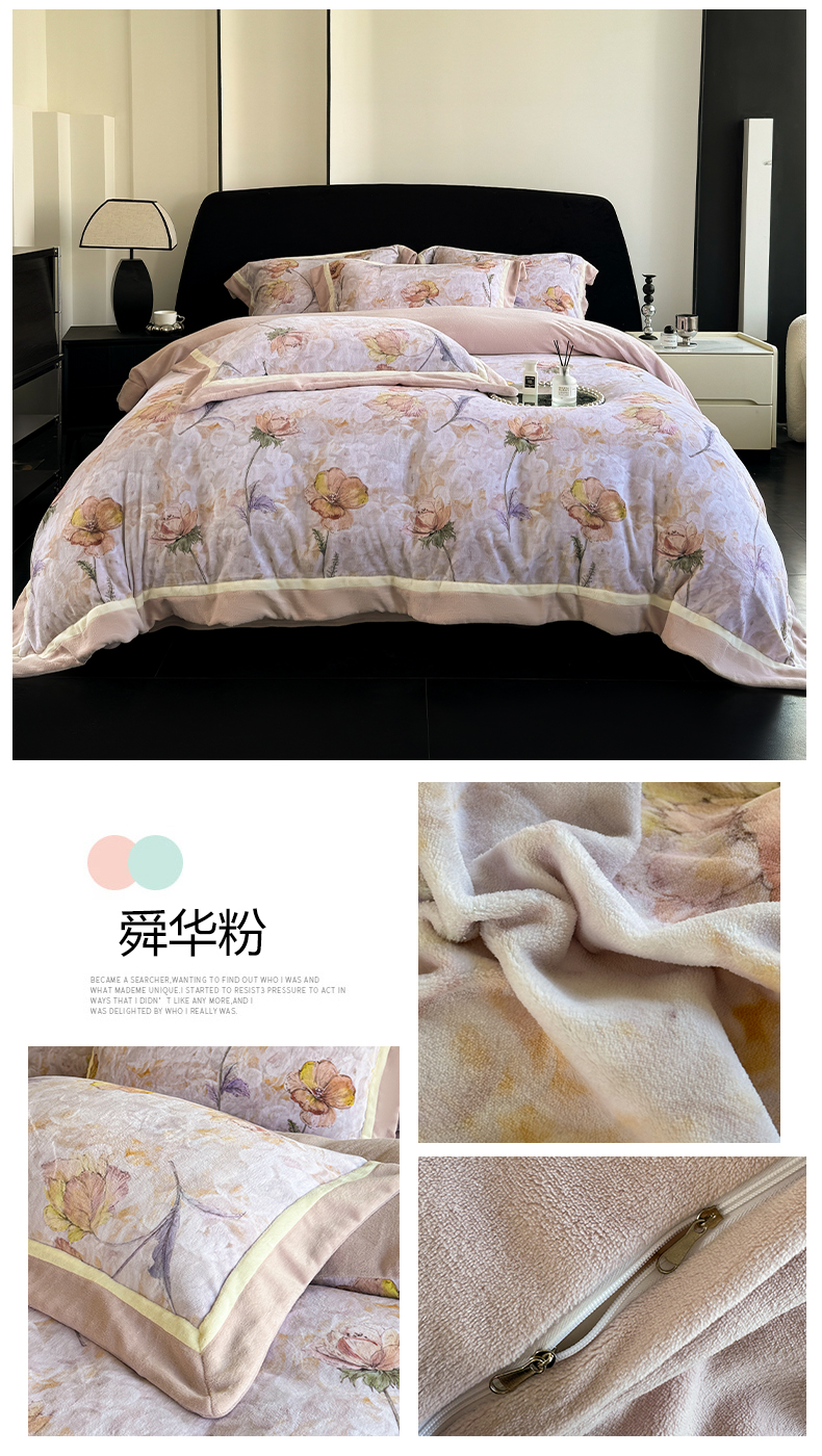 商品名称:娇逸家居 2025新款高克重A类数码印花牛奶绒双拼边款四件套 芸芙