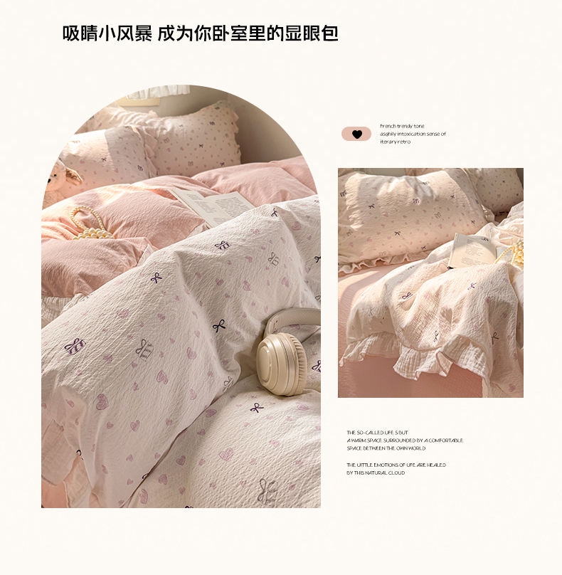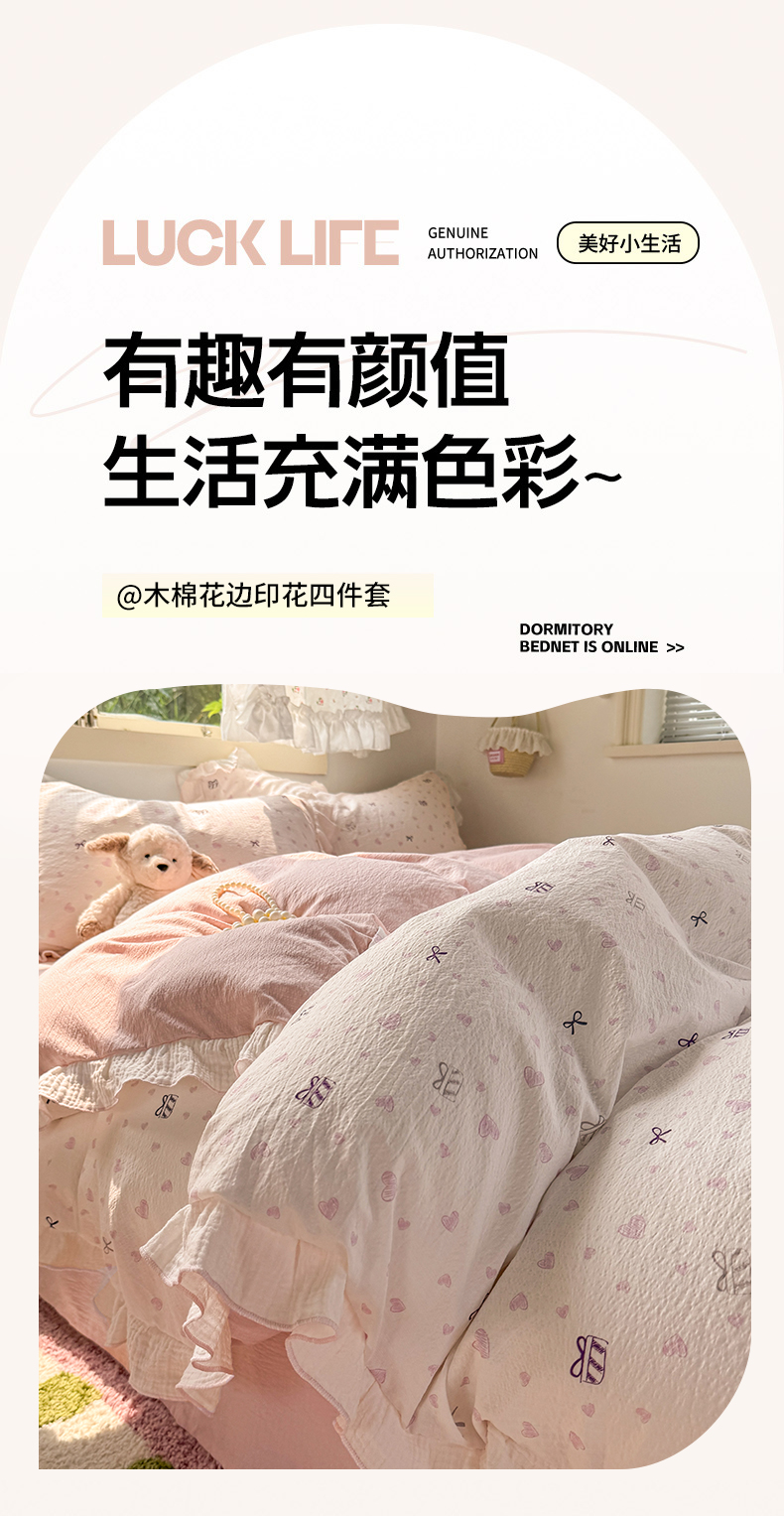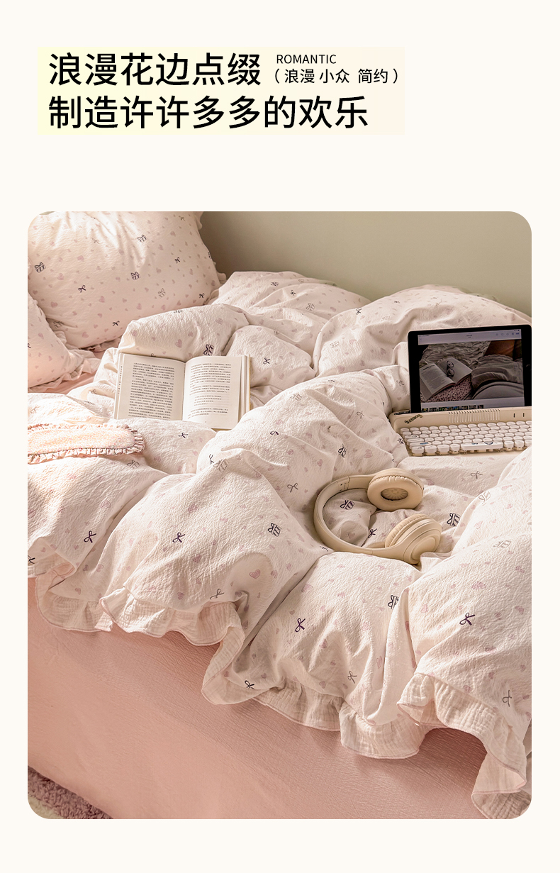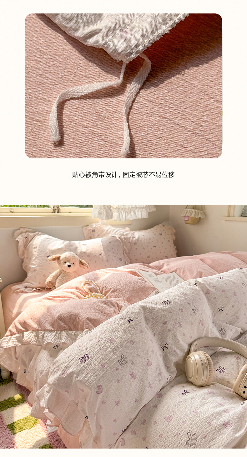 当前位置: 91家纺网 > 商品网购 > 床品套件 > 四件套 > 其它四件套 > 繁花家居 2025新款高弹线云感木棉多层纱花边超软四件套 蝴蝶结爱心