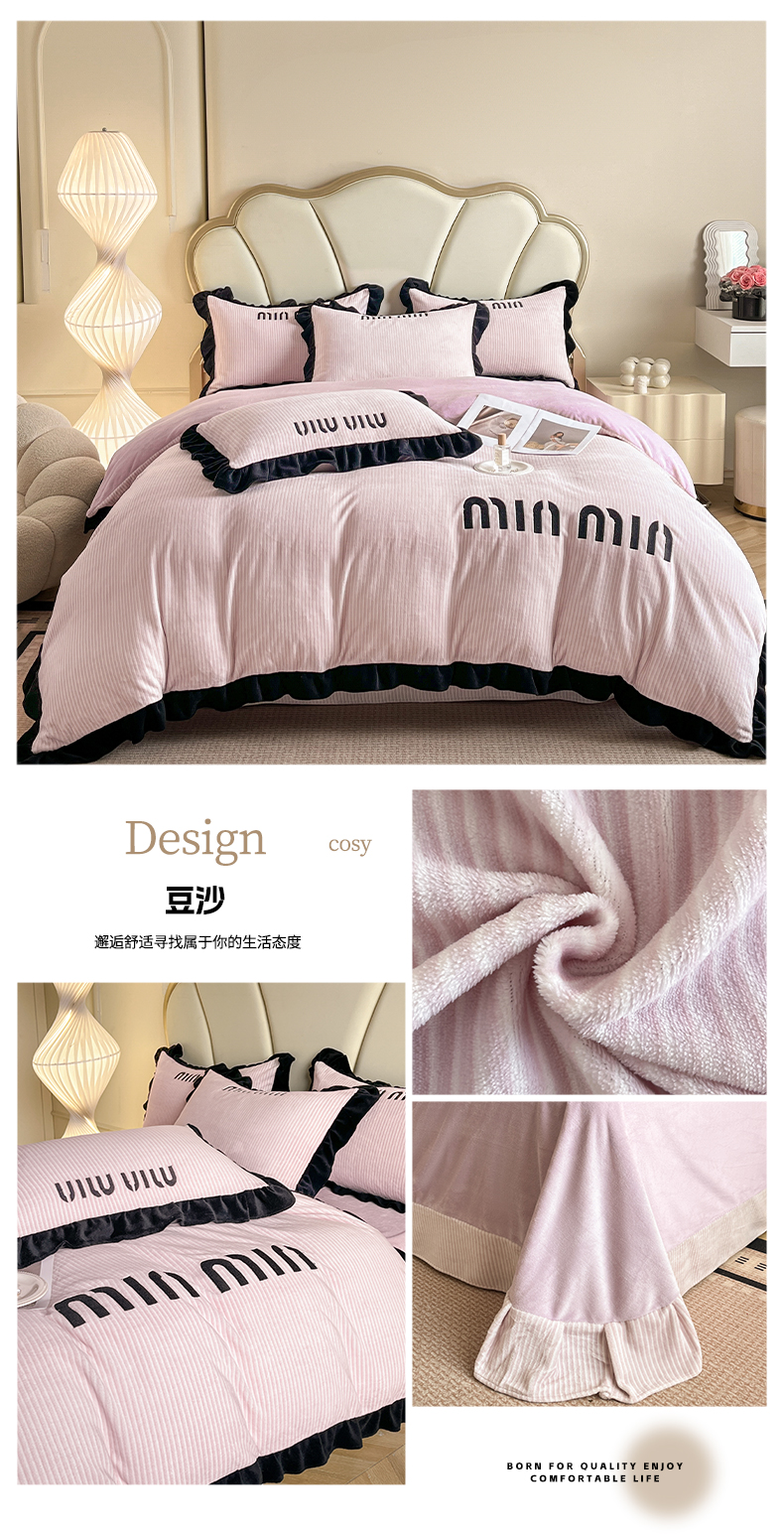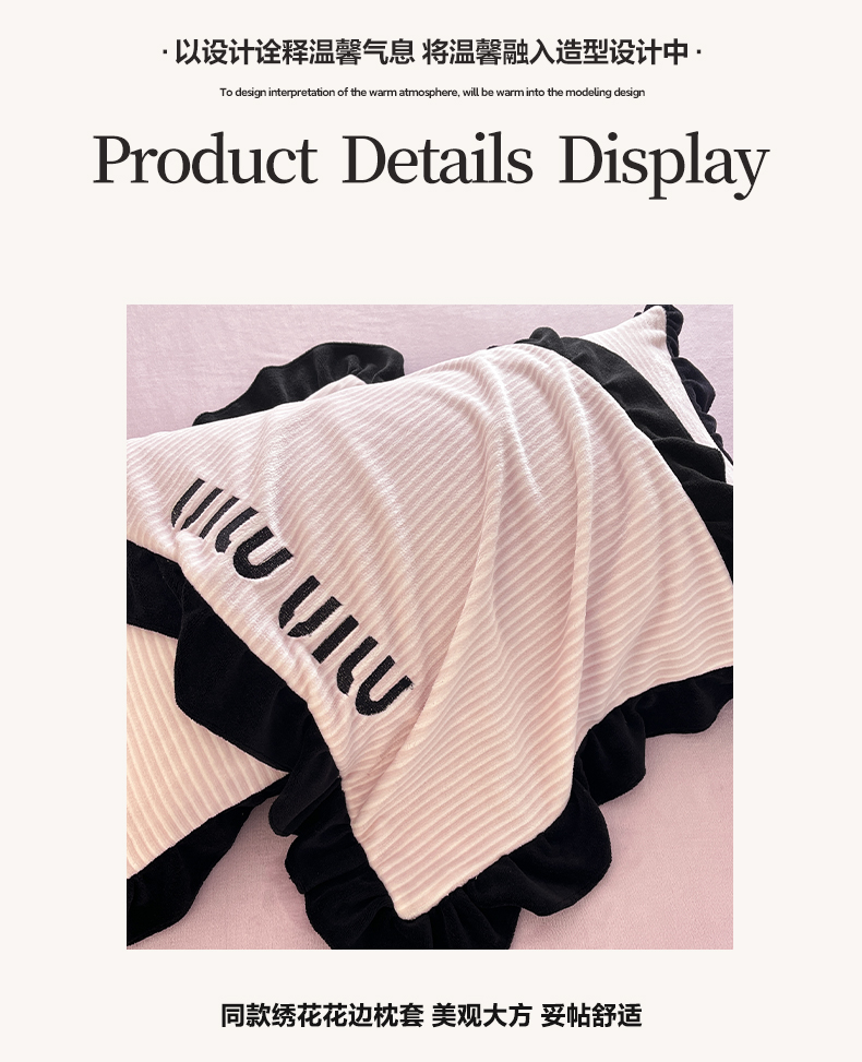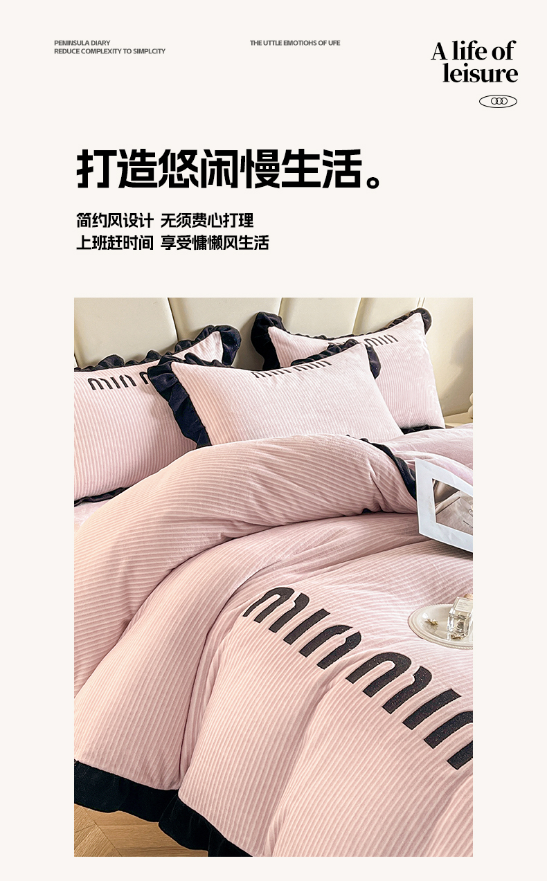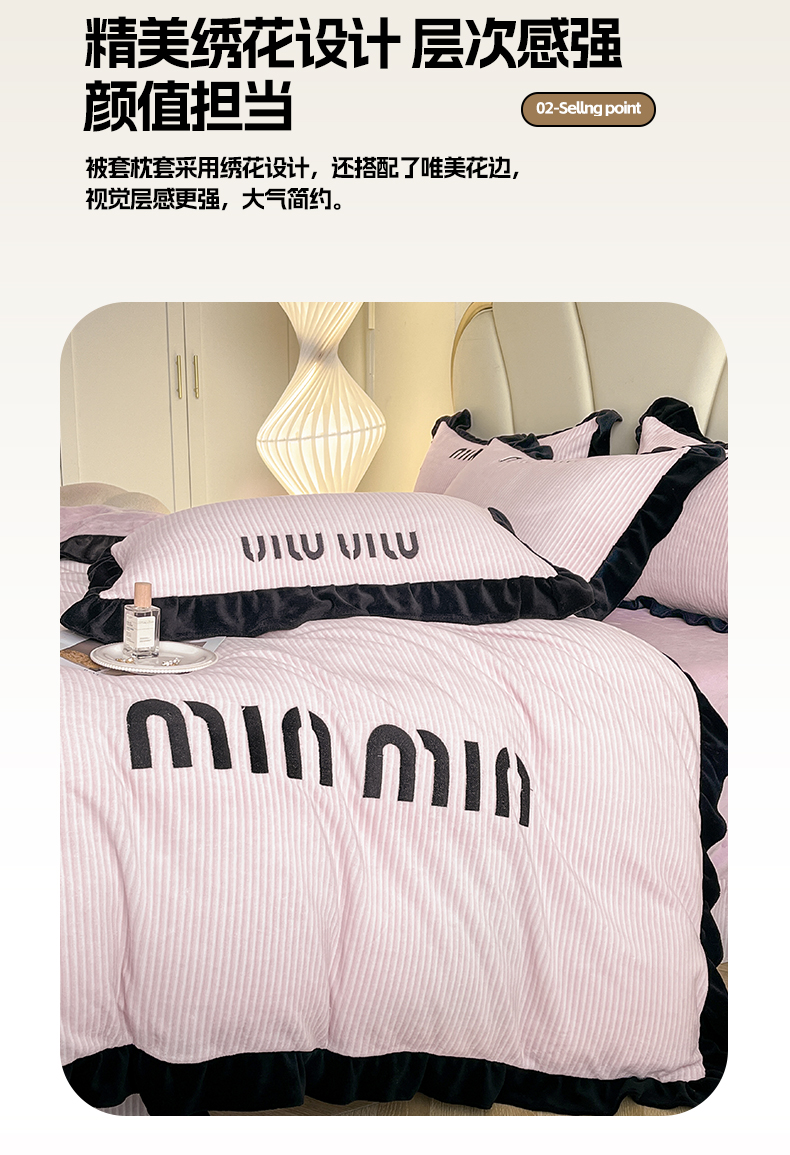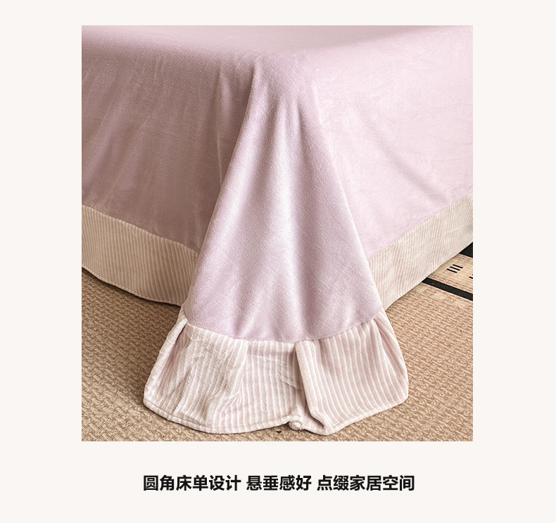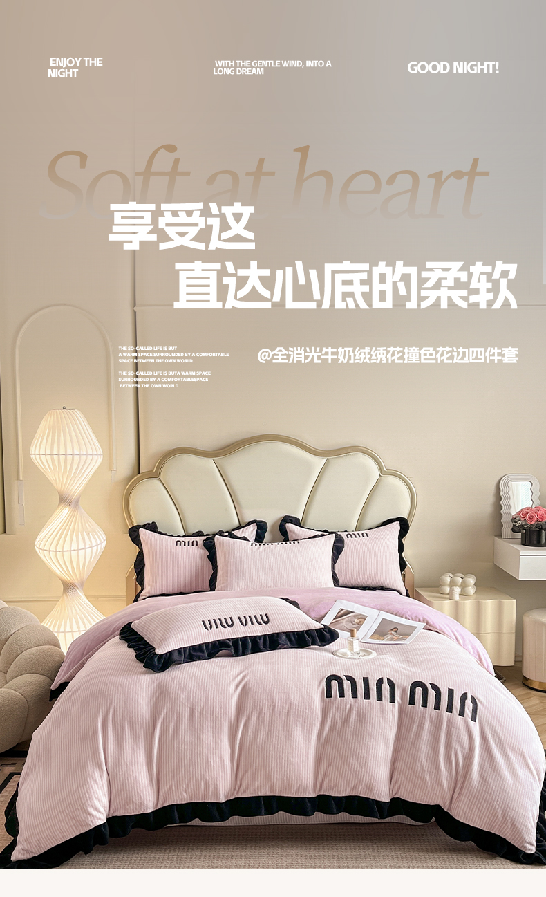 商品名称:(总)博纳 2025新款210克全消光牛奶绒绣花撞色花边吊边床单四件套-遇见