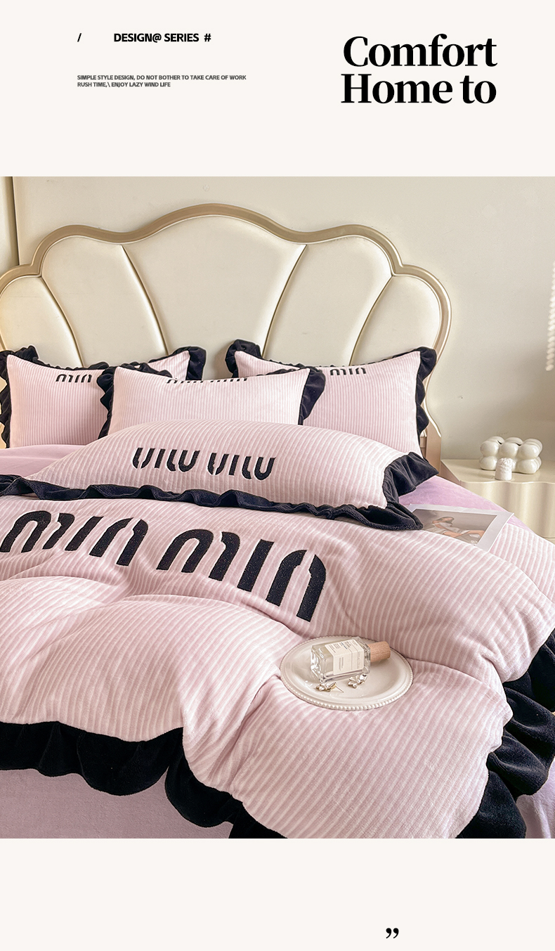 (总)博纳 2025新款210克全消光牛奶绒绣花撞色花边吊边床单四件套-遇见